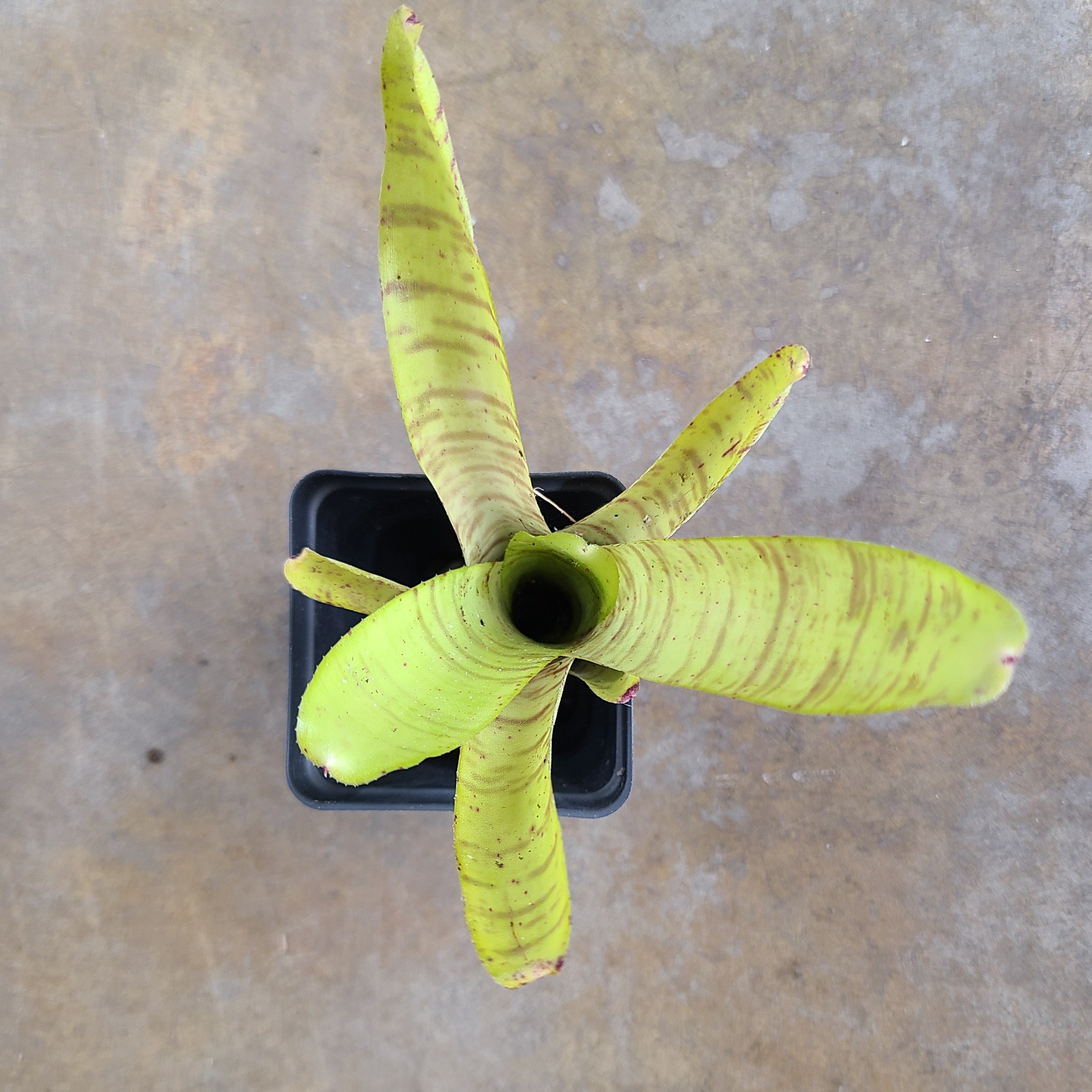 Neoregelia crispata is a small-sized bromeliad that is perfect for a 10 to 20 gallon, 18x18x18 or 18x18x24 . These can be used in smaller enclosures as well. This bromeliad is green-yellow with slightly bronzed reverse banding. It has a moderately tight-forming cup. Bright light increases coloration. Bromeliads you obtain may be slightly duller than picture due to lower light conditions. Bromeliads are epiphytic and will send roots out in order to attach to other plants, rocks, or backgrounds. Bromeliads also hold water in their leaves, providing deposition sites for tadpoles. For this reason, we do not recommend planting this Bromeliad in the substrate; if they are watered from the bottom and top, the core can rot. Many dart frogs, especially Oophaga, rely on these plants (and film canisters in captivity) for breeding. Bromeliads form pups from the mature plant and will clump together. Please add fresh water to your bromeliads at least weekly, and allow them adequate ventilation. If you do not have ventilation, we do not recommend keeping them fully filled with water.