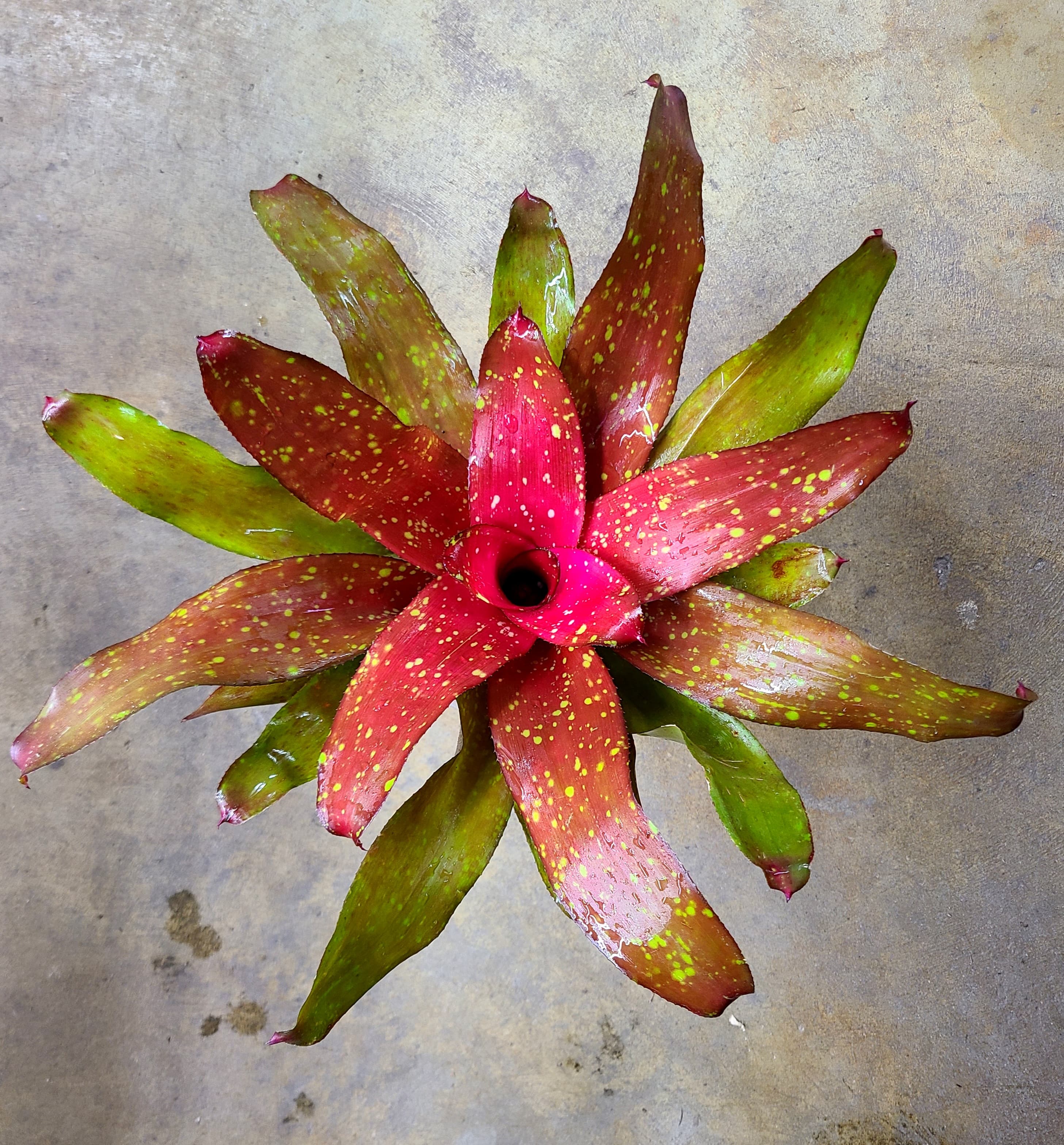 Neoregelia Treasure Chest is a medium to large-sized bromeliad that is perfect for a centerpiece in an 18x24 or 24x24 vivarium. They get about 16-18 inches in diameter, but can be successfully worked into 18x24 enclosures. This bromeliad has an intense red center with neon green speckling...a sight to behold! Color upon receipt may be slightly duller due to growing in lower light conditions. Bromeliads are epiphytic and will send roots out in order to attach to other plants, rocks, or backgrounds. Bromeliads also hold water in their leaves, providing deposition sites for tadpoles. For this reason, we do not recommend planting this Bromeliad in the substrate; if they are watered from the bottom and top, the core can rot. Many dart frogs, especially Oophaga, rely on these plants (and film canisters in captivity) for breeding. Bromeliads form pups from the mature plant and will clump together. Please add fresh water to your bromeliads at least weekly, and allow them adequate ventilation. If you do not have ventilation, we do not recommend keeping them fully filled with water.
