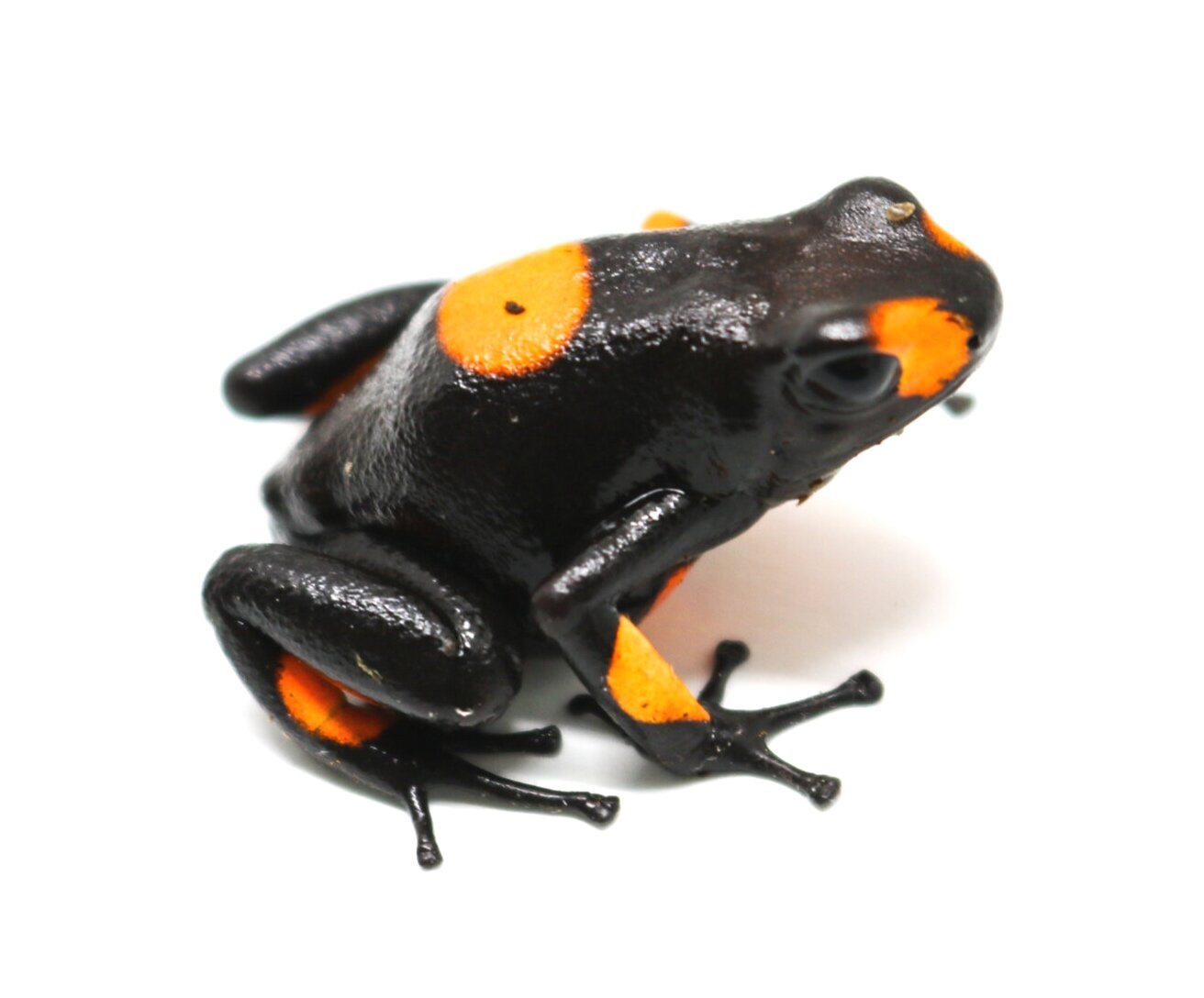 Oophaga histrionica “Bullseye” are found in Columbia. These frogs have brilliant orange spots blotched on a black background. These are large obligate egg feeding frogs. These frogs feed their young with infertile eggs after depositing them in bromeliad axils. Large obligates are best kept in pairs in a minimum terrarium size of 24 x 24 / 18 x 36, but appreciate larger enclosures. These frogs can be difficult to breed, so have patience. The females generally lay clutches of 2-10, and tadpoles can take 120 days or more to morph into froglets, but generally take around 90 days. Pairs usually produce 4-6 offspring per year. Additional information can be found, of course, through our complimentary Encyclopedia Database: DendroKnow Project.