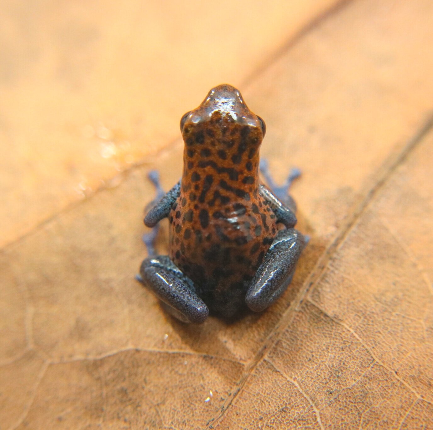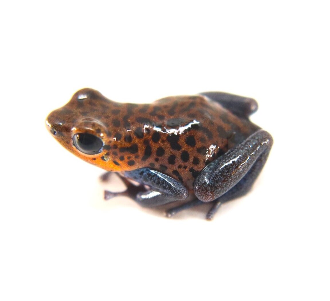 Oophaga pumilio "Charco la Pava" is a beautiful pumilio that often has orange to red speckled body coloration with bright blue legs. They do fine in small groups, but do best as a pair or trio when sexual maturity is reached. The males often have control of 1 to 5 square meters of territory in the wild, so rival males may display aggression for supremacy. They usually lay 3 to 10 eggs on glossy leaves, on glass, or sometimes in leaf litter. Tadpoles must be raised by adults because they feed on infertile eggs from the female. These dart frogs are interesting to many hobbyists because they exhibit biparental care. No more than a trio should go in a 20 gallon vertical conversion tank or a 18 x 24 Exo-terra enclosure. Additional information can be found, of course, through our complimentary Encyclopedia Database: DendroKnow Project.