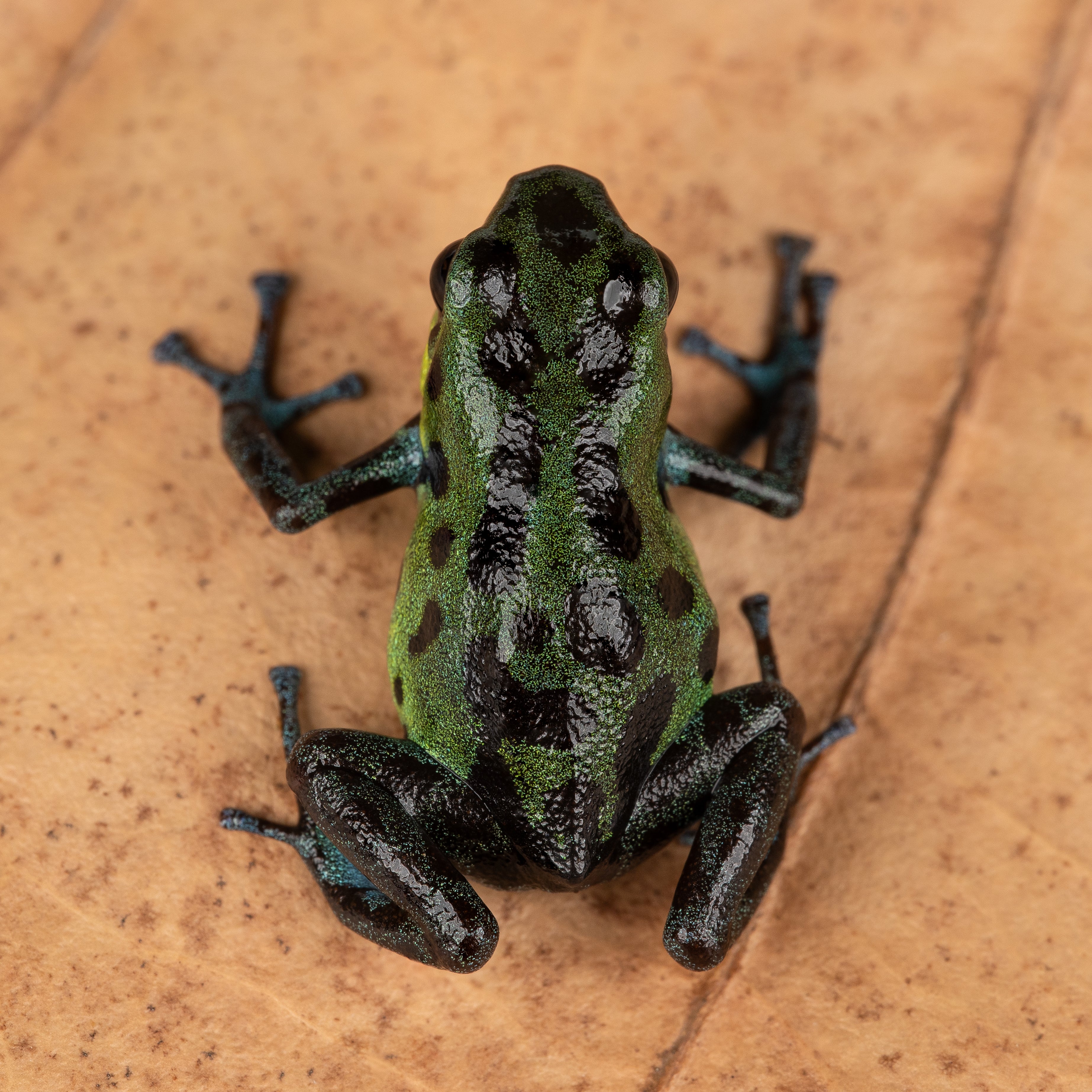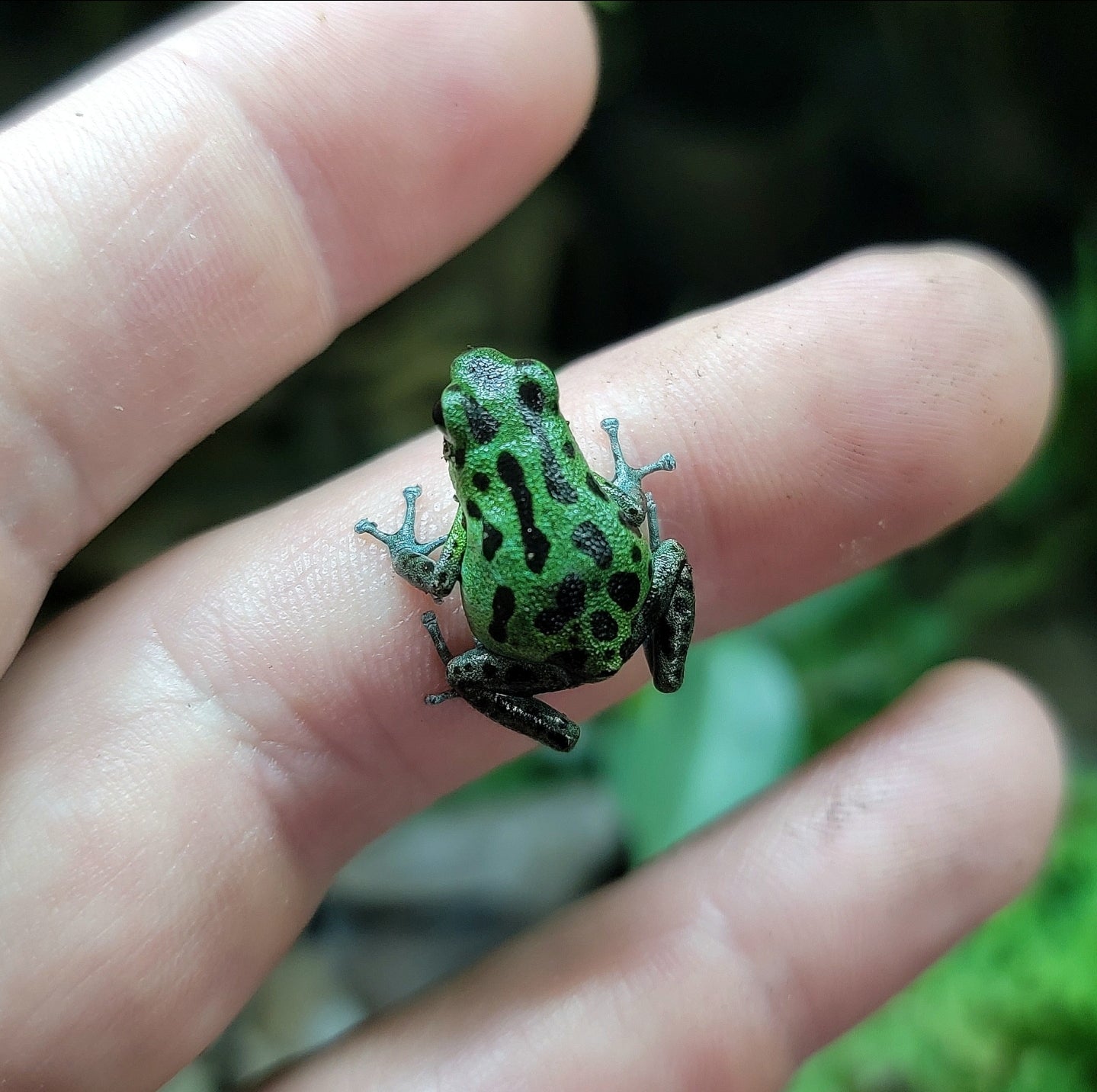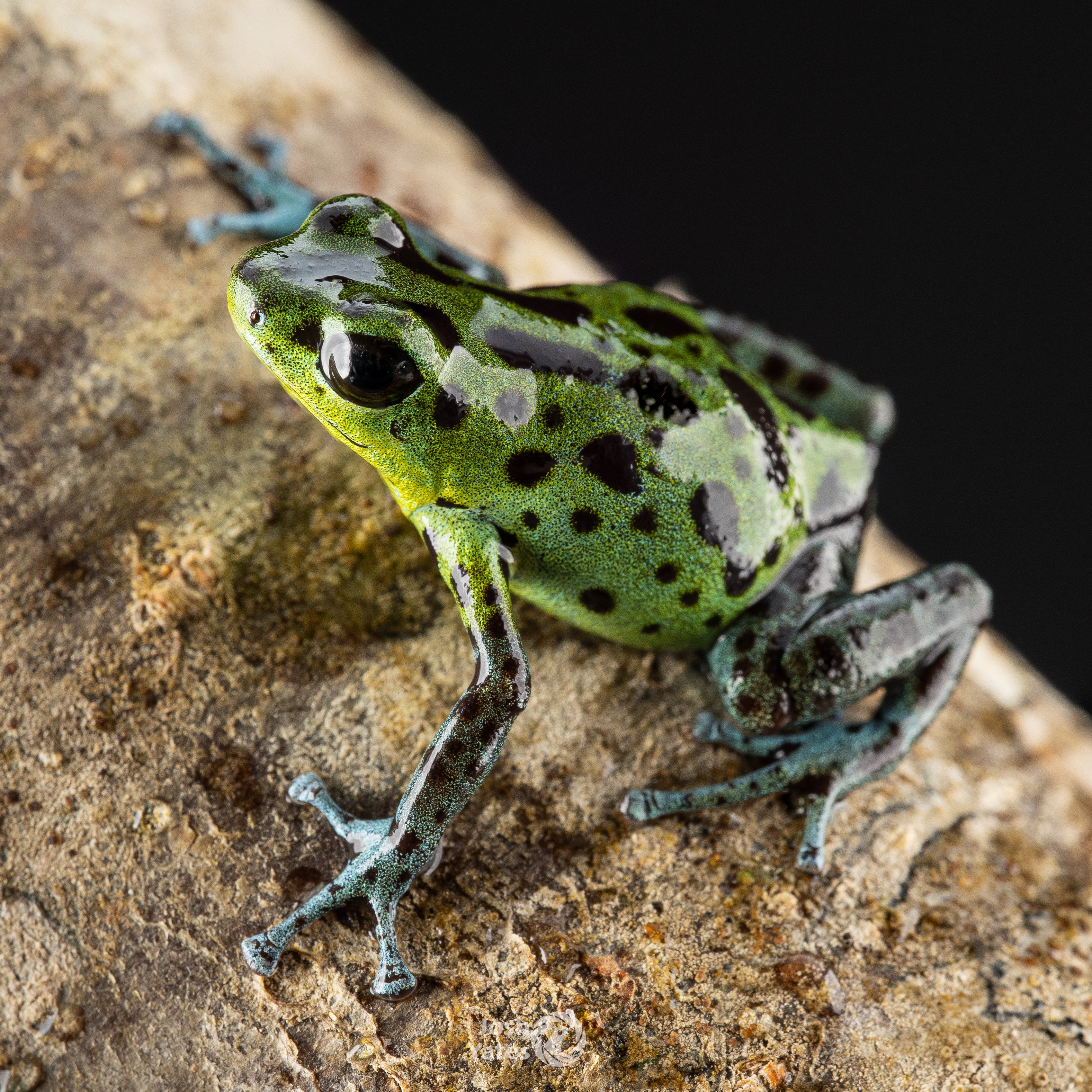 Oophaga pumilio "Chiriqui Grande" is a small poison dart frog that is green with silvery-blue legs. They do fine in small groups, but do best as a pair or trio when sexual maturity is reached. The males often have control of 1 to 5 square meters of territory in the wild, so rival males may display aggression for supremacy. They usually lay 3 to 10 eggs on glossy leaves, on glass, or sometimes in leaf litter. Tadpoles must be raised by adults because they feed on infertile eggs from the female. These dart frogs are interesting to many hobbyists because they exhibit biparental care. No more than a trio should go in a 20 gallon vertical conversion tank or a 18 x 24 Exo-terra enclosure. Additional information can be found, of course, through our complimentary Encyclopedia Database: DendroKnow Project.