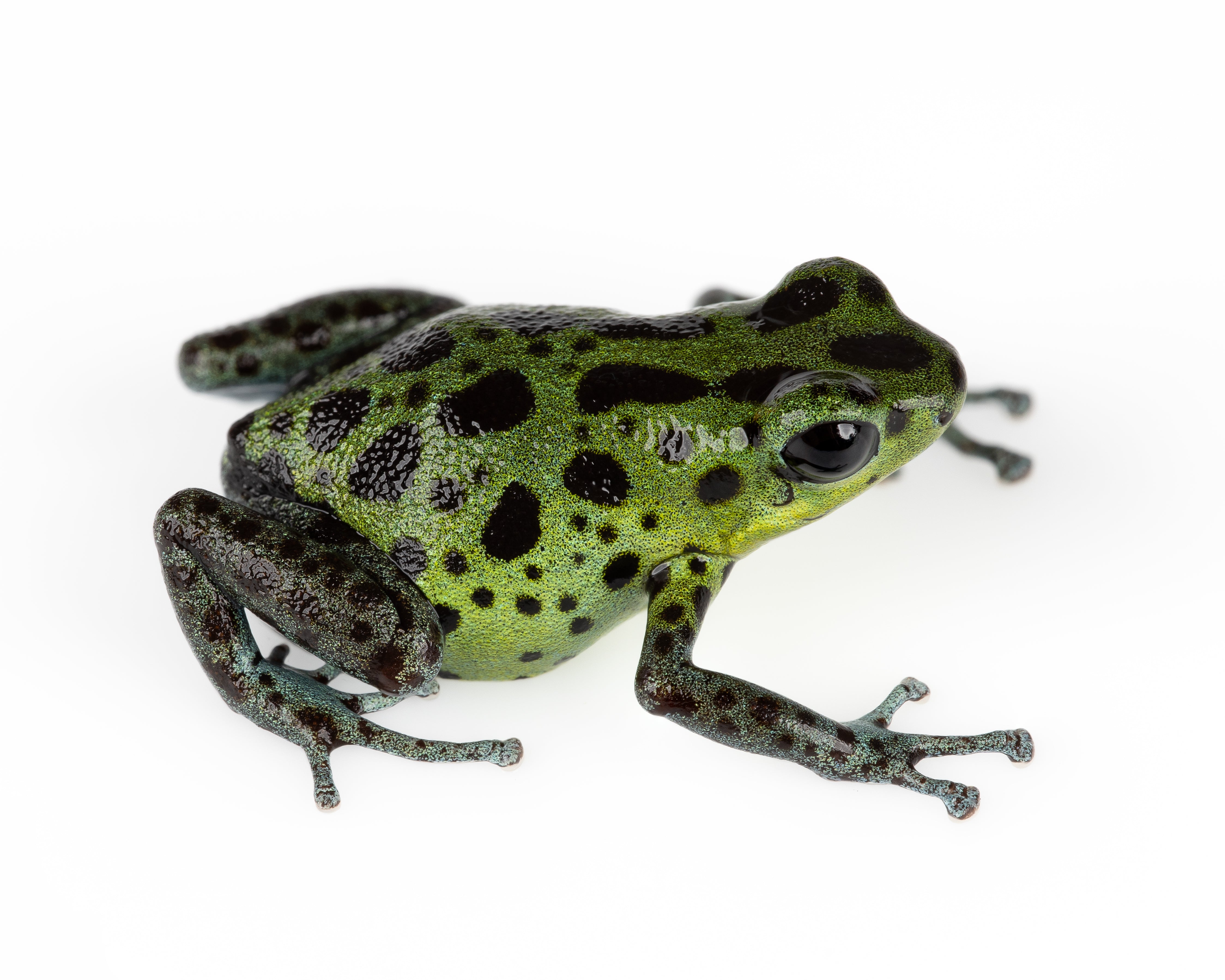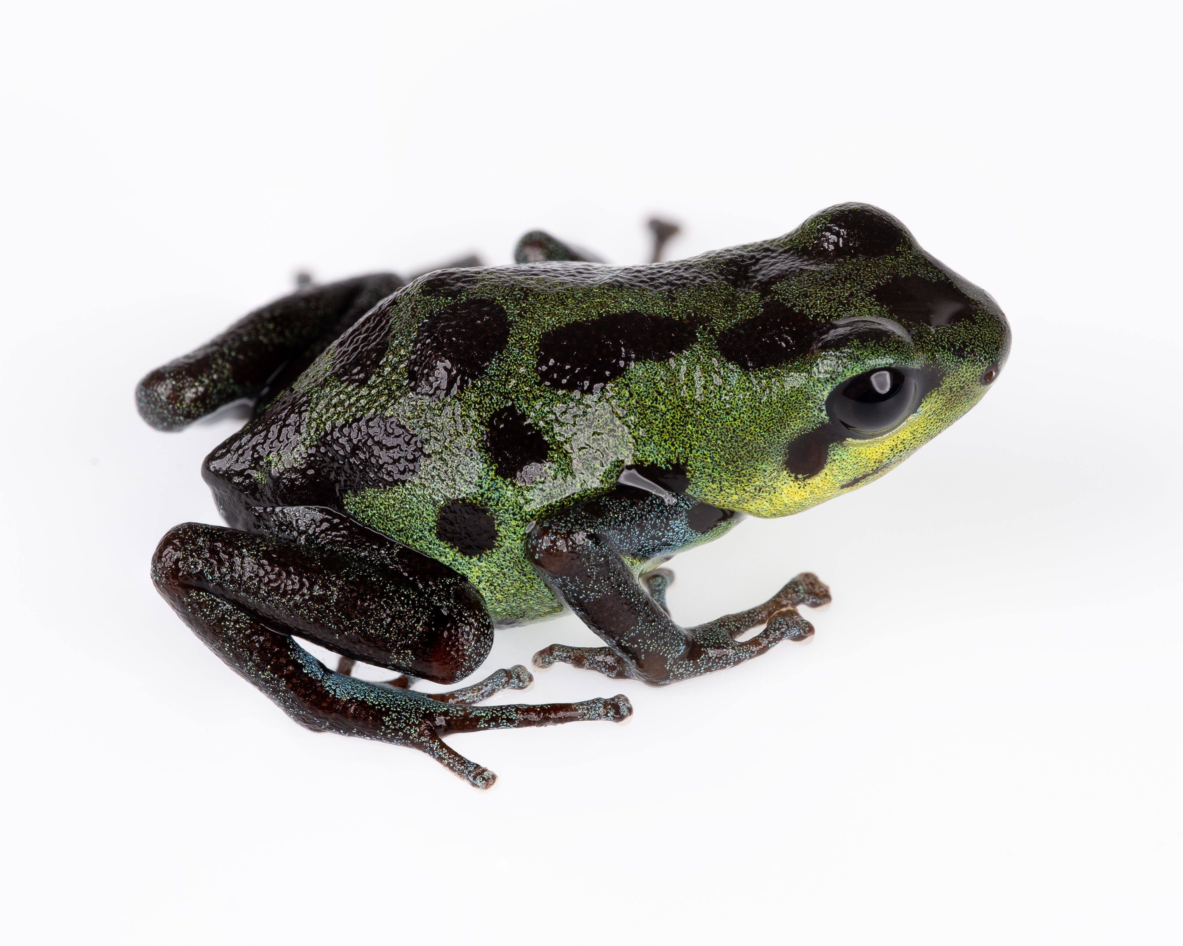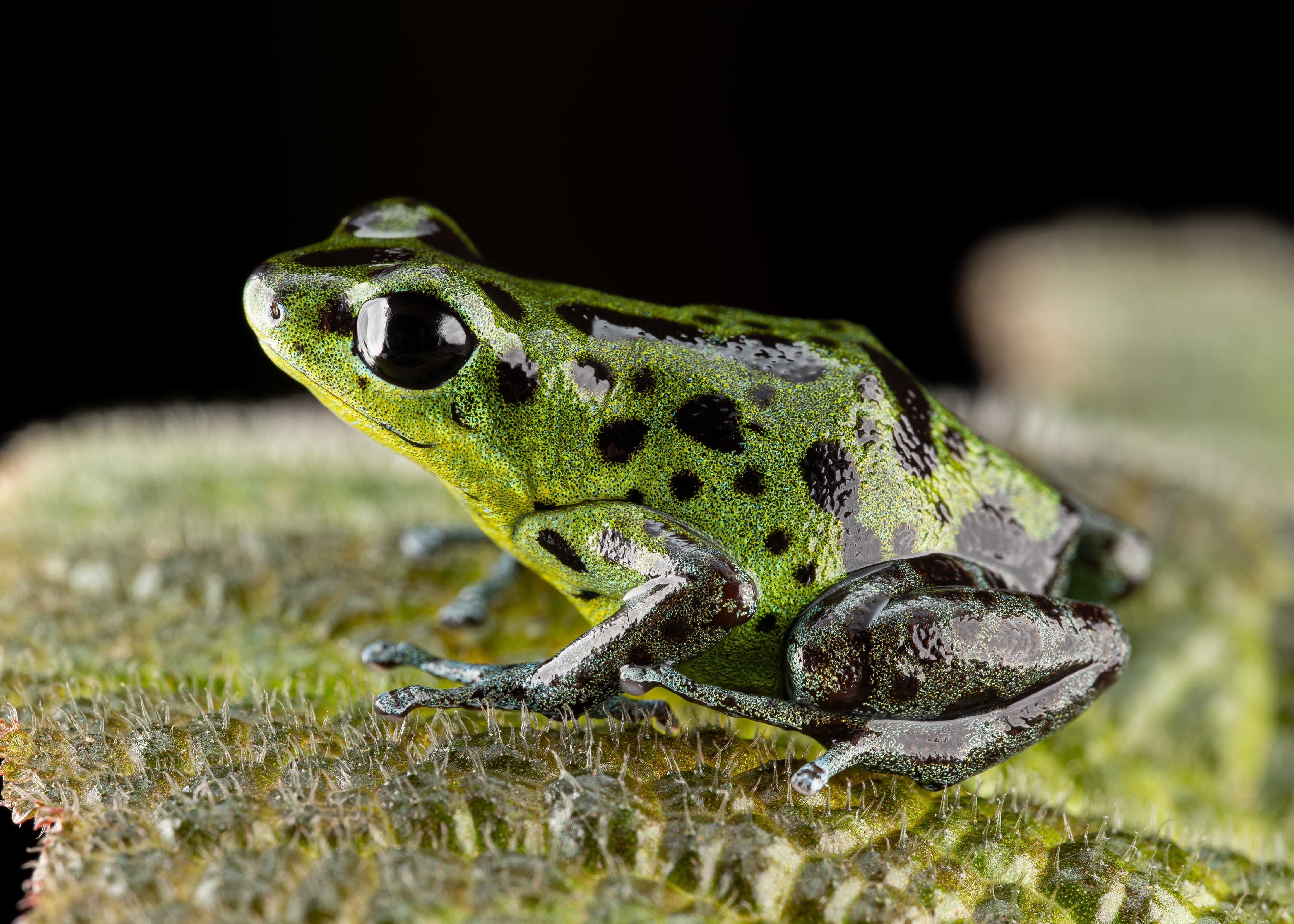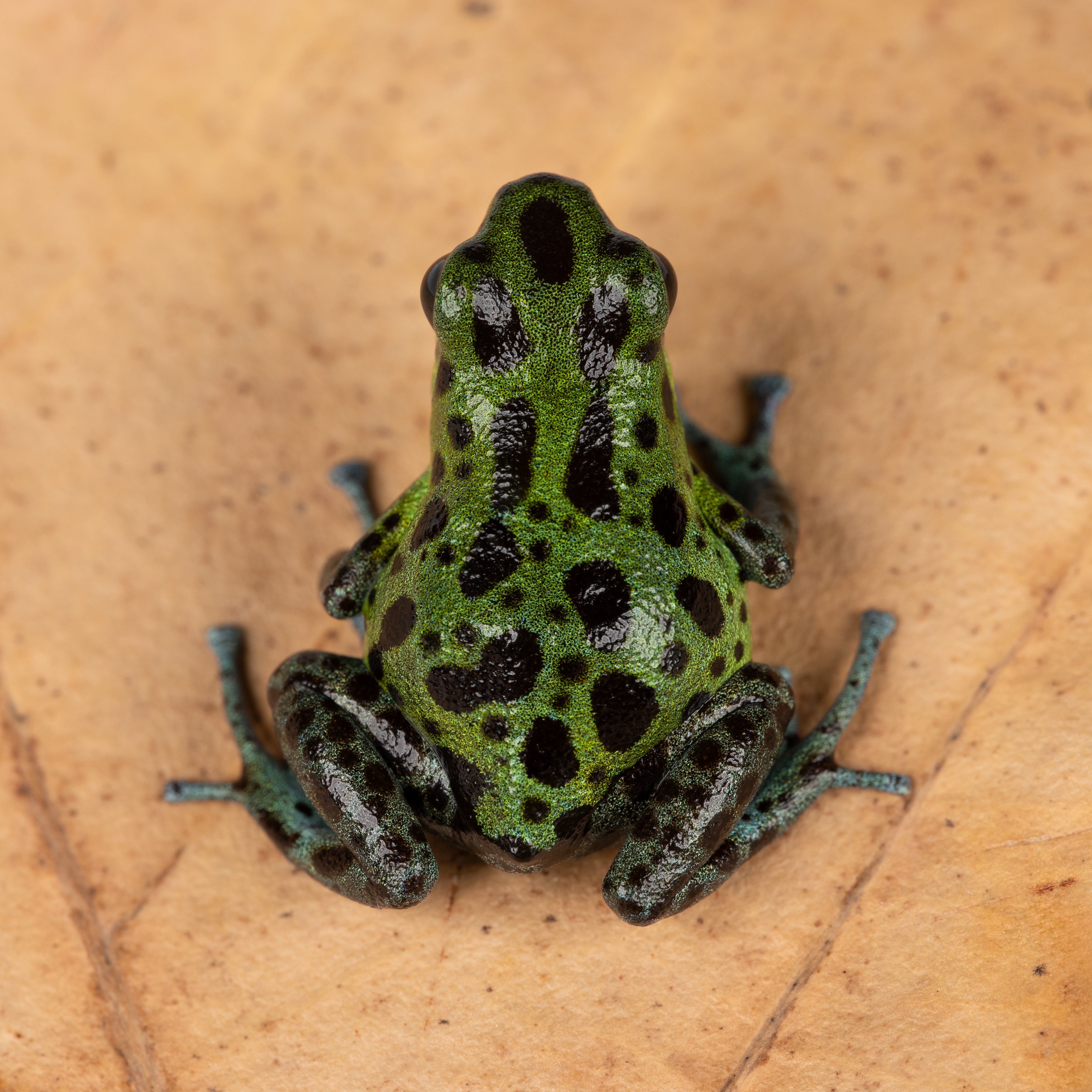 Oophaga pumilio "Chiriqui Grande" is a small poison dart frog that is green with silvery-blue legs. They do fine in small groups, but do best as a pair or trio when sexual maturity is reached. The males often have control of 1 to 5 square meters of territory in the wild, so rival males may display aggression for supremacy. They usually lay 3 to 10 eggs on glossy leaves, on glass, or sometimes in leaf litter. Tadpoles must be raised by adults because they feed on infertile eggs from the female. These dart frogs are interesting to many hobbyists because they exhibit biparental care. No more than a trio should go in a 20 gallon vertical conversion tank or a 18 x 24 Exo-terra enclosure. Additional information can be found, of course, through our complimentary Encyclopedia Database: DendroKnow Project.