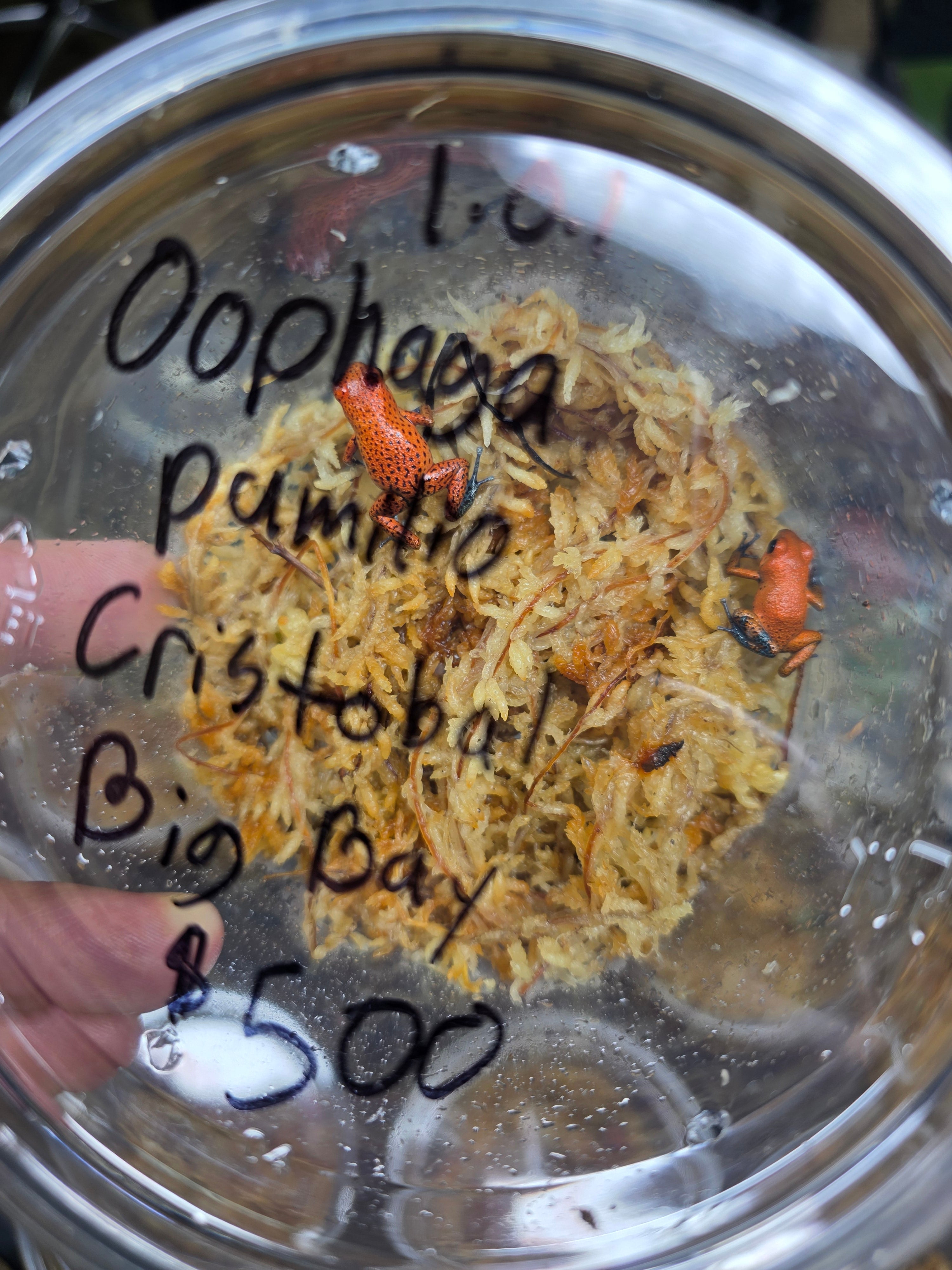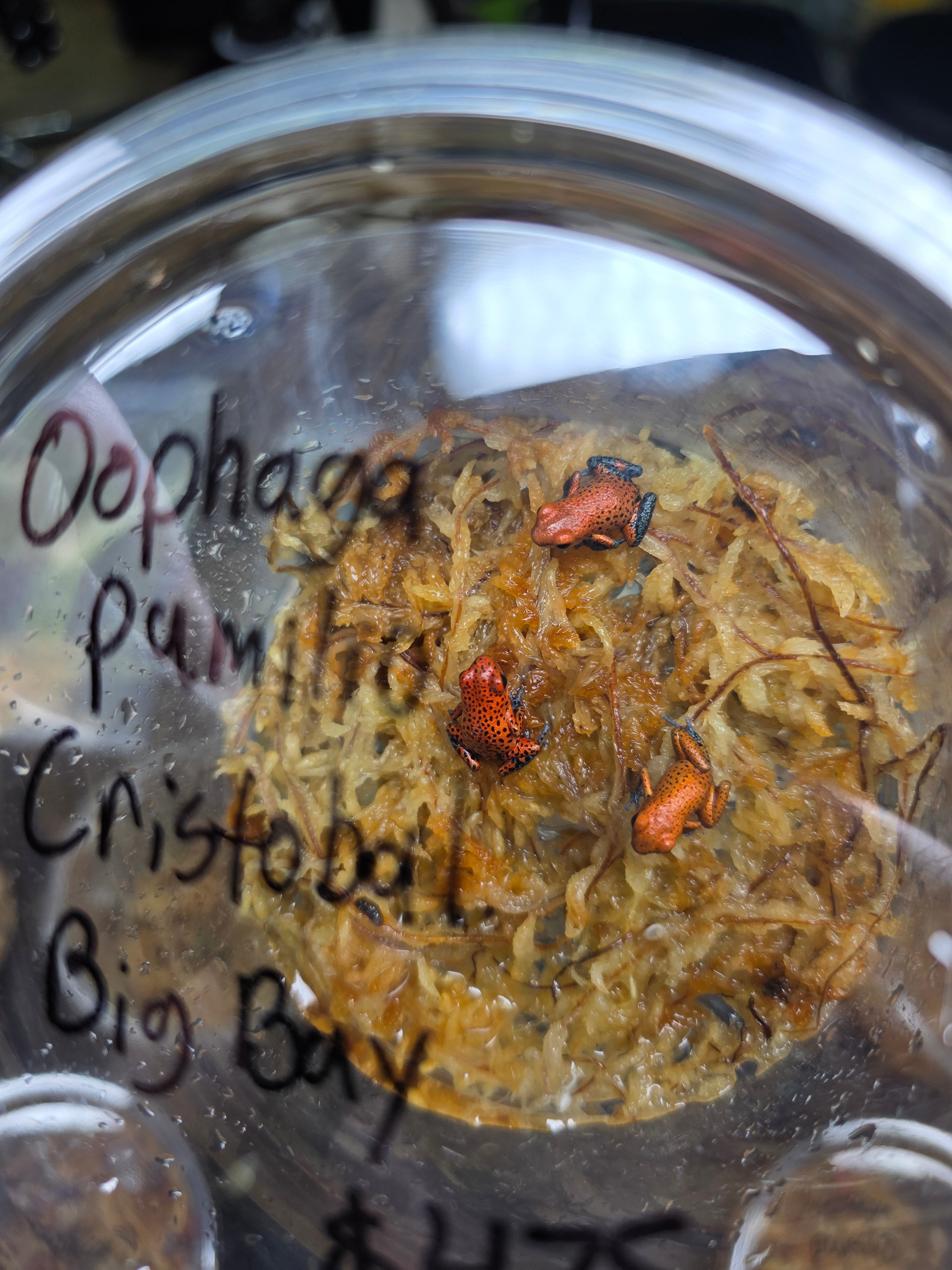 Oophaga pumilio "Cristobal" locale is restricted to the island of Cristobal in the Bocas del Torro providence. They have wonderful orange to red coloration. They do fine in small groups, but do best as a pair or trio when sexual maturity is reached. The males often have control of 1 to 5 square meters of territory in the wild, so rival males may display aggression for supremacy. They usually lay 3 to 10 eggs on glossy leaves, on glass, or sometimes in leaf litter. Tadpoles must be raised by adults because they feed on infertile eggs from the female. These dart frogs are interesting to many hobbyists because they exhibit biparental care. No more than a trio should go in a 20 gallon vertical conversion tank or a 18 x 24 Exo-terra enclosure. Additional information can be found, of course, through our complimentary Encyclopedia Database: DendroKnow Project.