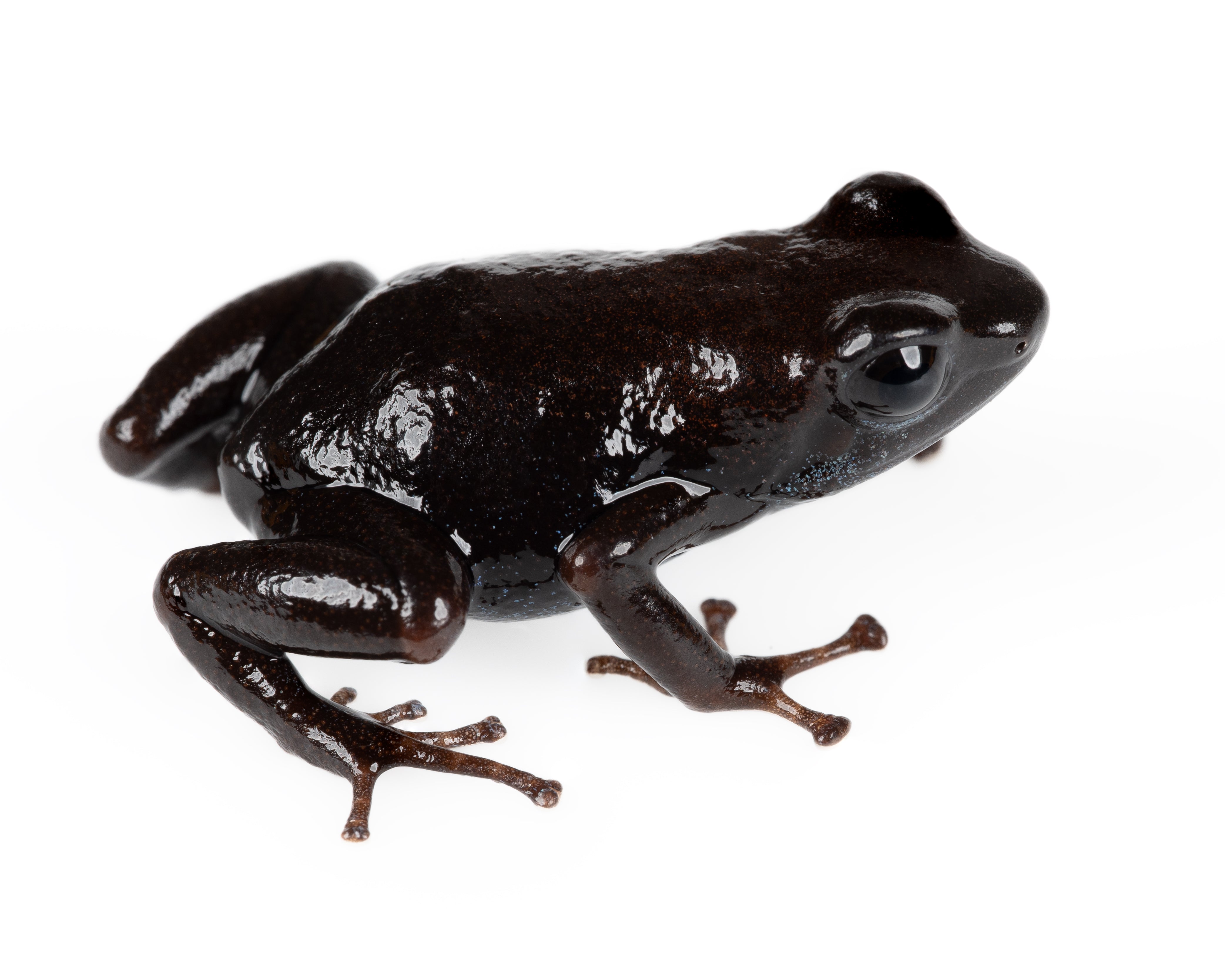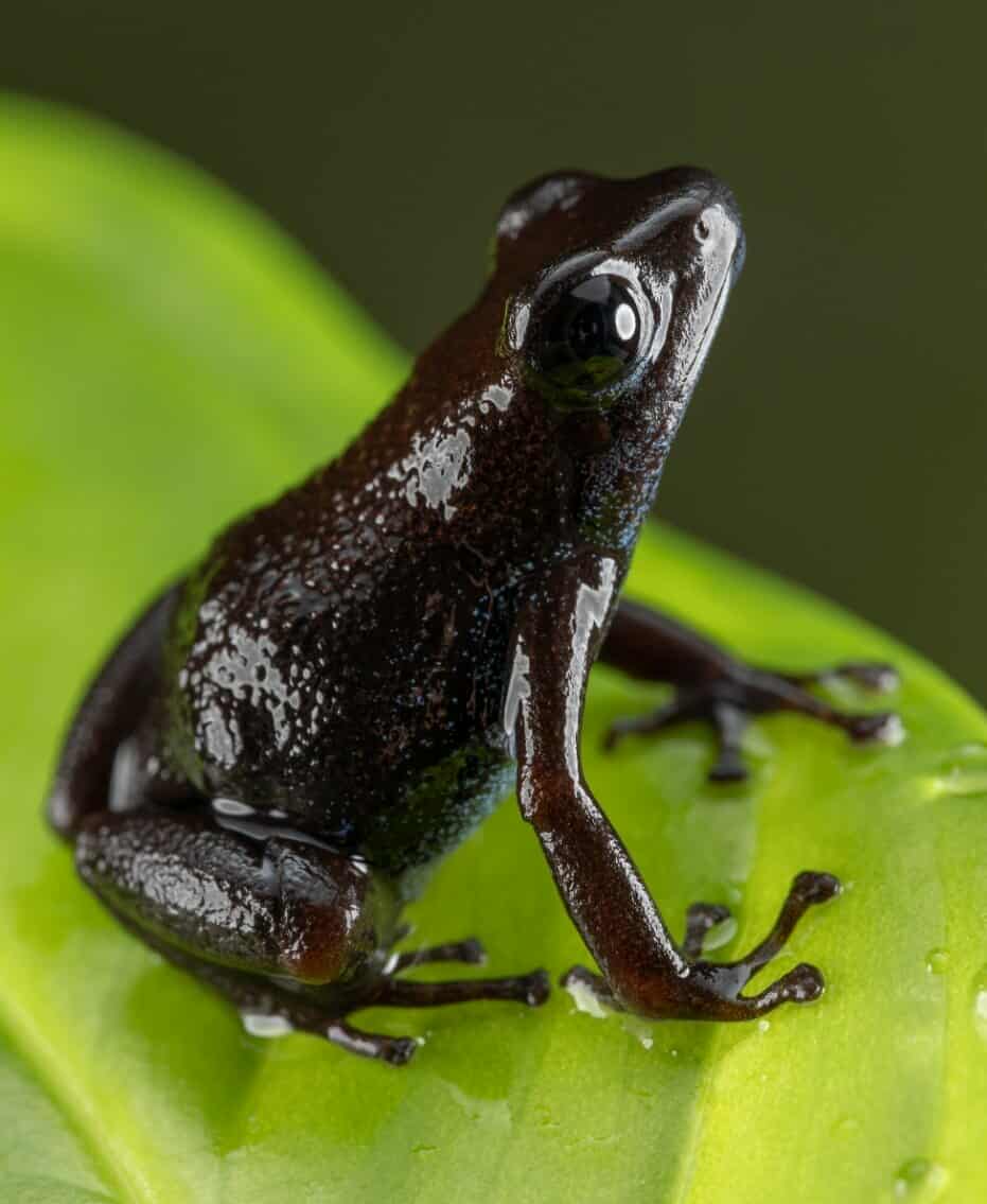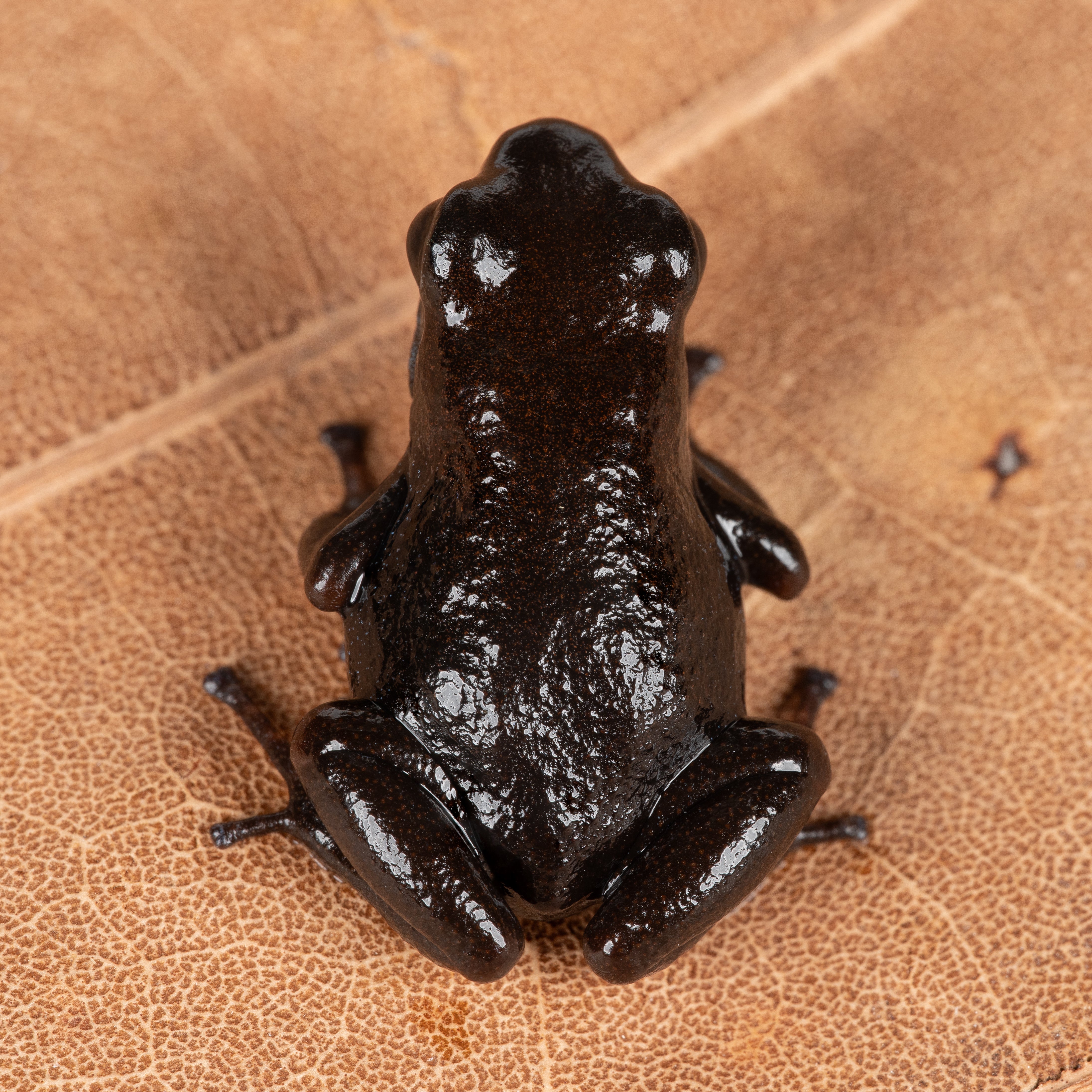 Oophaga pumilio "Darklands" is a small poison dart frog that is very dark navy blue with purple hues. They are exceptionally rare. Ours has thrown albinos. They do fine in small groups, but do best as a pair or trio when sexual maturity is reached. The males often have control of 1 to 5 square meters of territory in the wild, so rival males may display aggression for supremacy. They usually lay 3 to 10 eggs on glossy leaves, on glass, or sometimes in leaf litter. Tadpoles must be raised by adults because they feed on infertile eggs from the female. These dart frogs are interesting to many hobbyists because they exhibit biparental care. No more than a trio should go in a 20 gallon vertical conversion tank or a 18 x 24 Exo-terra enclosure. Additional information can be found, of course, through our complimentary Encyclopedia Database: DendroKnow Project.