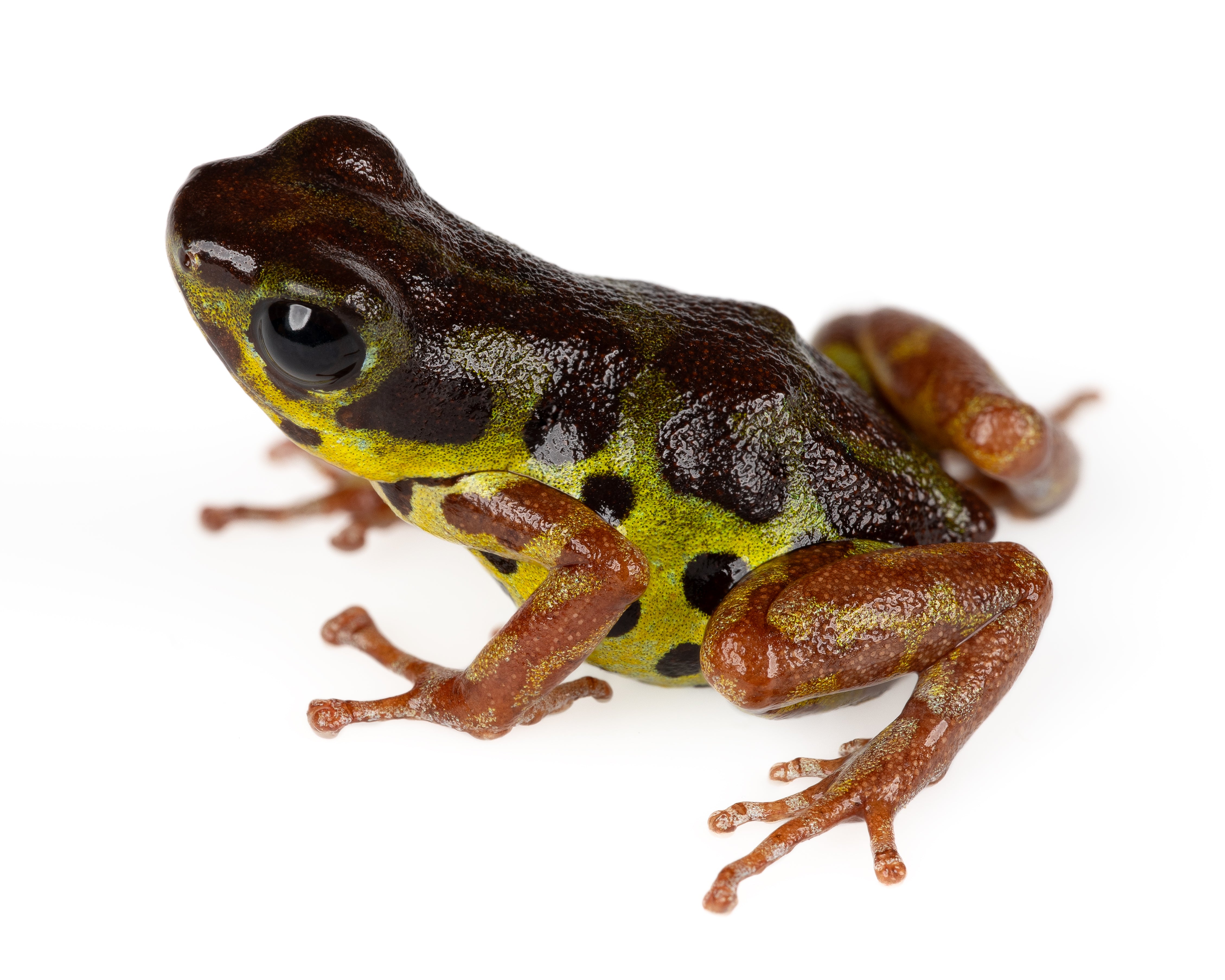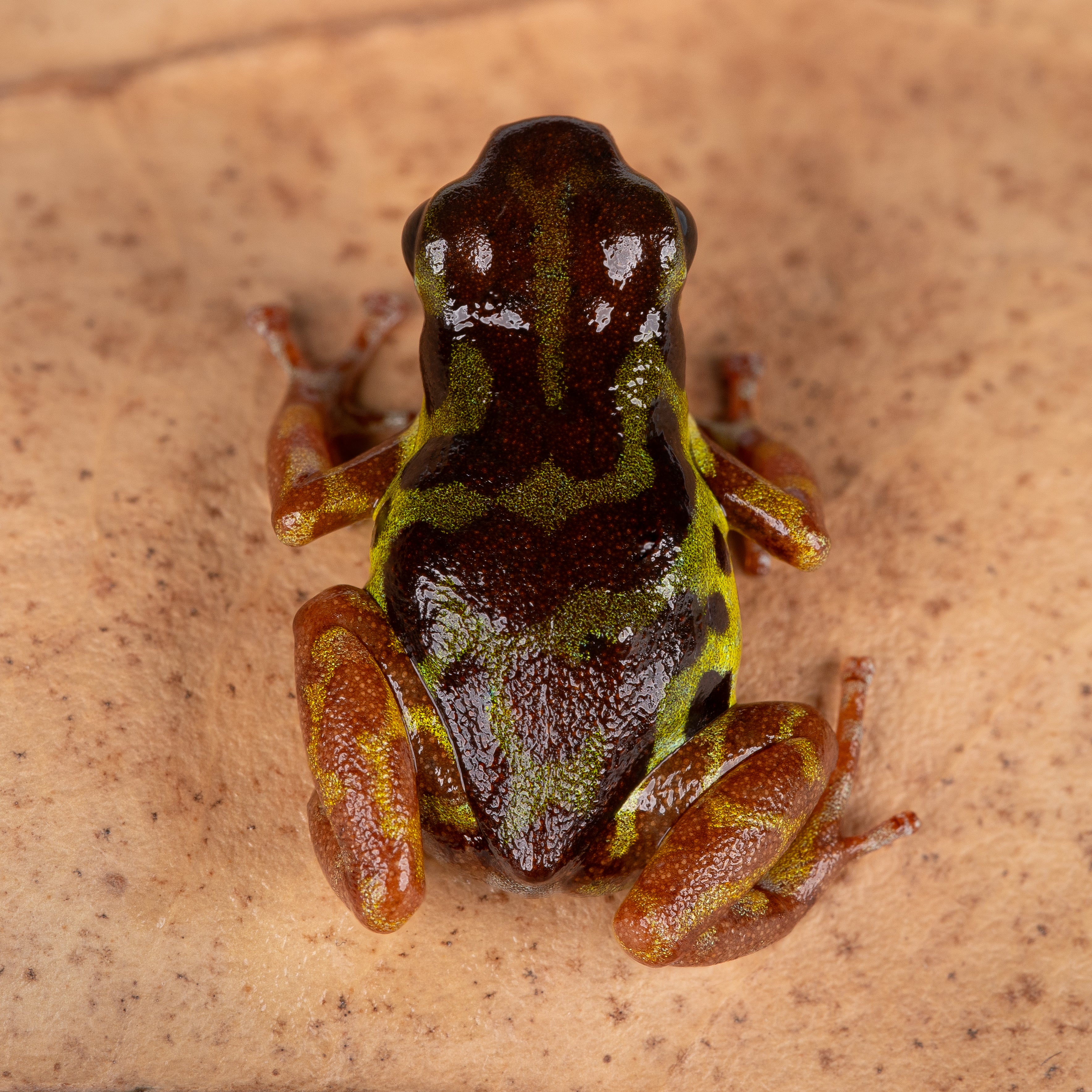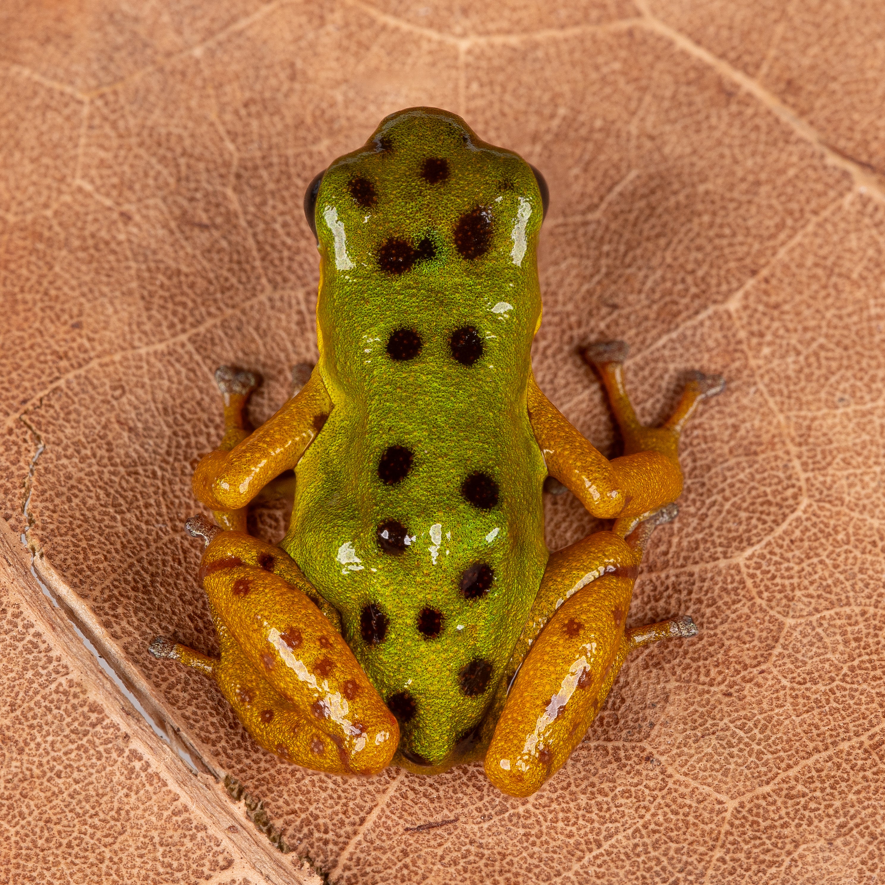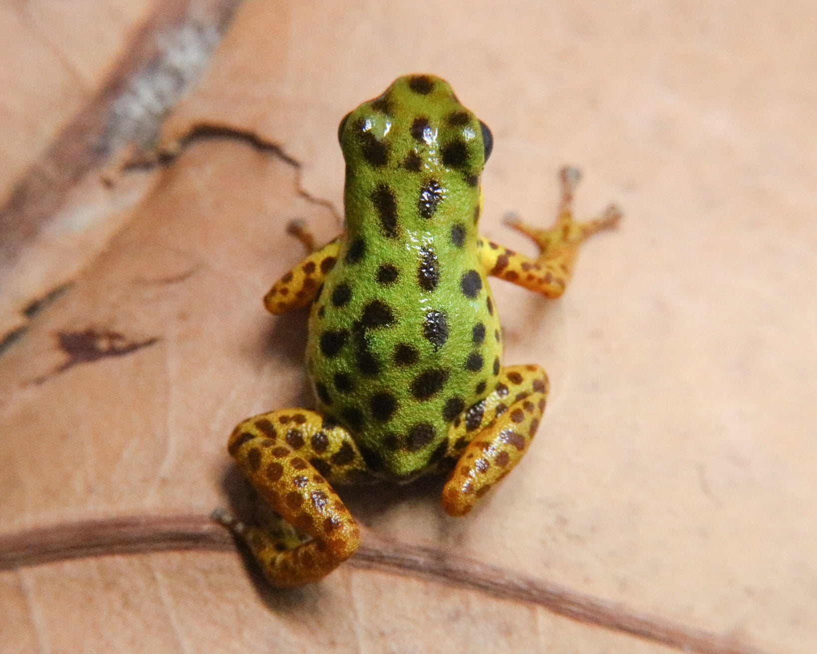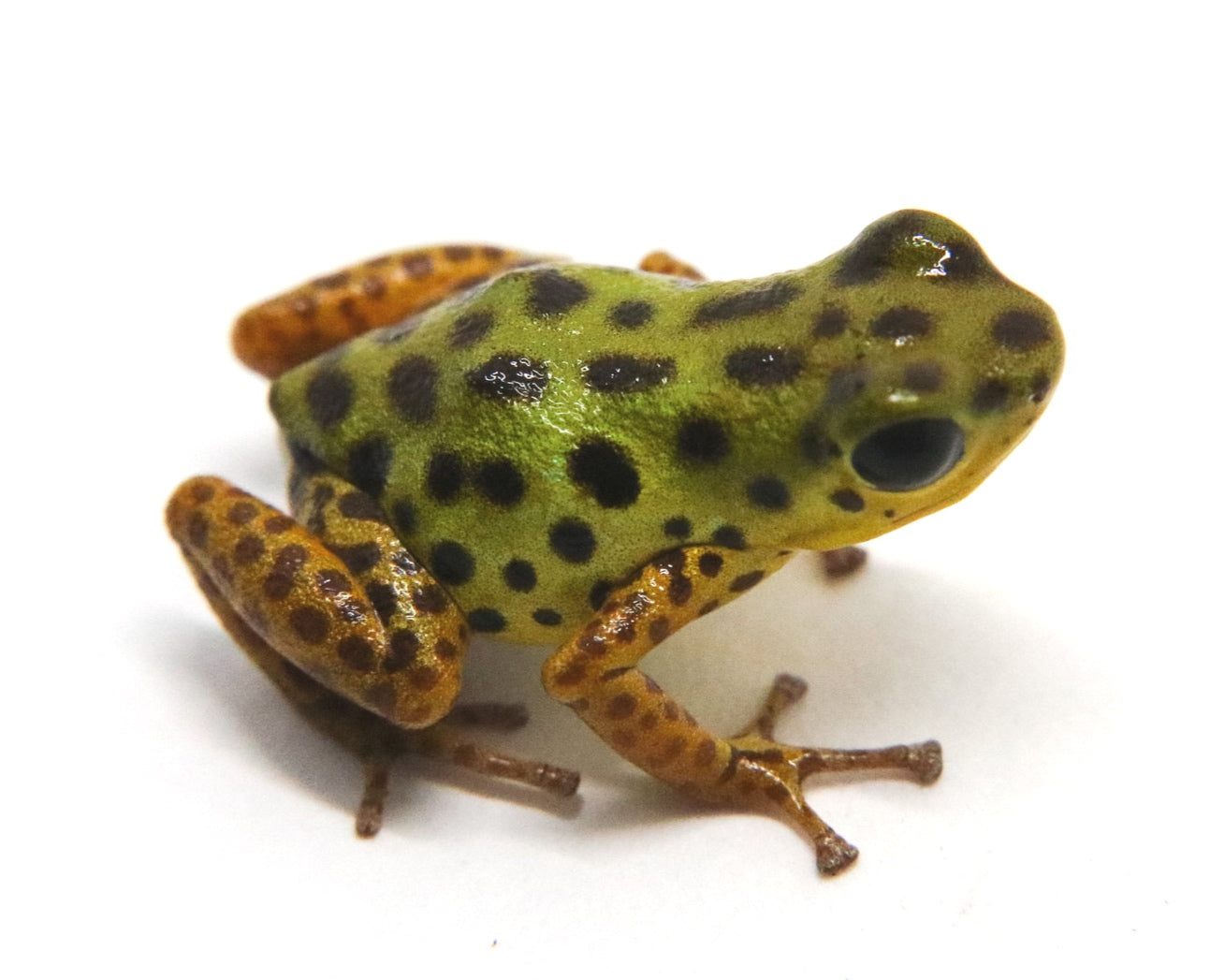 Oophaga pumilio "Isla Colon - Bocas del Drago" is a small poison dart frog that inhabits Isla Colon, in the Bocas del Toro region. They have amazing green bodies with cheetah-print colored legs, and are one of the most popular pumilio to keep. They do fine in small groups, but do best as a pair or trio when sexual maturity is reached. The males often have control of 1 to 5 square meters of territory in the wild, so rival males may display aggression for supremacy. They usually lay 3 to 10 eggs on glossy leaves, on glass, or sometimes in leaf litter. Tadpoles must be raised by adults because they feed on infertile eggs from the female. These dart frogs are interesting to many hobbyists because they exhibit biparental care. No more than a trio should go in a 20 gallon vertical conversion tank or a 18 x 24 Exo-terra enclosure. Additional information can be found, of course, through our complimentary Encyclopedia Database: DendroKnow Project.