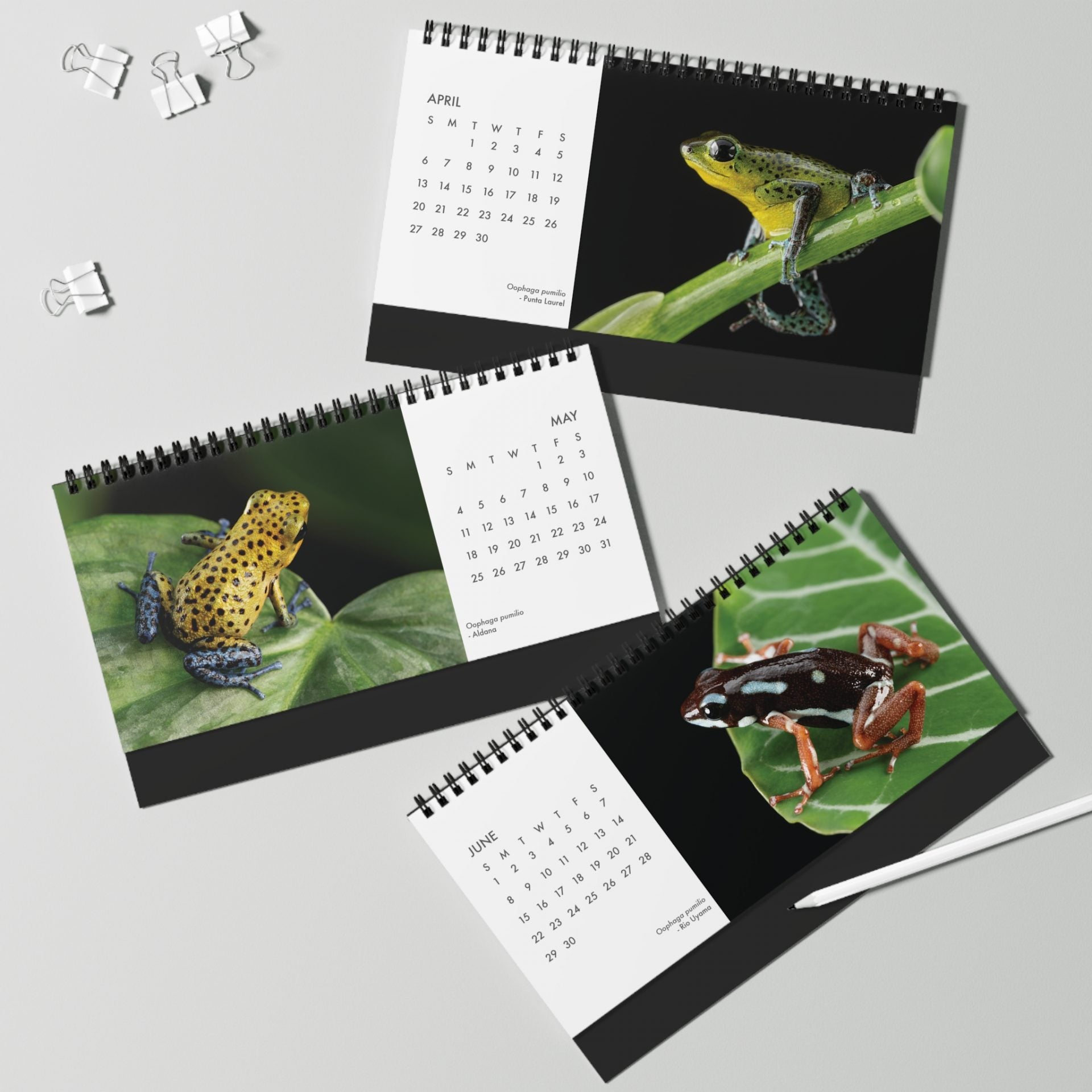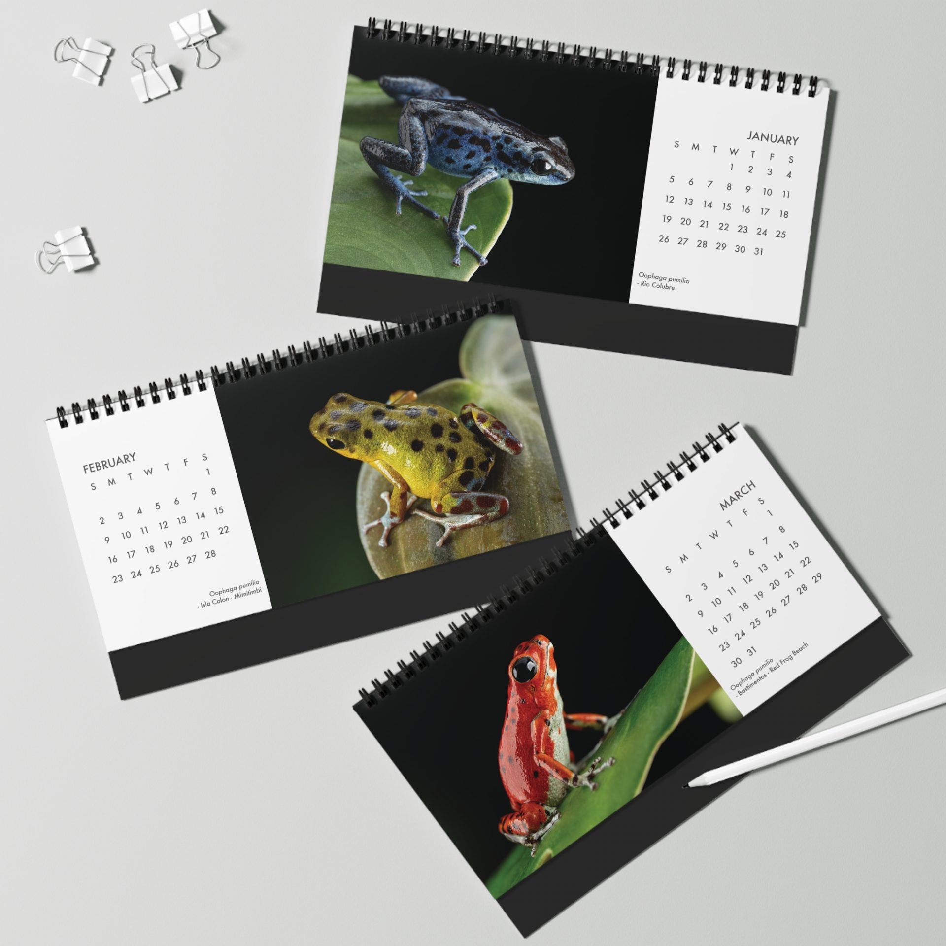 The compact size of our pumilio desktop calendar makes it convenient for placing on a desk, shelf, or any other small space. We hope you enjoy the colors and variability of this small amphibian throughout the year!