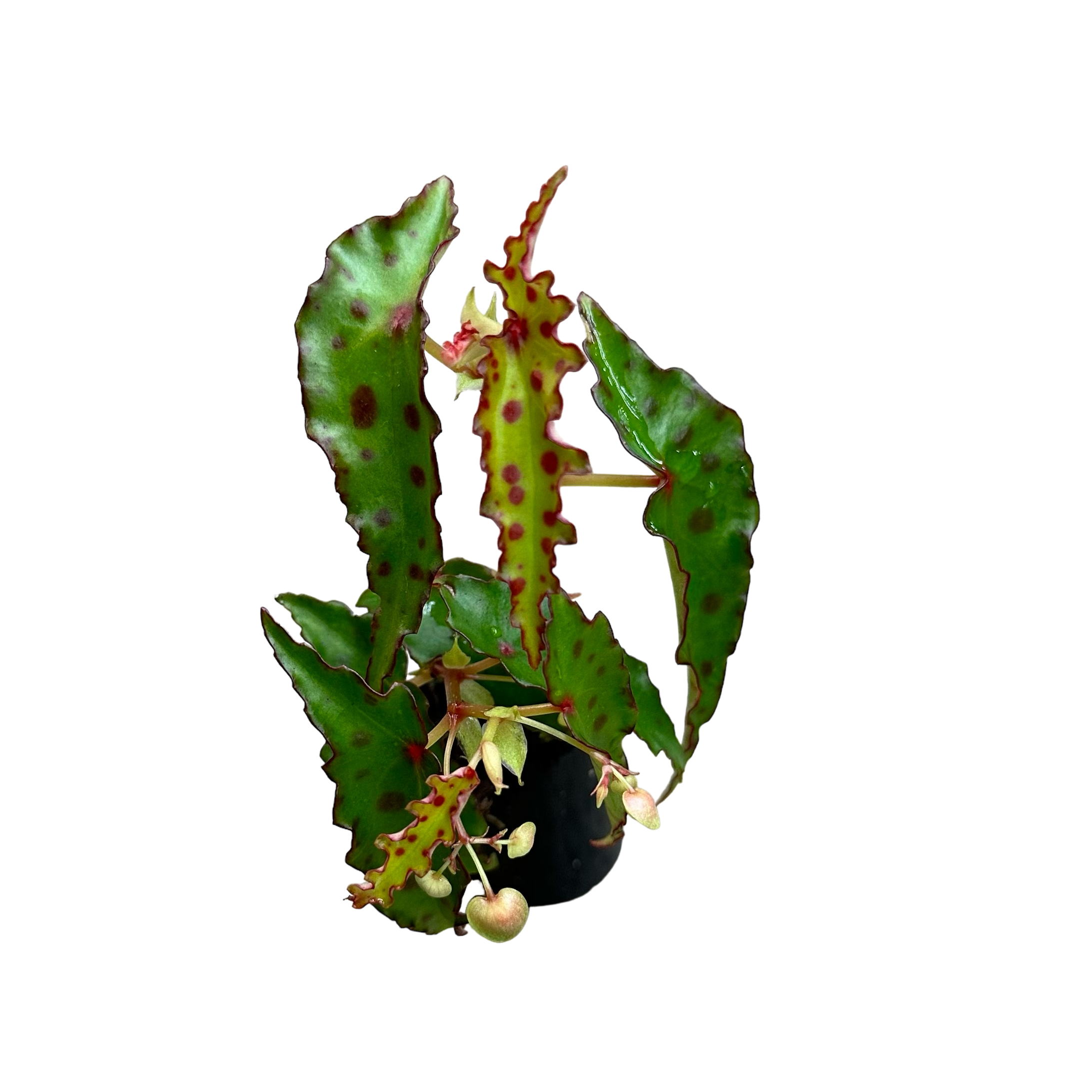 Begonia amphioxus is an uncommon, slower growing species of Begonia native to Malaysia, in the Sabah region which is Northern Borneo. It has bright orange / red edges and is blotted with orange / red dots. It does well in moderate, indirect light and moderate to high humidity, but appreciates airflow. Moist soil and sphagnum moss are helpful for rooting this species. It is exceptionally slow to root compared to many other Begonia, and if too wet can rot easily. It is prized amongst many Begonia keepers.