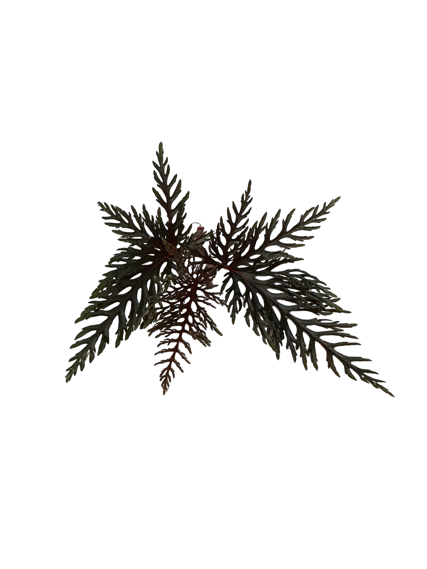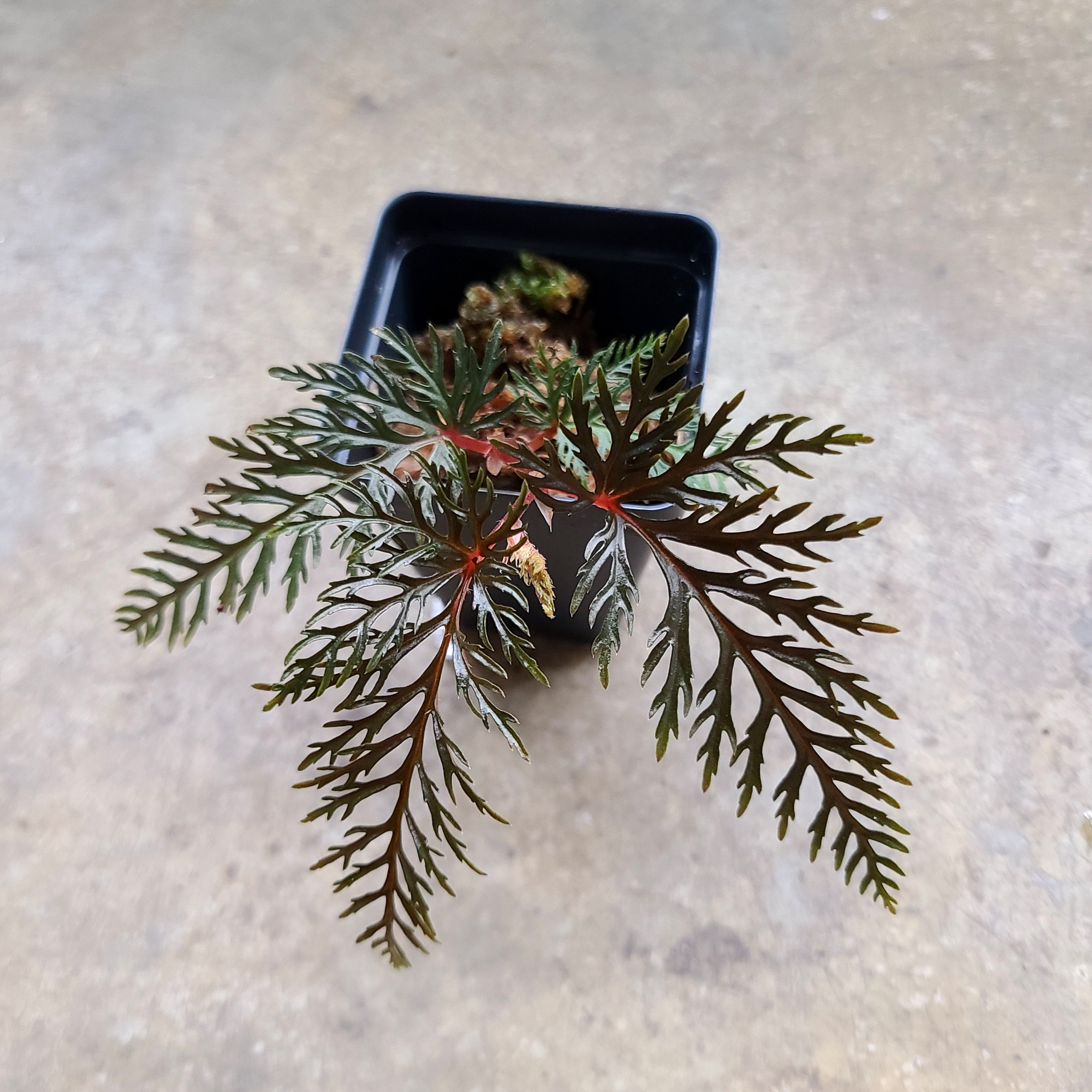 Begonia bipinnatifida is a unique species from New Guinea. It is a moderately slow grower, but once it establishes, grows quickly. It does well in terrarium culture. Its leaves are its selling point; they are incredibly unique, even amongst the Begonias. The leaves are very dark, and heavily lobed in a "feather" structure, hence its common name, the feather Begonia. It does well in bright, indirect light and moderate to high humidity. It prefers some airflow. Moist soil and sphagnum moss are helpful for rooting this species. Be aware that this species can be difficult to root. Please be experienced before purchasing.