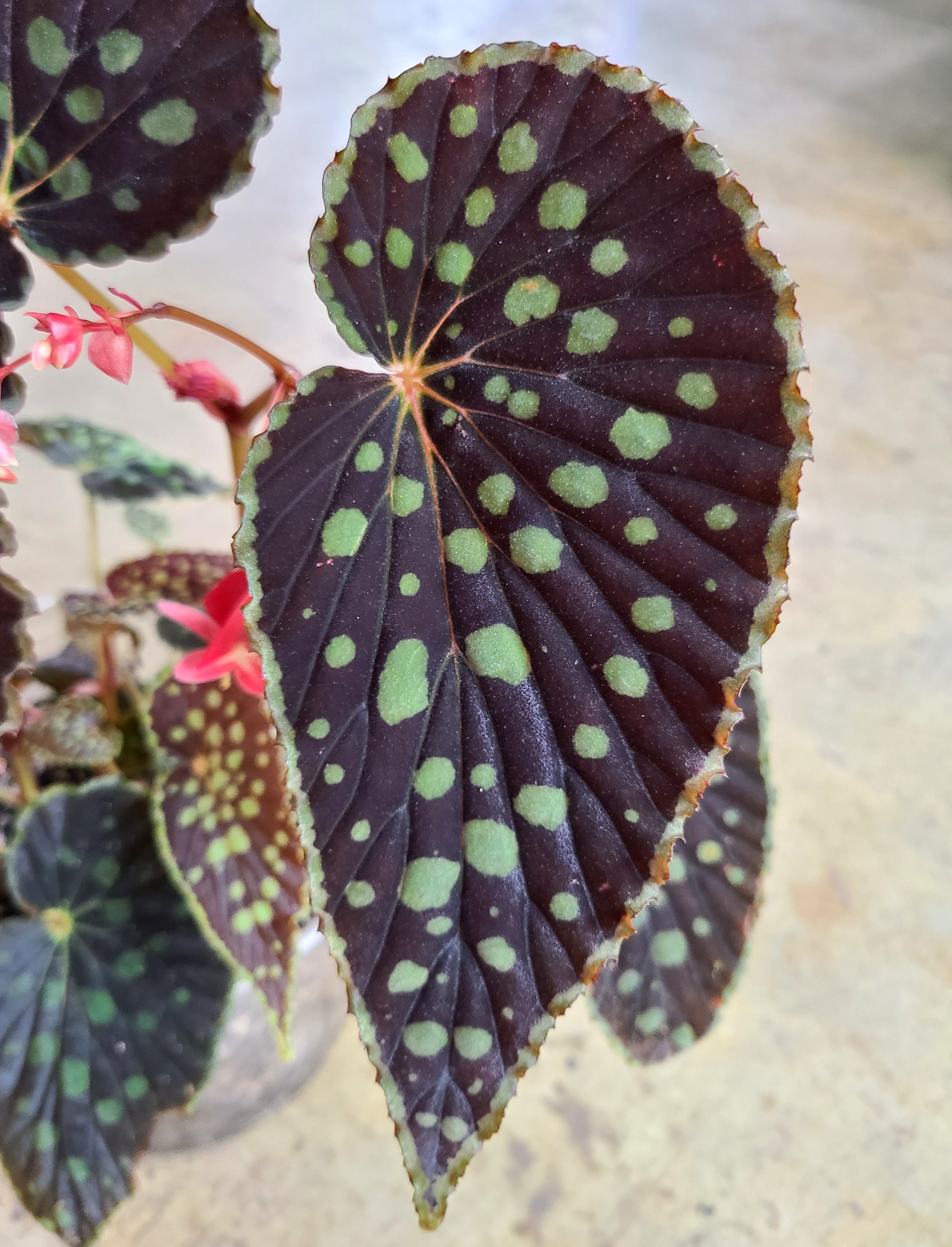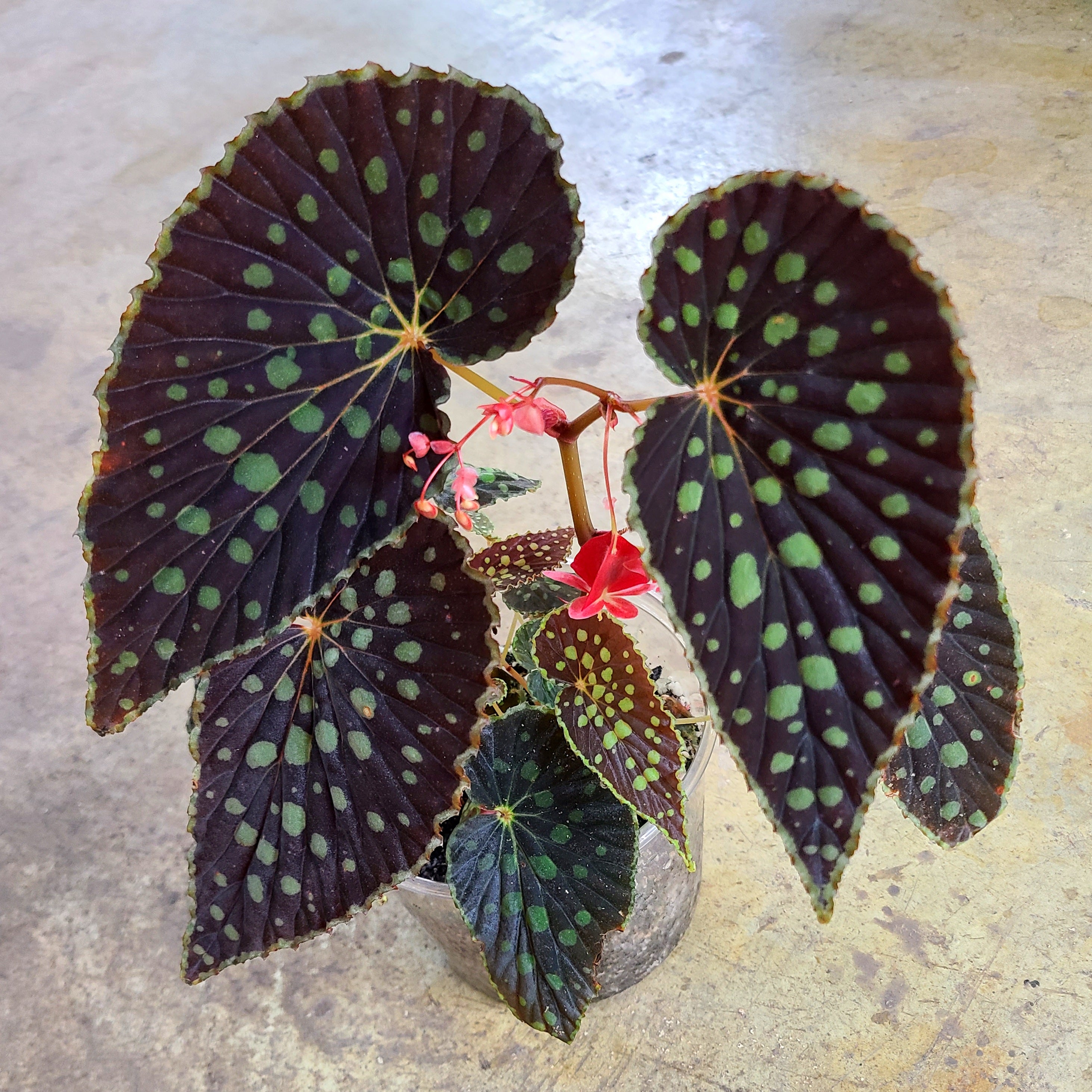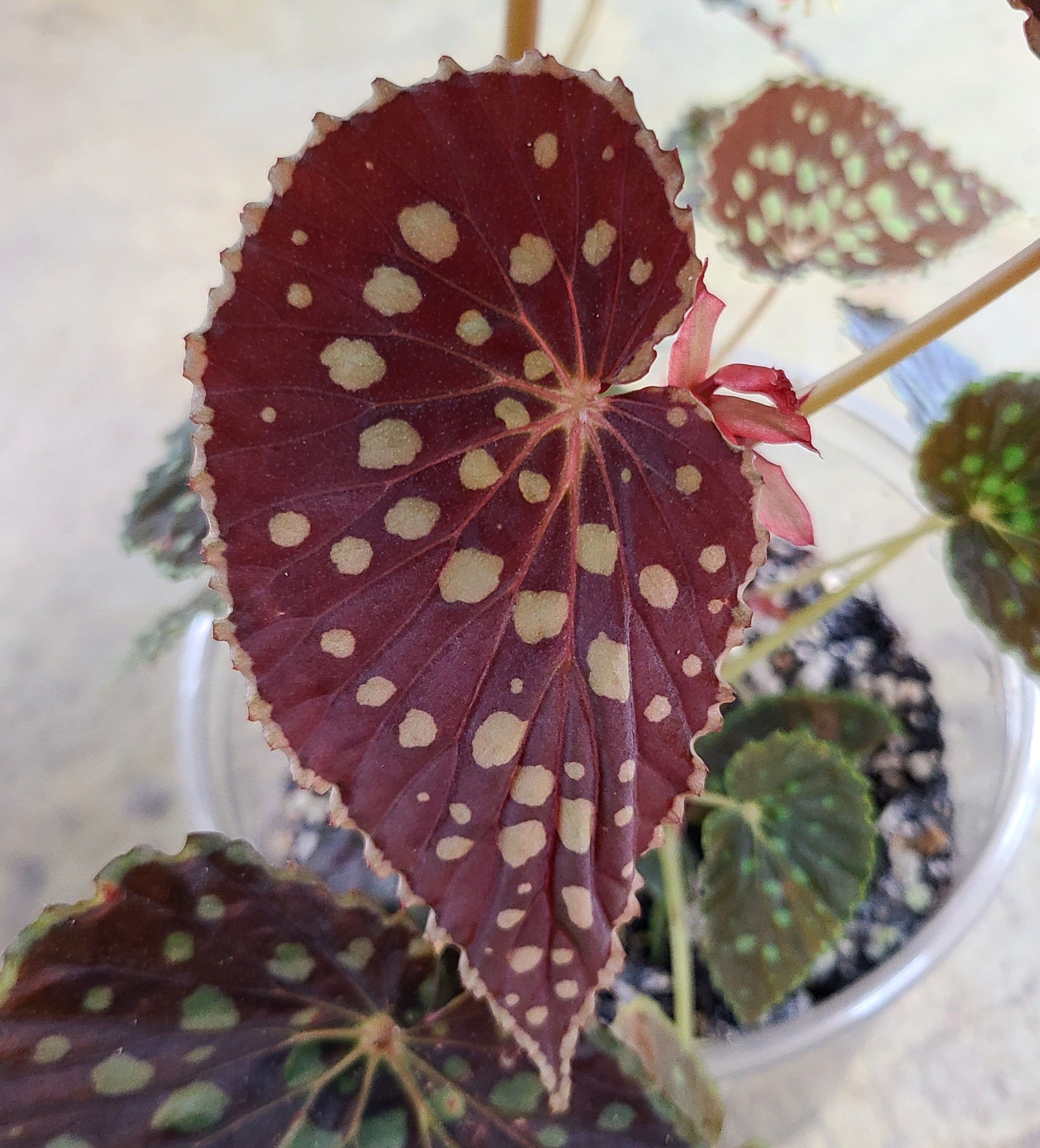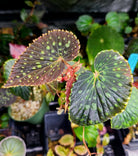 Begonia chlorosticta 'Red Form' is a beautiful, red and green spotted Begonia. It is one of the most prized Begonia in the USA hobby. It is a fragile, moderately growing species from Sarawak, Malaysia and does well in terrarium conditions, provided it is not too humid or wet. It does well in moderate, indirect light and moderate humidity, around 60-70%. Moist soil and sphagnum moss are helpful for rooting this species. It roots slowly compared to many other Begonia.