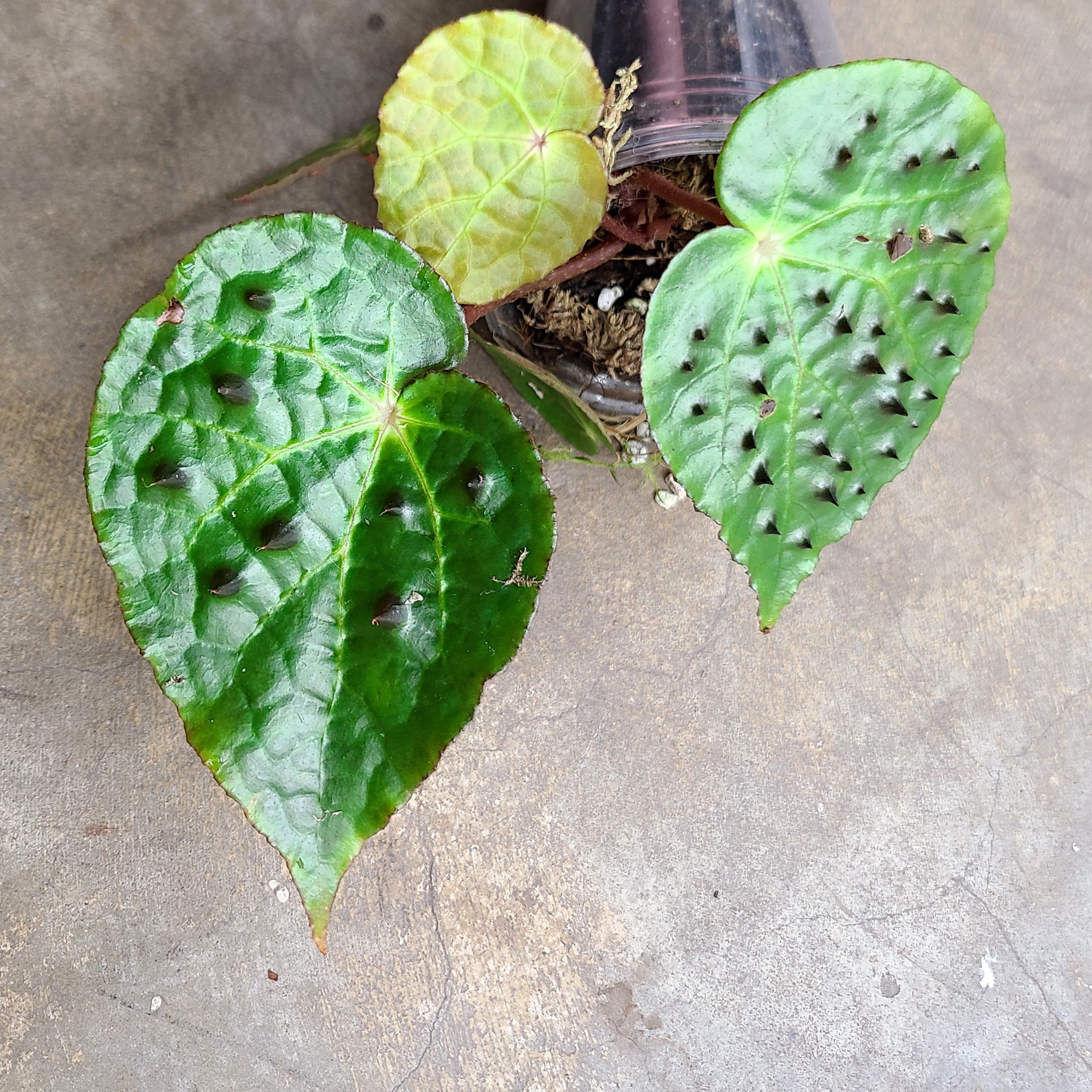 Begonia ferox is a moderately slow growing species with round to ovate leaves from the cliffs of China. Its leaves are green and are covered in amazing structures called bullae (the black cones, or teeth, on this plant). It does well in bright, indirect light and high humidity, but needs some airflow, as it is native to limestone cliffs. Moist soil and sphagnum moss are helpful for rooting this species. It roots slowly compared to many other Begonia.