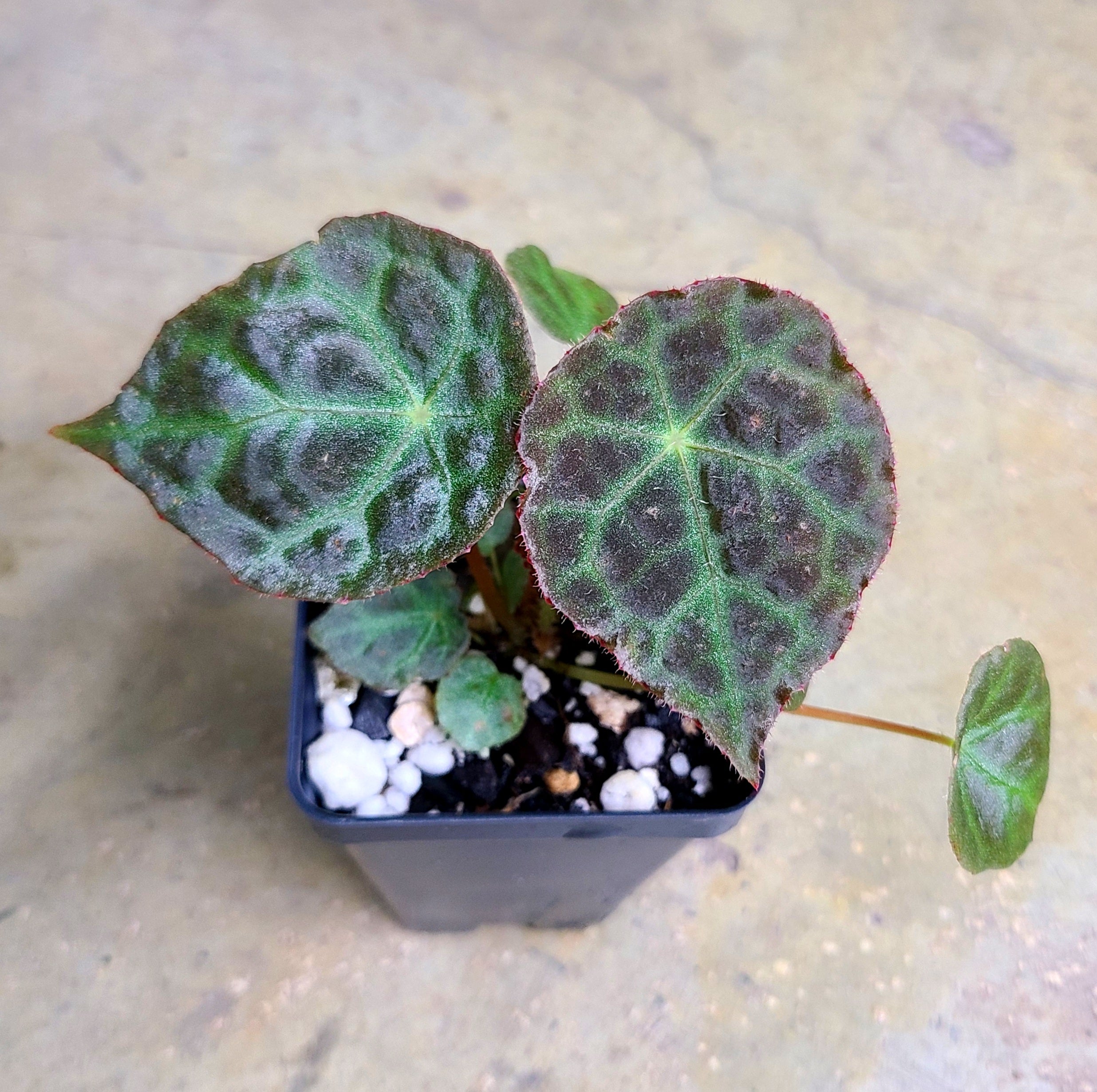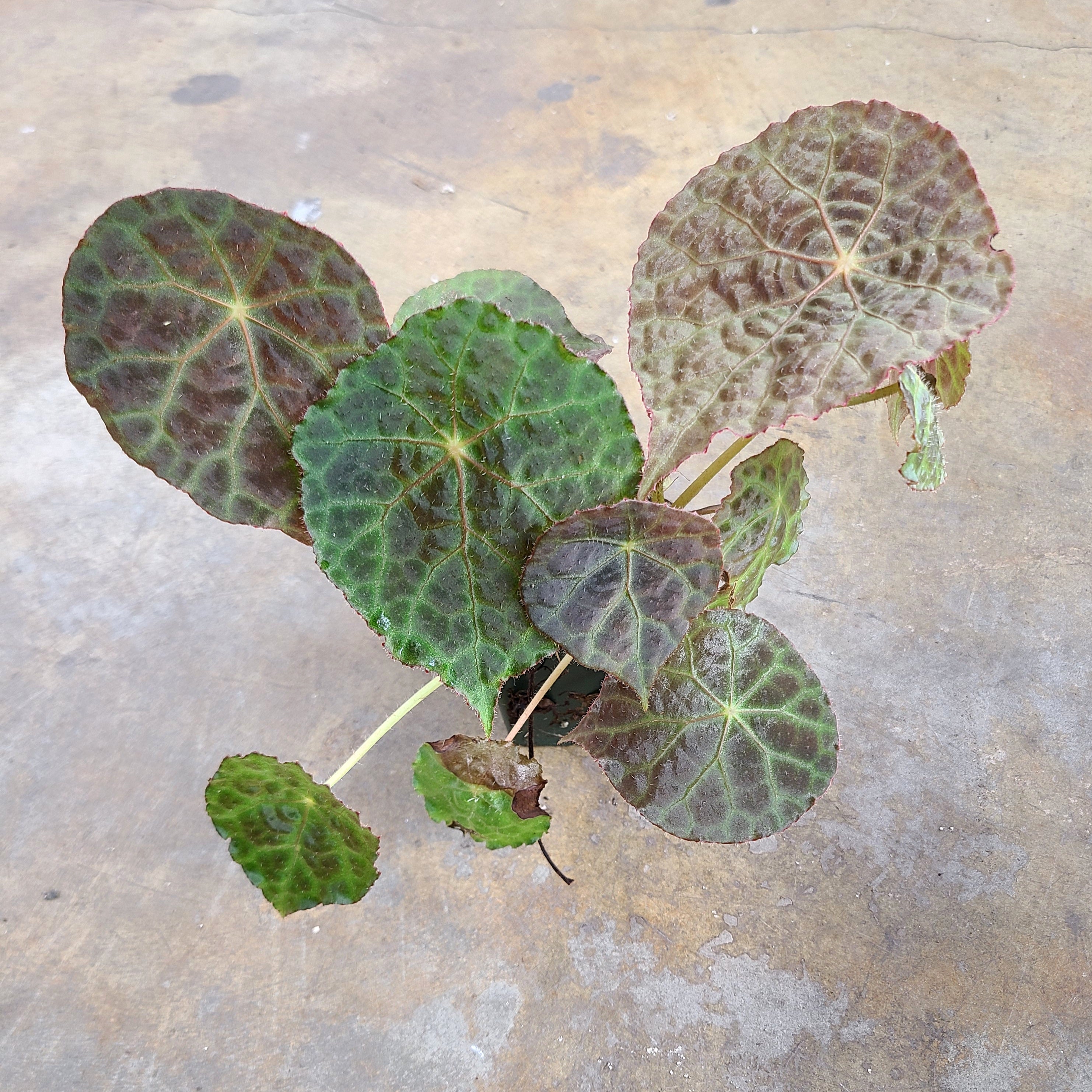 Begonia goegoensis is one of our personal favorites. It is a moderate growing species of Begonia native to Sumatra, Indonesia. It is prized amongst collectors for the bullate texture, and the intense variation of color throughout the growth of the leaves. It does well in moderate, indirect light and moderate to high humidity, but appreciates airflow. Moist soil and sphagnum moss are helpful for rooting this species. It is somewhat slow to root compared to many other Begonia, and can have very large leaves.