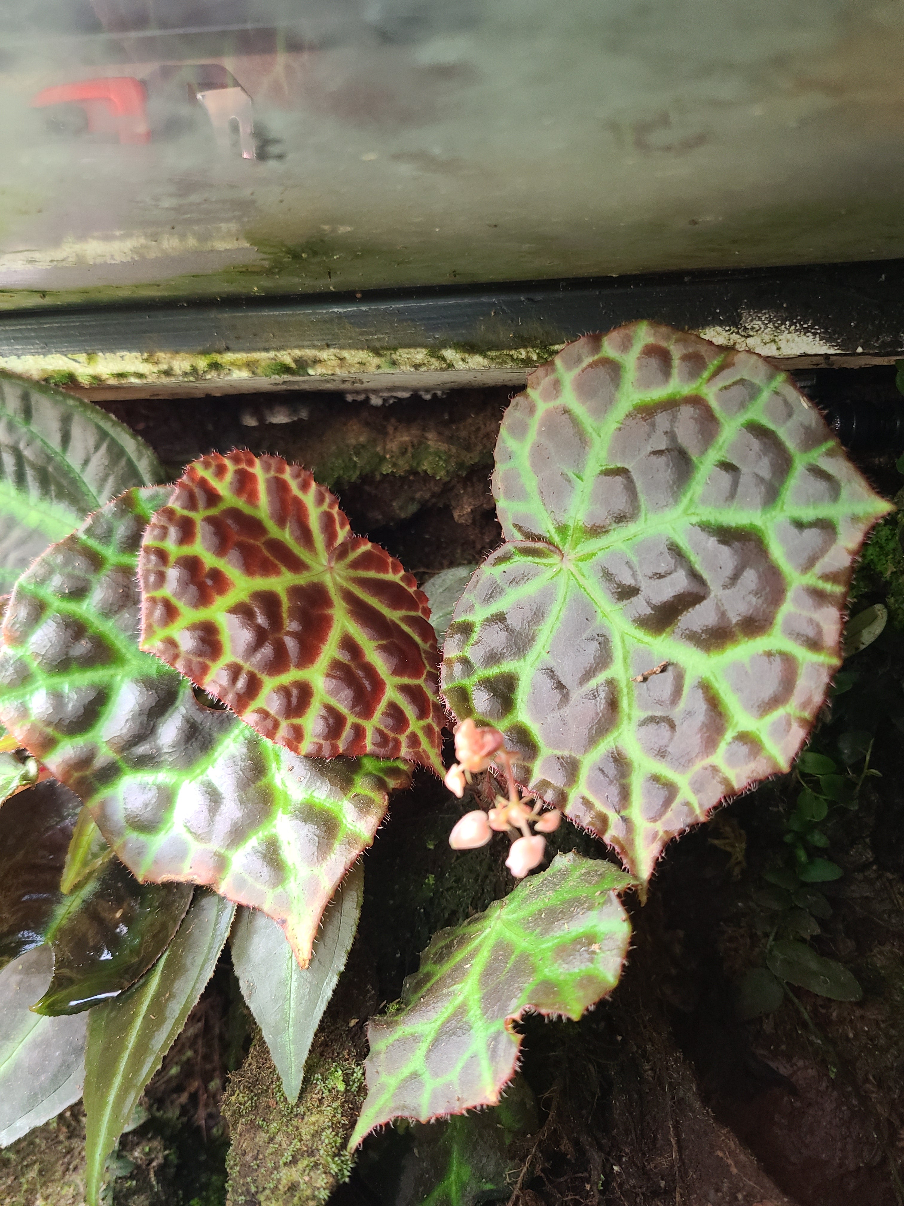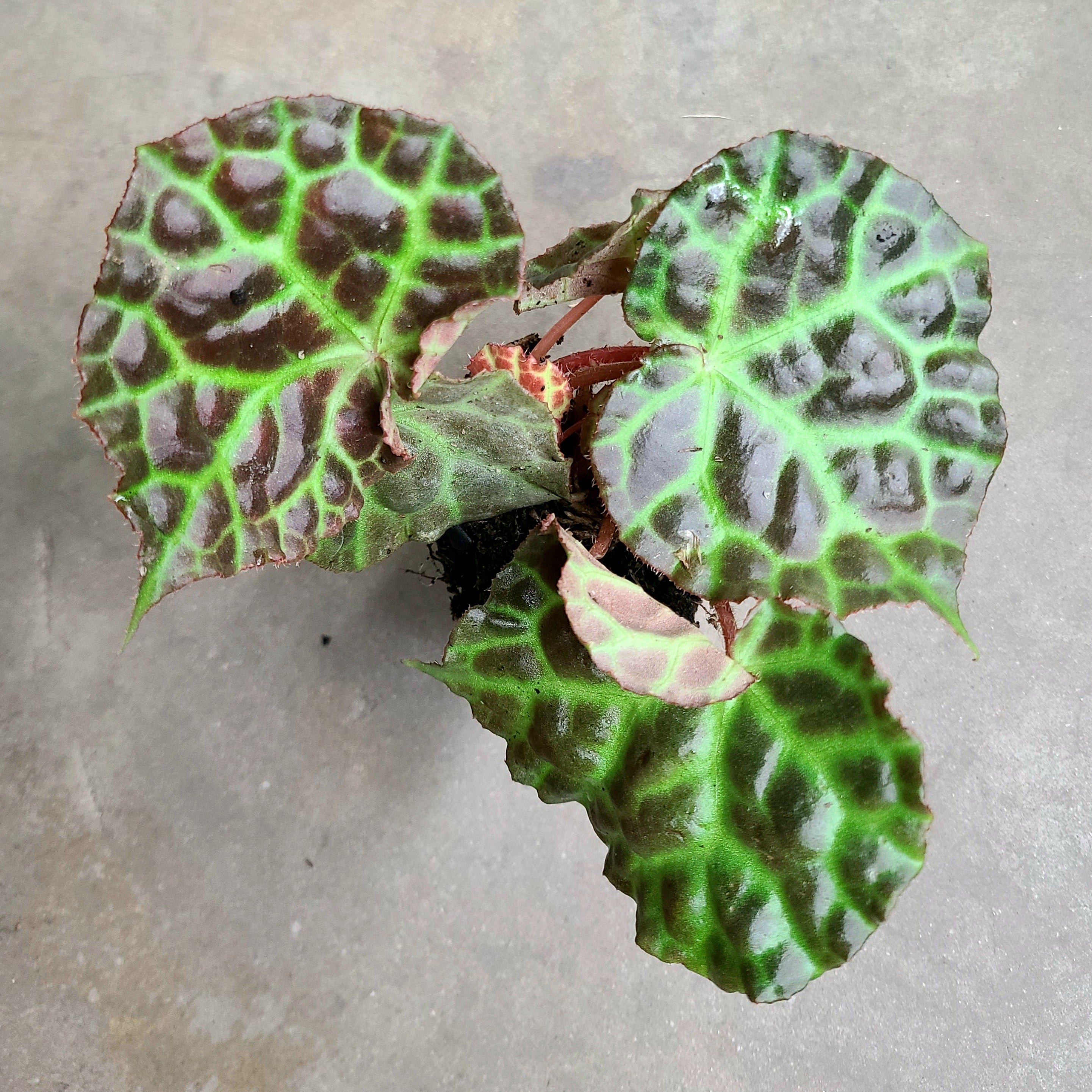 Begonia rajah is from the Malaysian peninsula where it grows along streambanks. It has dark green and red leaves with intense venation. It is extremely coveted. This Begonia stays quite small and is a colorful, slow growing species. It does well in bright, indirect light and high humidity. It requires more airflow than most to be healthy. Moist soil and sphagnum moss are helpful for rooting this species.