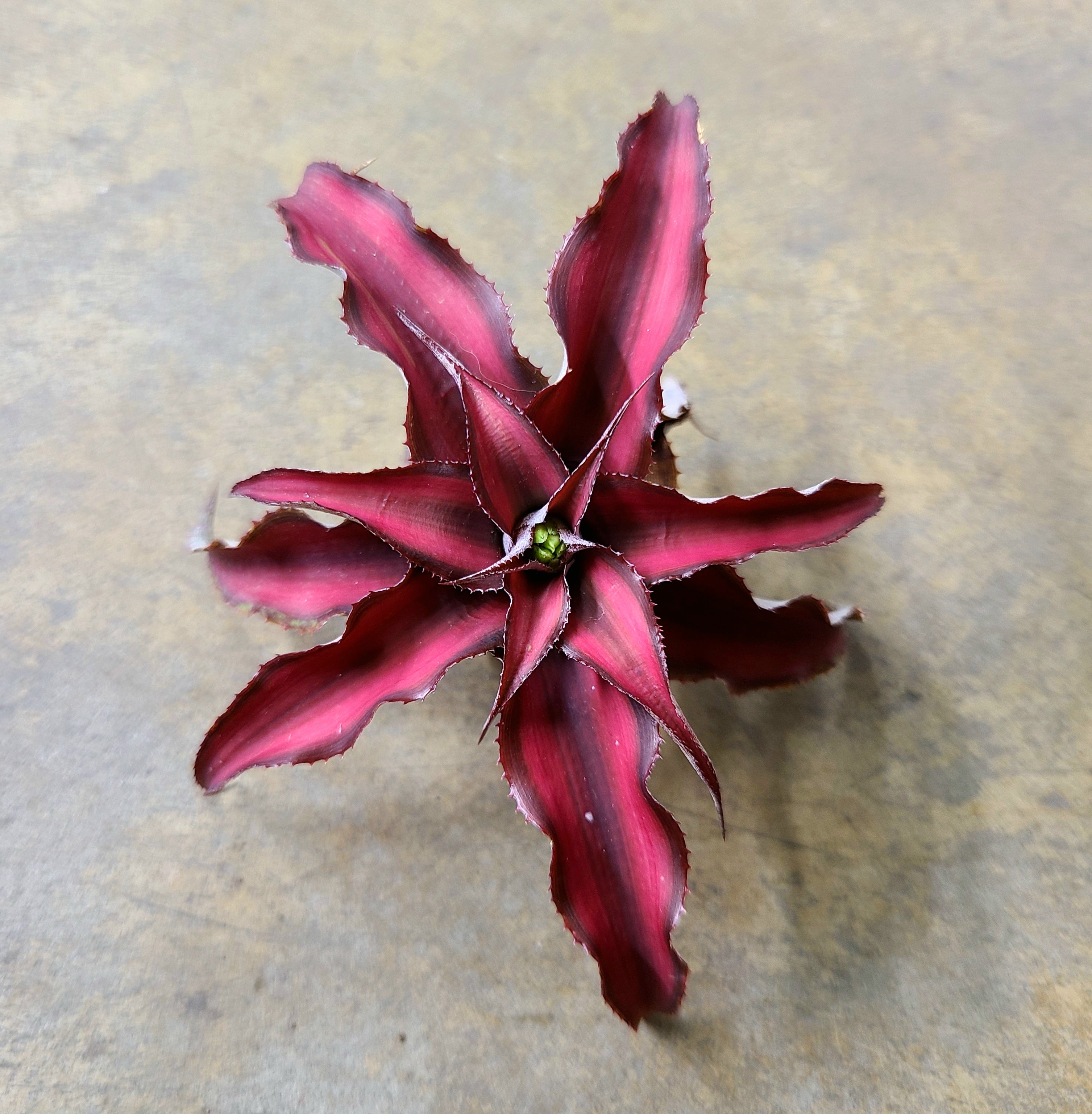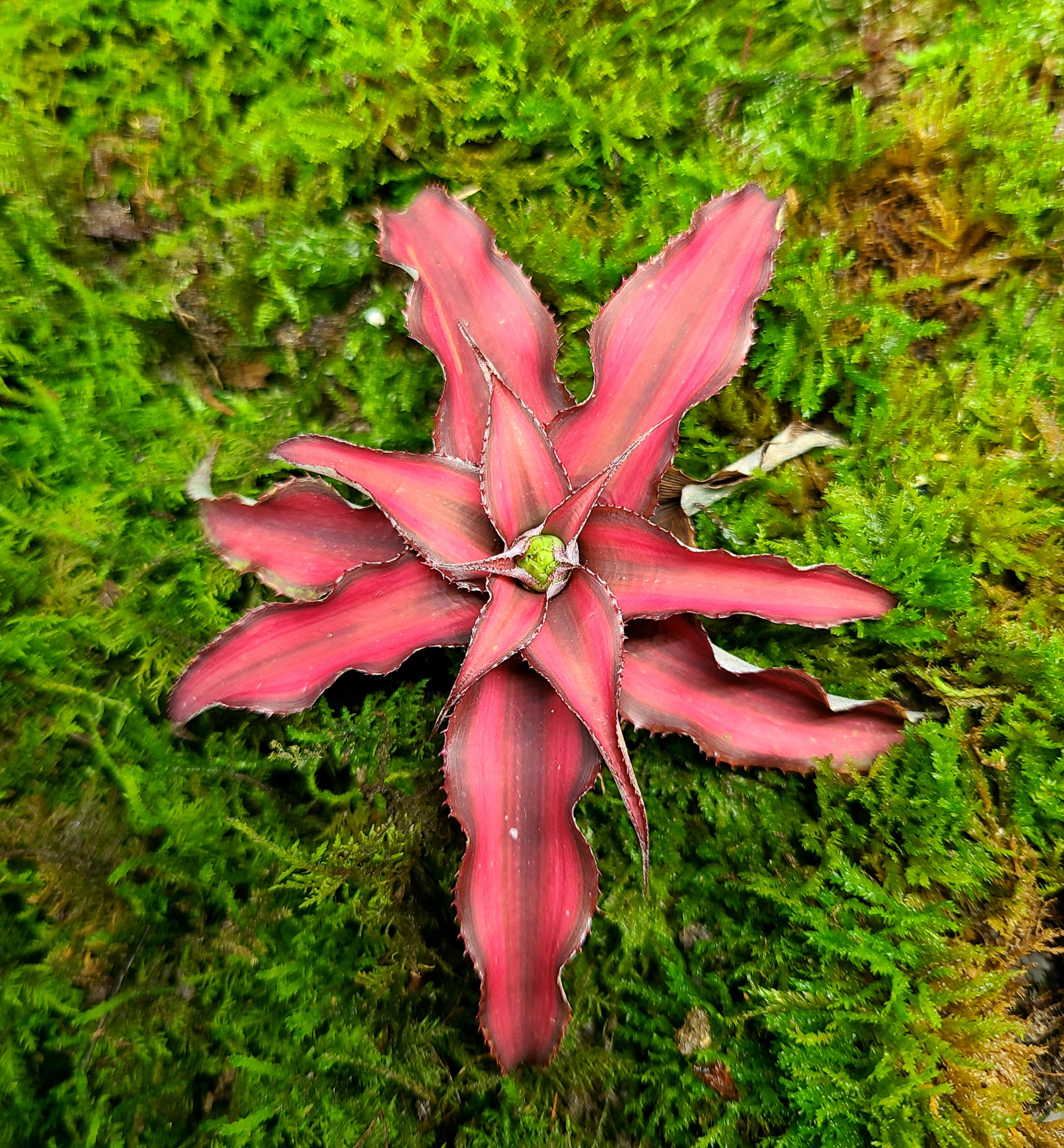 Cryptanthus "Ruby" is a smaller growing Cryptanthus. This genus is in the Bromeliad family and is native to Brazil. It has bright green and red stripes in high light, but in low light turns almost fully green. The mature plant can reach about 7-10 inches in diameter. It grows moderately slowly in a vivarium and does best under very bright, indirect light with moderate humidity. Airflow is helpful. Moist soil and sphagnum moss are helpful for rooting this species, but it can root on many substrates. Do not let it sit in water.