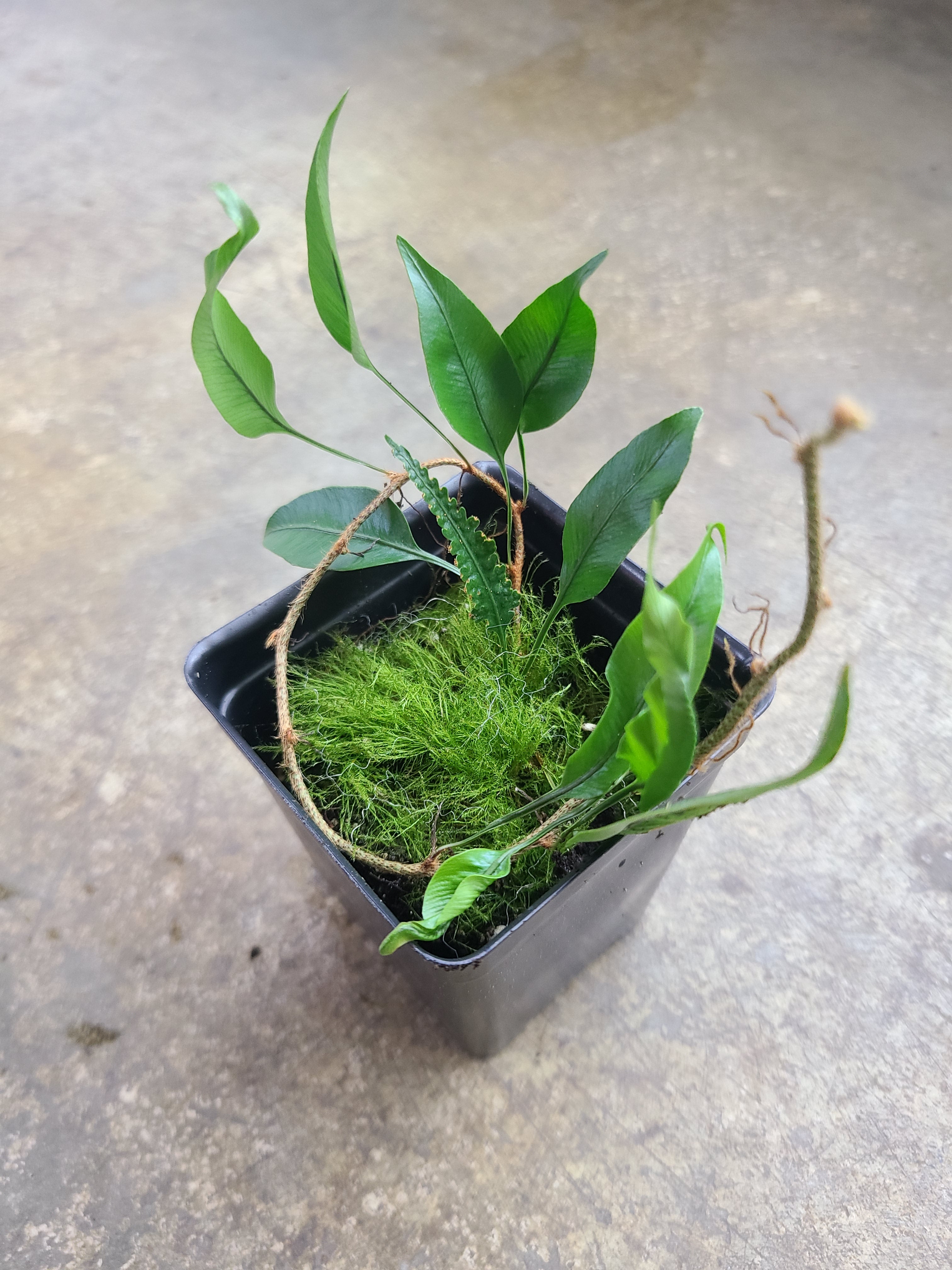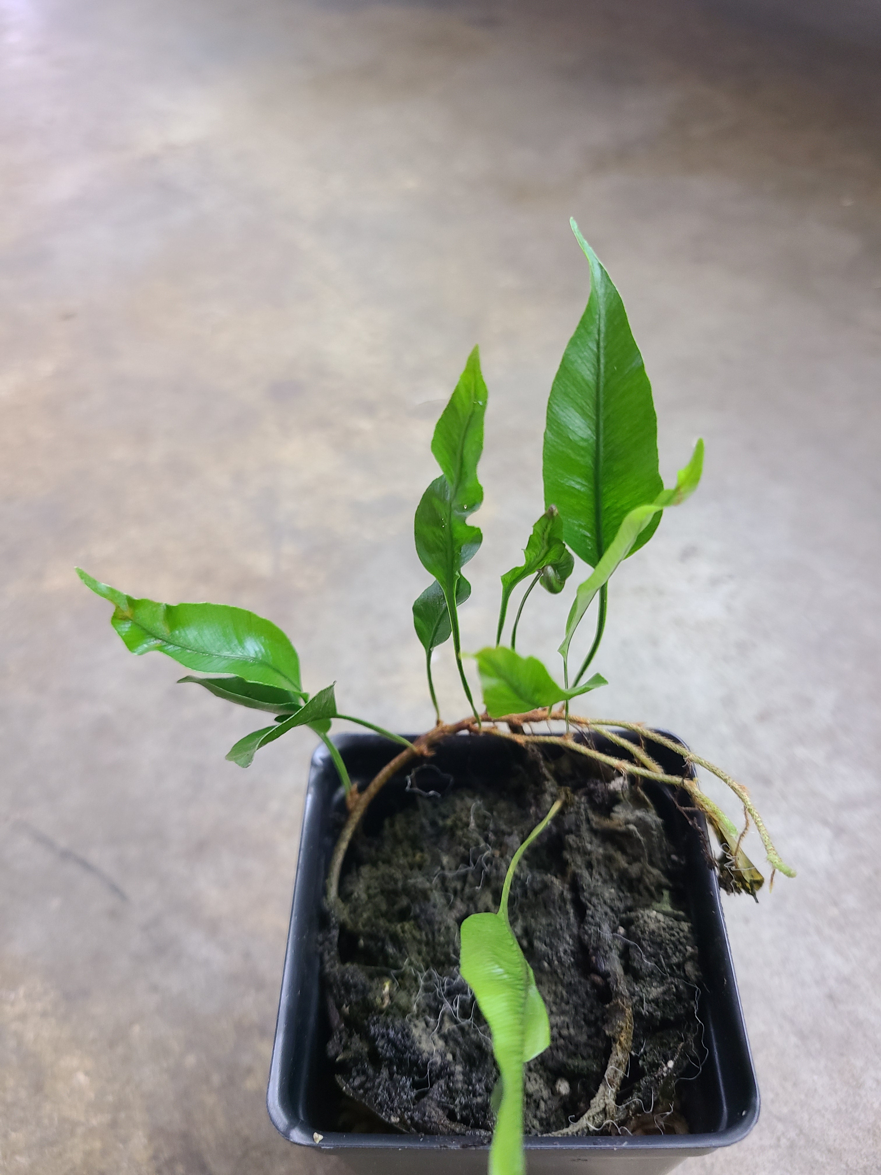 Davallia heterophylla Large Form is a beautiful micro fern. It has flat, thin green fronds that are lance shaped and spreads via a creeping rhizome. This plant does well epiphityically and and a ground sprawler. It is native to Vietnam and Thailand. Like other micro ferns (microferns), it is slow to grow. It does well in moderate, indirect light and high humidity. Moist soil and moist but not wet sphagnum moss are helpful for rooting this species.