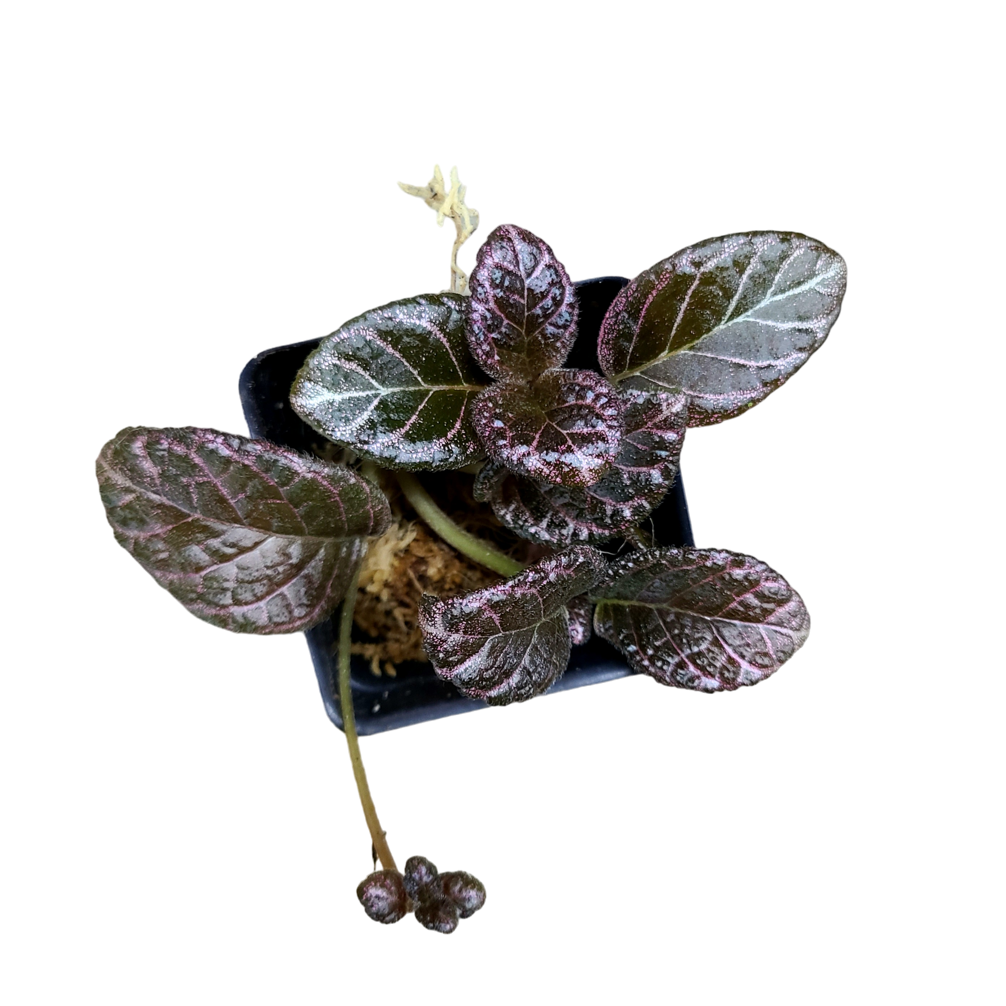 Episcia cupreata “Raspberry Tart” is a type of Gesneriad native to Central and South America. It is known for its stunning dark leaves with shimmery pink veins and year-round blooming capabilities. It is adaptable to the vivarium life, and does well in moist, but not wet, conditions. It enjoys high light and does not like standing water on its leaves. It is easily propagated in sphagnum moss.