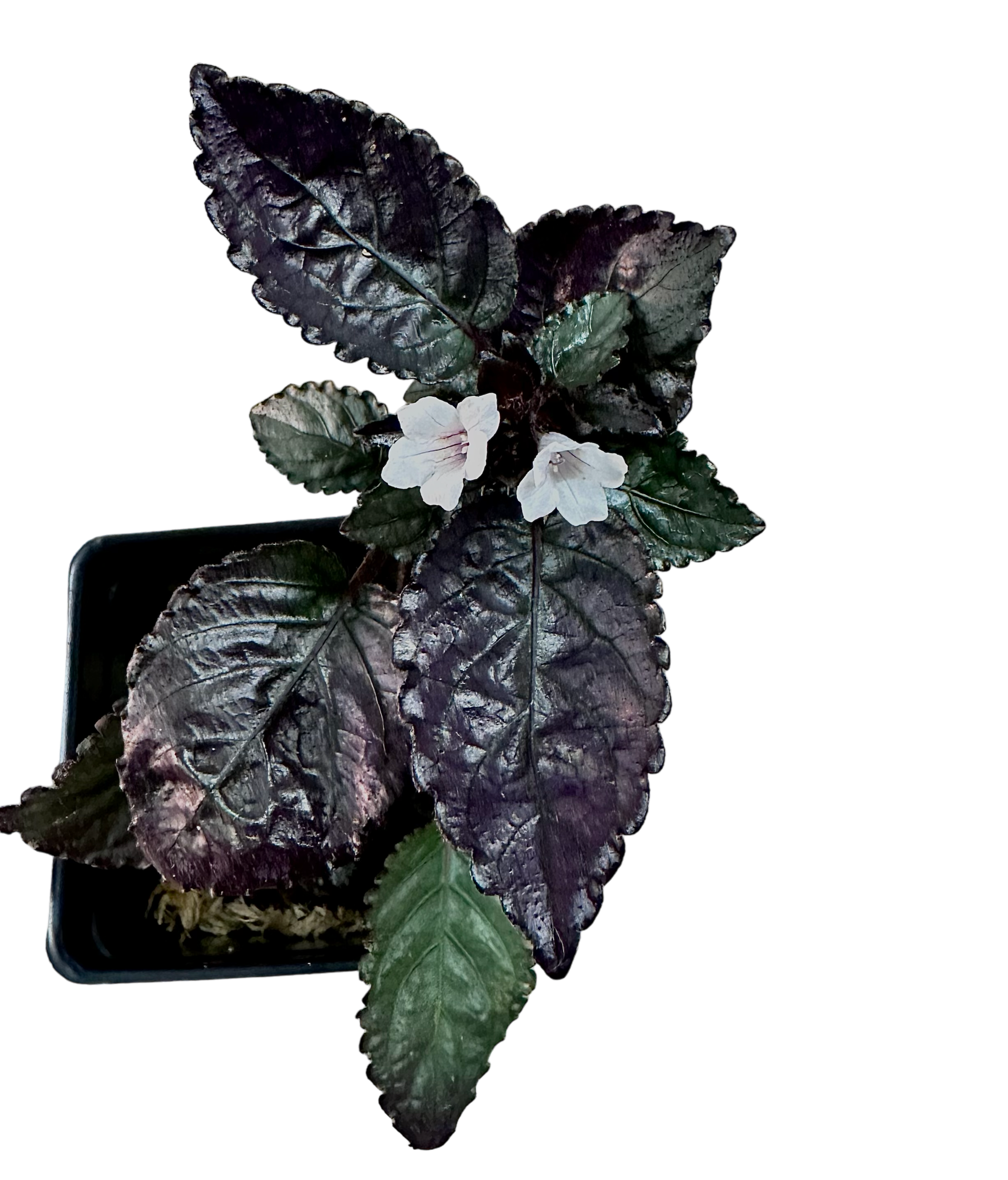 Hemigraphis alternata is known as the waffle plant. This cultivar is exciting and has silvery leaves, and is still relatively uncommon! These plants are fast growing and can work as a flowering, structural plant as it matures. It is much sturdier than the "purple waffle plant" that most people are accustomed to.