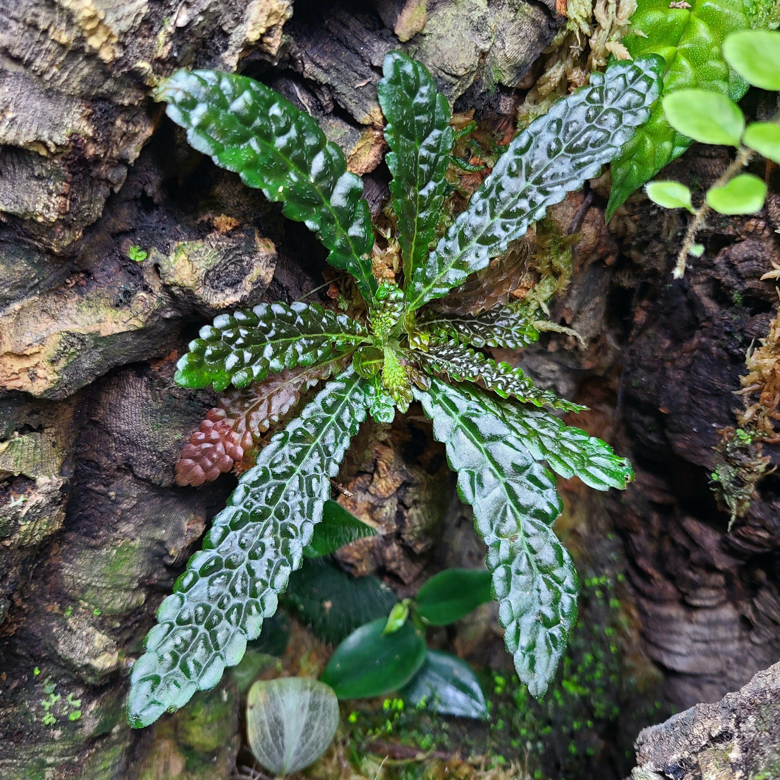 Nautilocalyx pemphidius is a beautiful species that forms small rosettes and has small white flowers from Venezuela. It is a beautiful addition to any vivarium and thrives in high humidity and indirect light. It is a small plant unlike many Nautilocalyx.