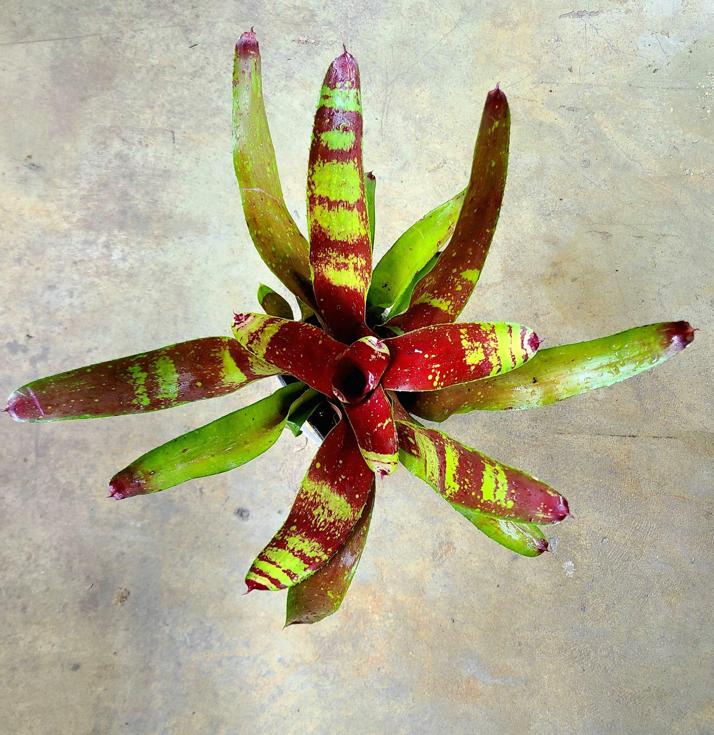 Neoregelia Gazpacho is a large-sized bromeliad that is perfect for a centerpiece in a 24-36+ inch vivarium or larger. They can be crammed into an 18x24 but can get crowded as they can get over 20 inches. This bromeliad has intense red banding and speckling across a green plant. High light increases color. Color upon receipt may be duller due to growing in lower light conditions. Bromeliads are epiphytic and will send roots out in order to attach to other plants, rocks, or backgrounds. Bromeliads also hold water in their leaves, providing deposition sites for tadpoles. For this reason, we do not recommend planting this Bromeliad in the substrate; if they are watered from the bottom and top, the core can rot. Many dart frogs, especially Oophaga, rely on these plants (and film canisters in captivity) for breeding. Bromeliads form pups from the mature plant and will clump together. Please add fresh water to your bromeliads at least weekly, and allow them adequate ventilation. If you do not have ventilation, we do not recommend keeping them fully filled with water.