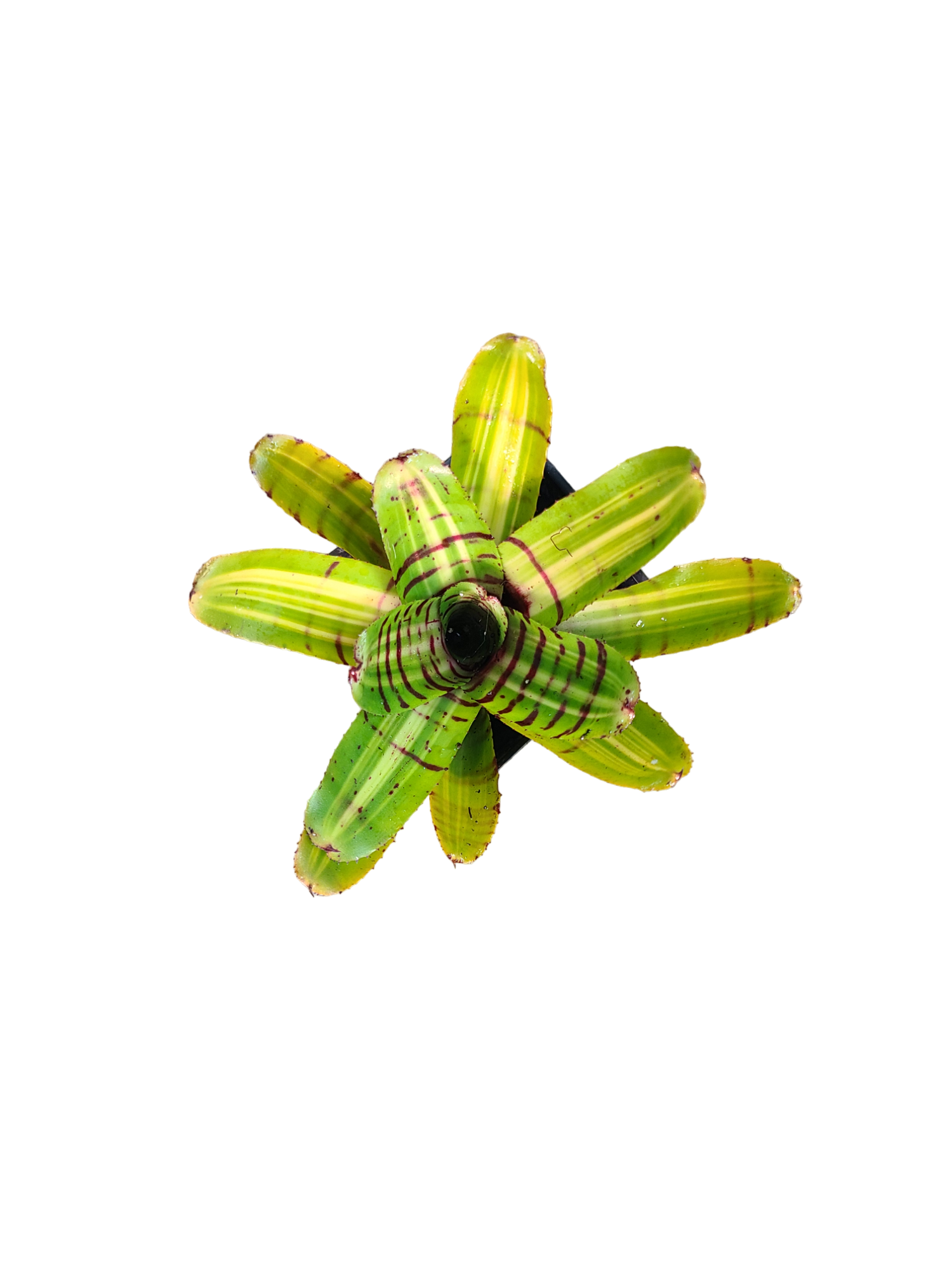 Neoregelia Half Pint is a small-sized bromeliad that is perfect for a 10 to 20 gallon, 12x12x18 to 18x18x18 or 18x18x24 tanks. These can be used in smaller enclosures as well. This bromeliad is bright green with attractive dark lines that increase in intensity under high light. One of our favorites! Bromeliads are epiphytic and will send roots out in order to attach to other plants, rocks, or backgrounds. Bromeliads also hold water in their leaves, providing deposition sites for tadpoles. For this reason, we do not recommend planting this Bromeliad in the substrate; if they are watered from the bottom and top, the core can rot. Many dart frogs, especially Oophaga, rely on these plants (and film canisters in captivity) for breeding. Bromeliads form pups from the mature plant and will clump together. Please add fresh water to your bromeliads at least weekly, and allow them adequate ventilation. If you do not have ventilation, we do not recommend keeping them fully filled with water.