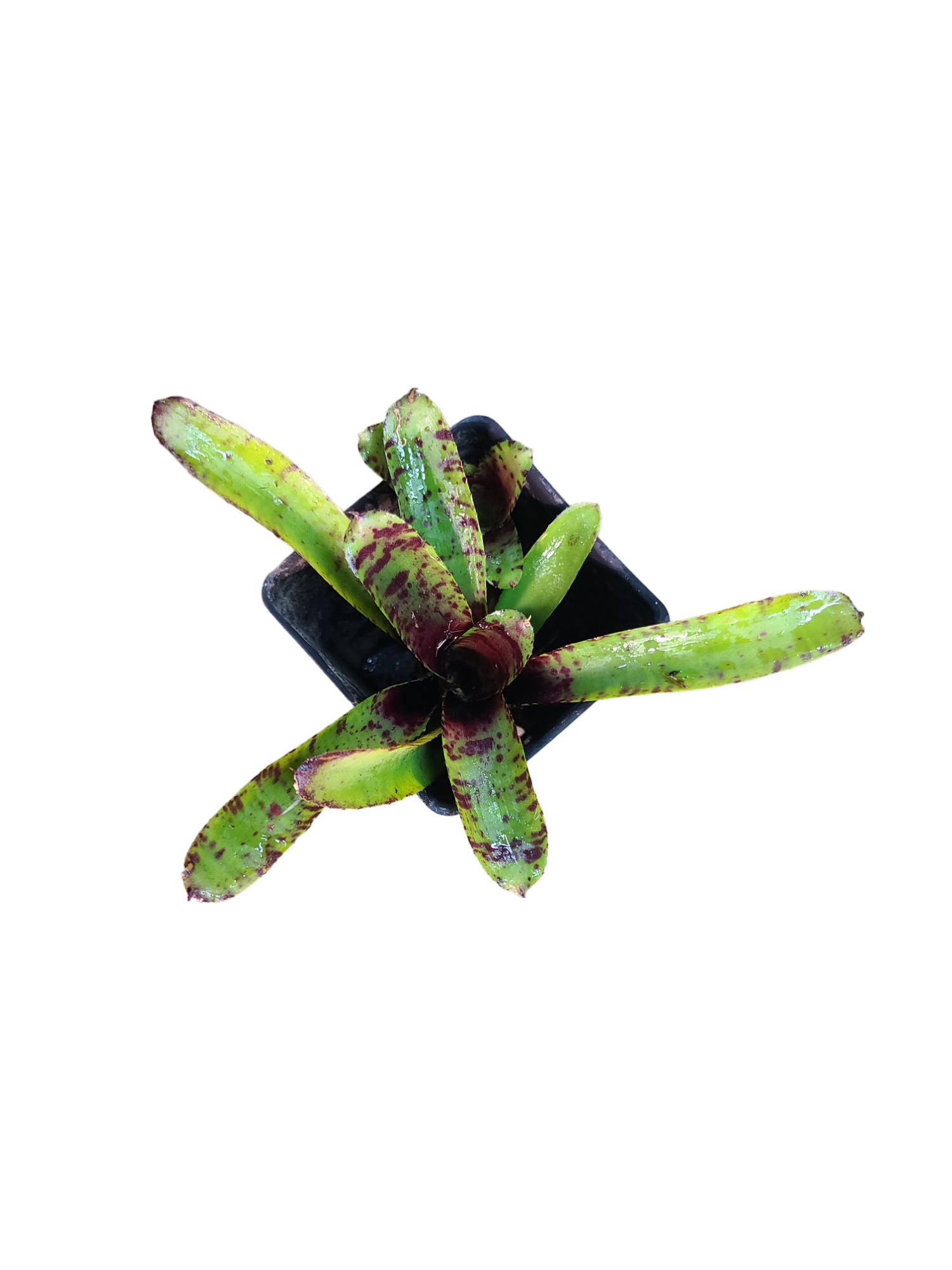 Neoregelia Kit Kat is a micro to small-sized bromeliad that is perfect for a 10 to 20 gallon, 18x18x18 or 18x18x24 . These can be used in smaller enclosures as well. This bromeliad is green-yellow with red speckling. Truly one of a kind! It has a moderately tight-forming cup. Bright light increases coloration. Bromeliads you obtain may be slightly duller than picture due to lower light conditions. Bromeliads are epiphytic and will send roots out in order to attach to other plants, rocks, or backgrounds. Bromeliads also hold water in their leaves, providing deposition sites for tadpoles. For this reason, we do not recommend planting this Bromeliad in the substrate; if they are watered from the bottom and top, the core can rot. Many dart frogs, especially Oophaga, rely on these plants (and film canisters in captivity) for breeding. Bromeliads form pups from the mature plant and will clump together. Please add fresh water to your bromeliads at least weekly, and allow them adequate ventilation. If you do not have ventilation, we do not recommend keeping them fully filled with water.