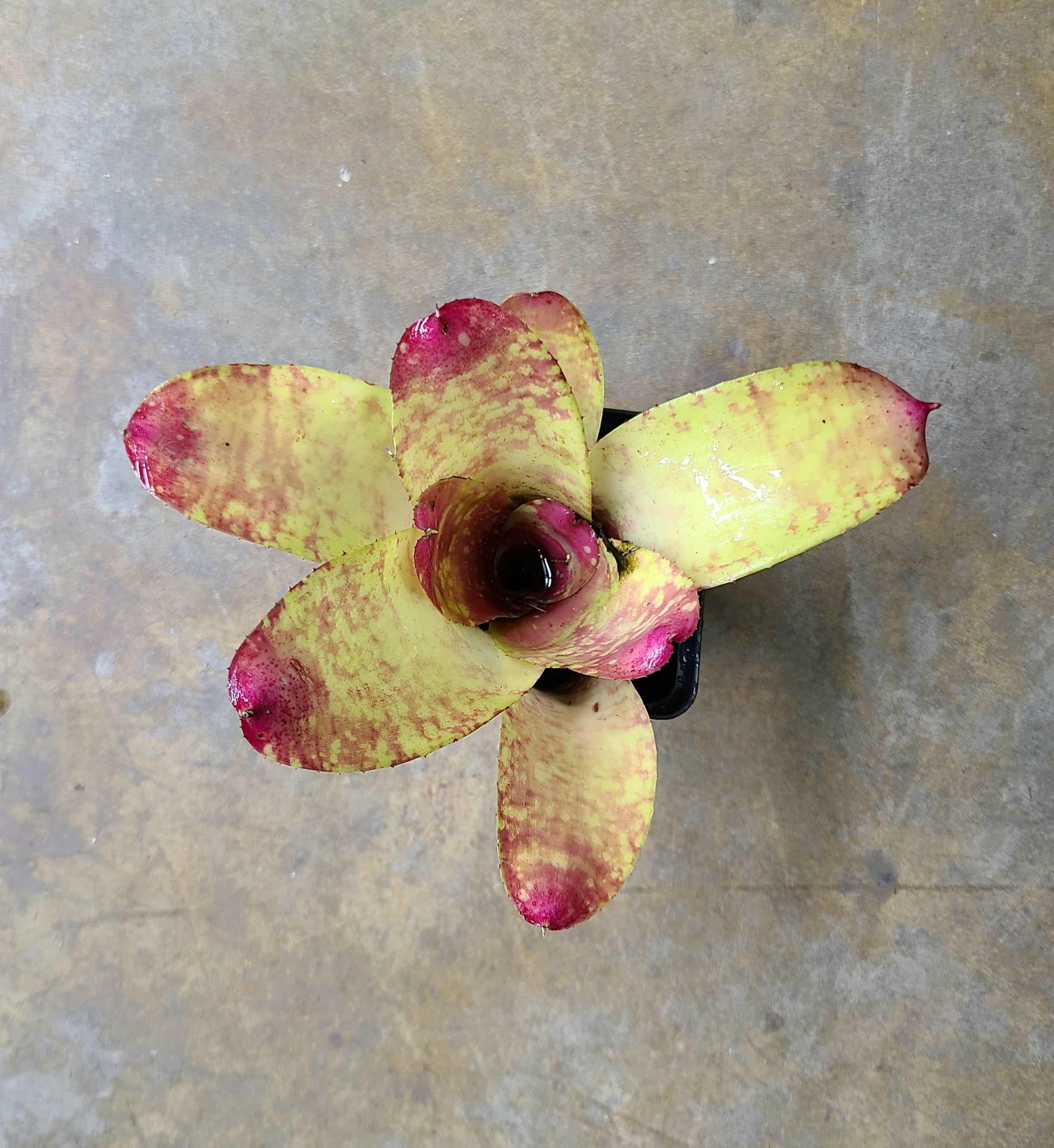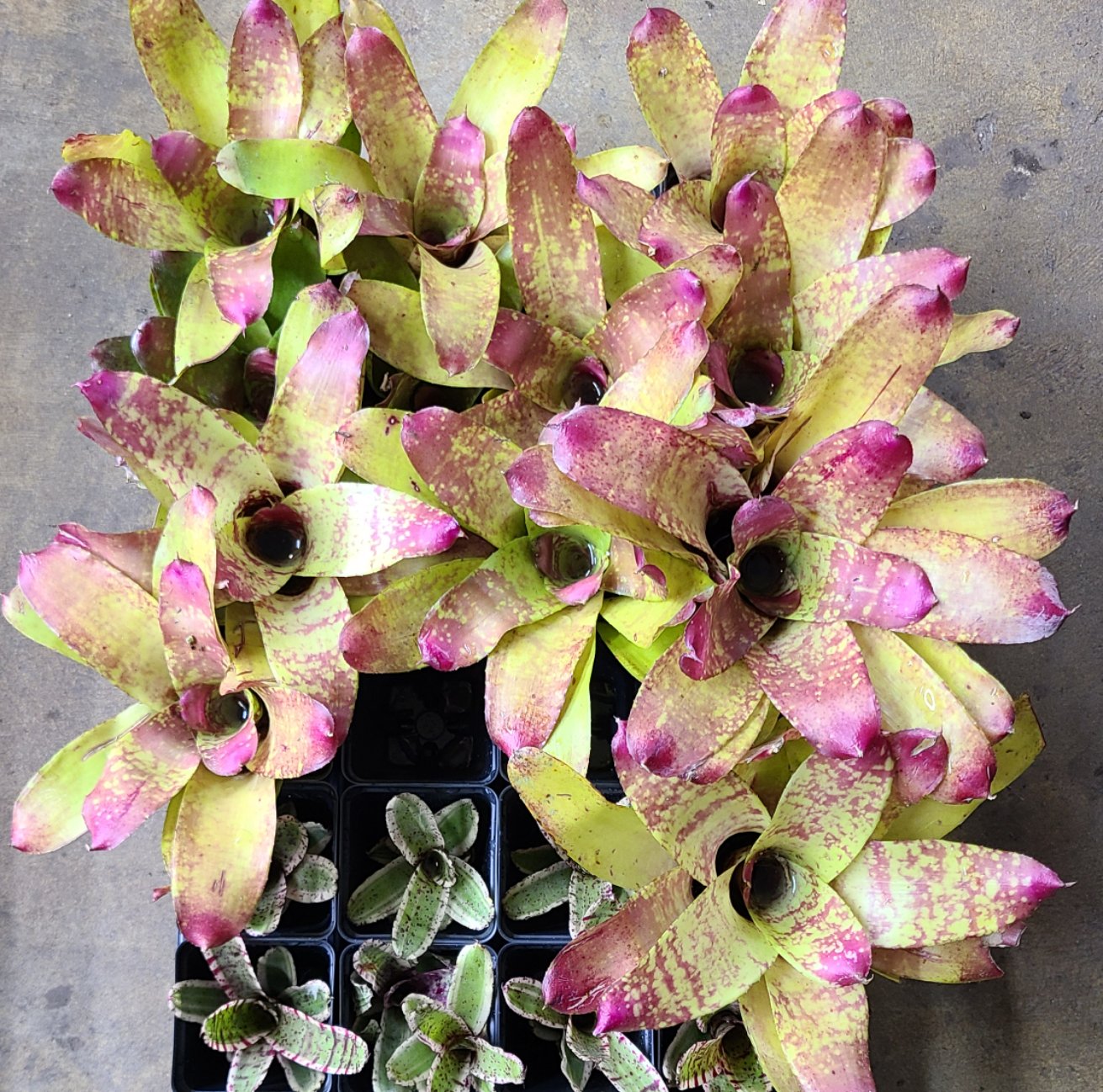 Neoregelia "Little Rose" is a medium-sized bromeliad that is perfect for a 20 gallon, 18x18x18 or 18x18x24 tanks. It can be used in smaller tanks but can take up a lot of room. This one holds a lot of water! This bromeliad is bright green with red and pink splotches that increase under high light. Bromeliads are epiphytic and will send roots out in order to attach to other plants, rocks, or backgrounds. Bromeliads also hold water in their leaves, providing deposition sites for tadpoles. For this reason, we do not recommend planting this Bromeliad in the substrate; if they are watered from the bottom and top, the core can rot. Many dart frogs, especially Oophaga, rely on these plants (and film canisters in captivity) for breeding. Bromeliads form pups from the mature plant and will clump together. Please add fresh water to your bromeliads at least weekly, and allow them adequate ventilation. If you do not have ventilation, we do not recommend keeping them fully filled with water.