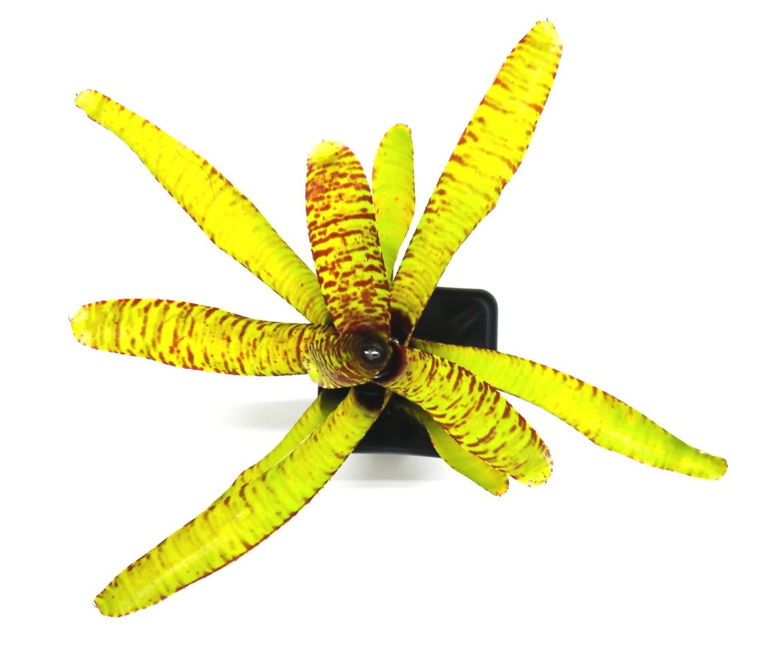 Neoregelia "Ritzy Tiger" is a small-sized bromeliad that is perfect for a 10 to 20 gallon, 12x18 to 18x18x18 or 18x18x24 tanks. It can be used in smaller tanks but can take up a lot of room at maturity...especially when it pups as the stolon length tends to be longer in this species. This bromeliad is bright green with red banding that increases under high light. Bromeliads are epiphytic and will send roots out in order to attach to other plants, rocks, or backgrounds. Bromeliads also hold water in their leaves, providing deposition sites for tadpoles. For this reason, we do not recommend planting this Bromeliad in the substrate; if they are watered from the bottom and top, the core can rot. Many dart frogs, especially Oophaga, rely on these plants (and film canisters in captivity) for breeding. Bromeliads form pups from the mature plant and will clump together. Please add fresh water to your bromeliads at least weekly, and allow them adequate ventilation. If you do not have ventilation, we do not recommend keeping them fully filled with water.