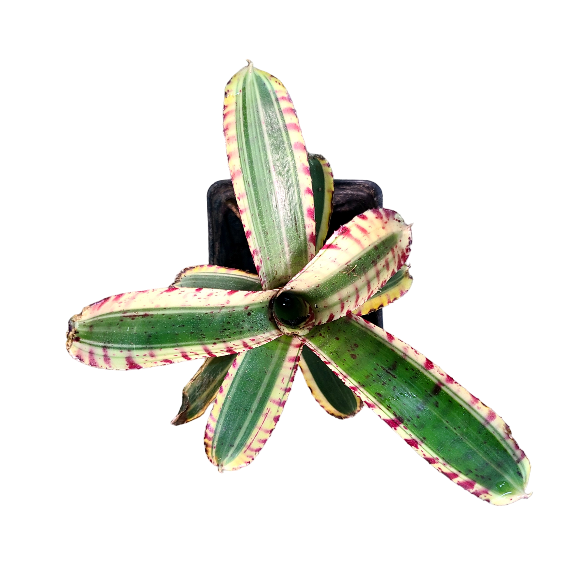 Neoregelia Toy Tiger is a small-sized bromeliad that is perfect for a 10 to 20 gallon, 12x12x18 to 18x18x18 or 18x18x24 tanks. These can be used in smaller enclosures as well. This bromeliad is bright green with a beautiful white rim that has awesome pink stripes. Bromeliads are epiphytic and will send roots out in order to attach to other plants, rocks, or backgrounds. Bromeliads also hold water in their leaves, providing deposition sites for tadpoles. For this reason, we do not recommend planting this Bromeliad in the substrate; if they are watered from the bottom and top, the core can rot. Many dart frogs, especially Oophaga, rely on these plants (and film canisters in captivity) for breeding. Bromeliads form pups from the mature plant and will clump together. Please add fresh water to your bromeliads at least weekly, and allow them adequate ventilation. If you do not have ventilation, we do not recommend keeping them fully filled with water.