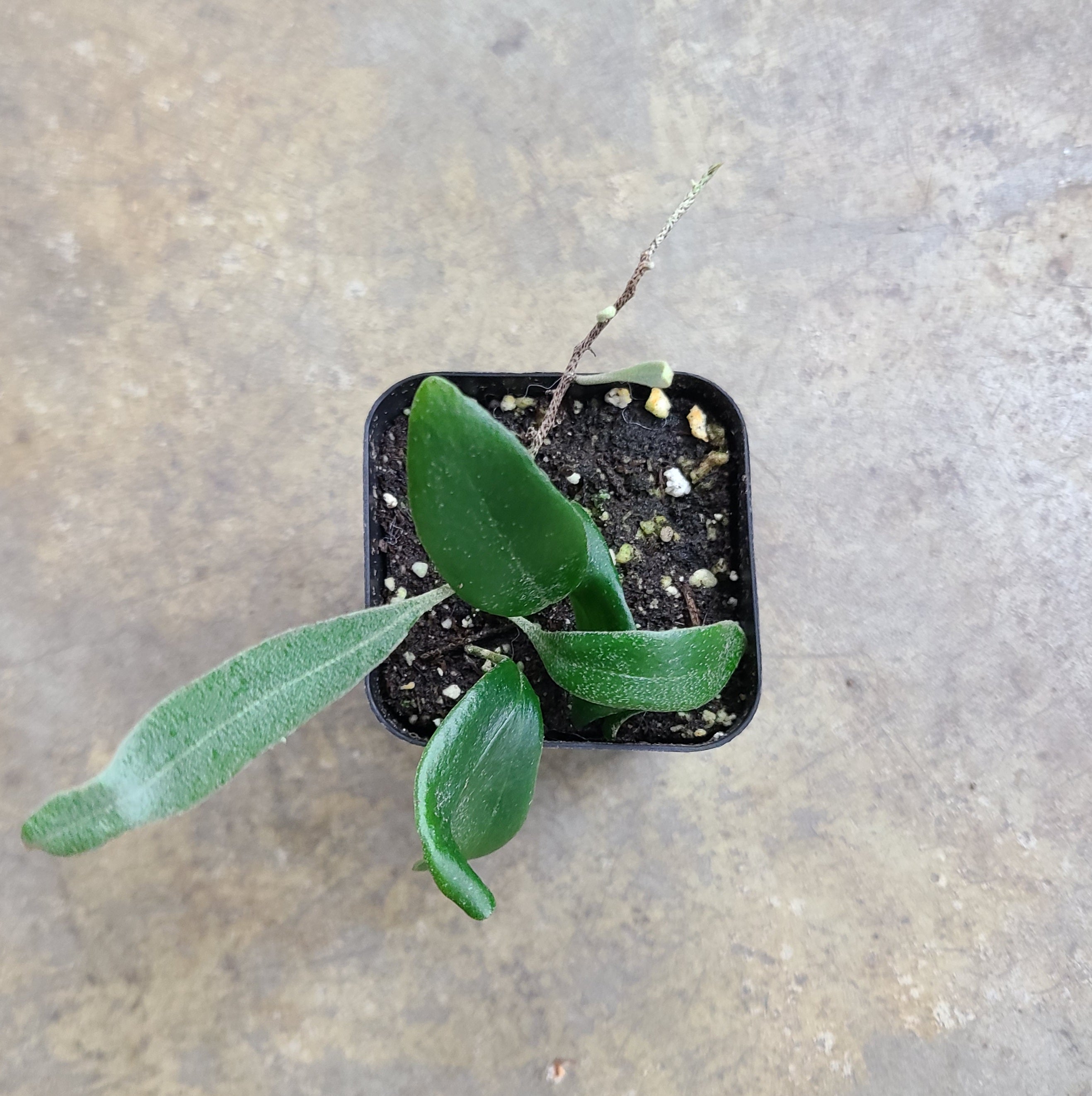 Pyrrosia cf. serpens is a micro fern. It has flat, thick green fronds with small white hairs and spreads via a creeping rhizome. This plant does well epiphityically and and a ground sprawler. Like other micro ferns (microferns), it is slow to grow. It does well in moderate, indirect light and high humidity. Moist soil and moist but not wet sphagnum moss are helpful for rooting this species.