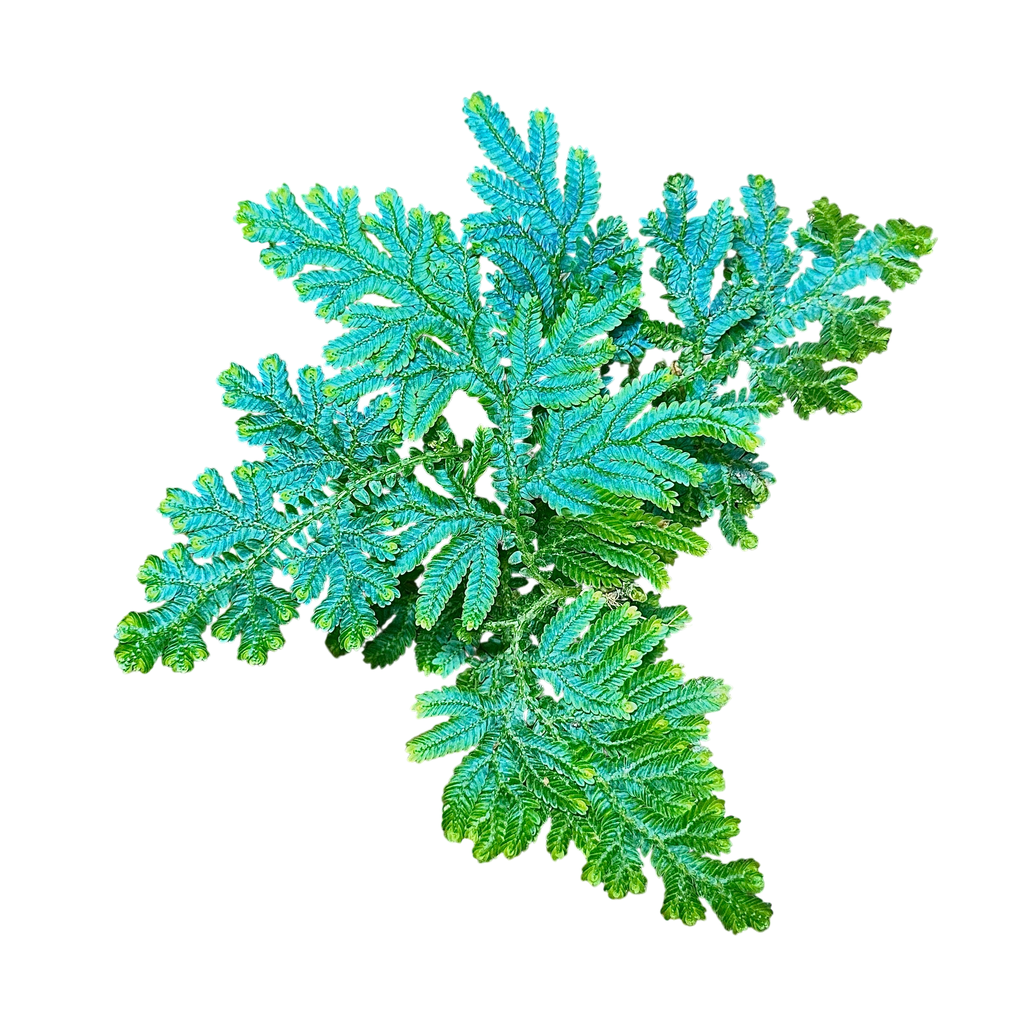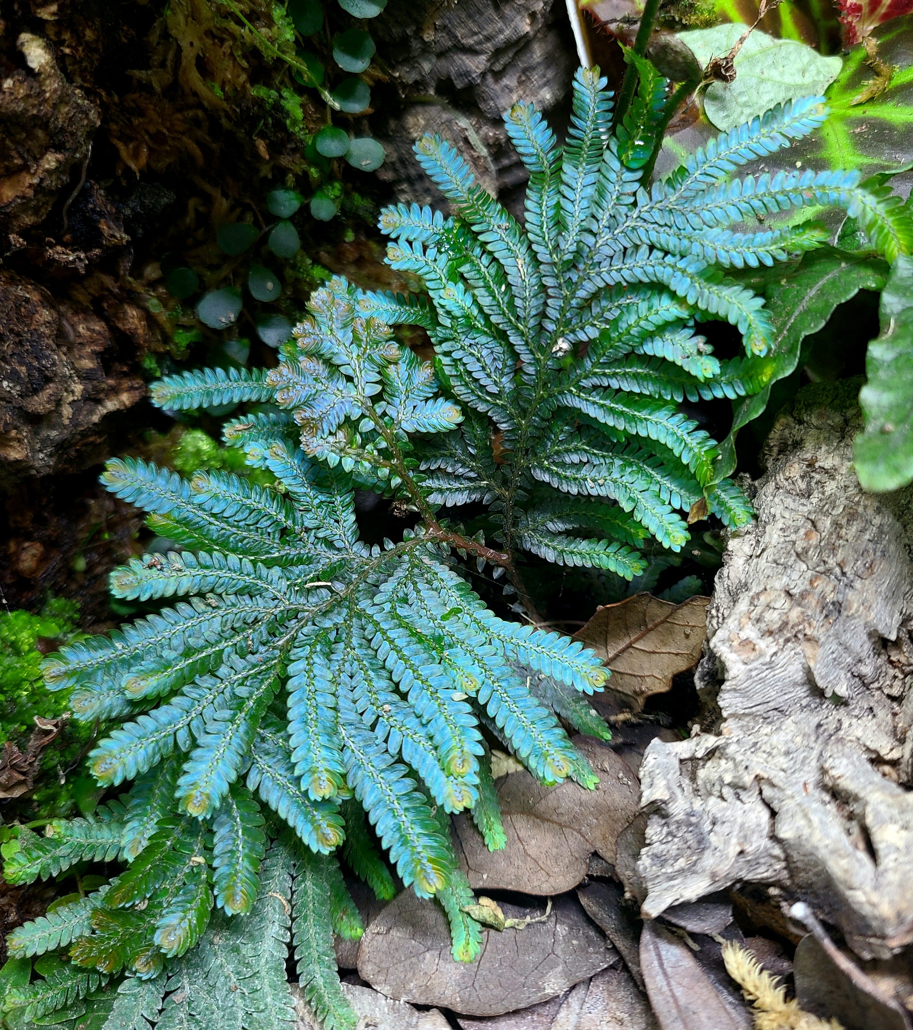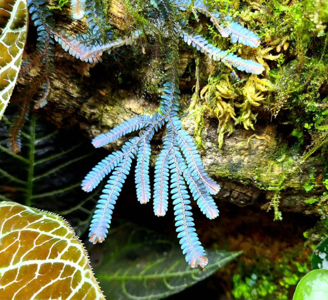 Selaginella willdenowii is a spikemoss native to Malaysia and Thailand. It has intense blue hues and ours has a sprawling growth pattern unlike some of the upright forms. We are still looking into this. It has beautiful aerial roots in high humidity environments. This plant enjoys moderate to low light and moderate humidity. Placing this plant on top of moist Sphagnum moss is helpful for rooting it.