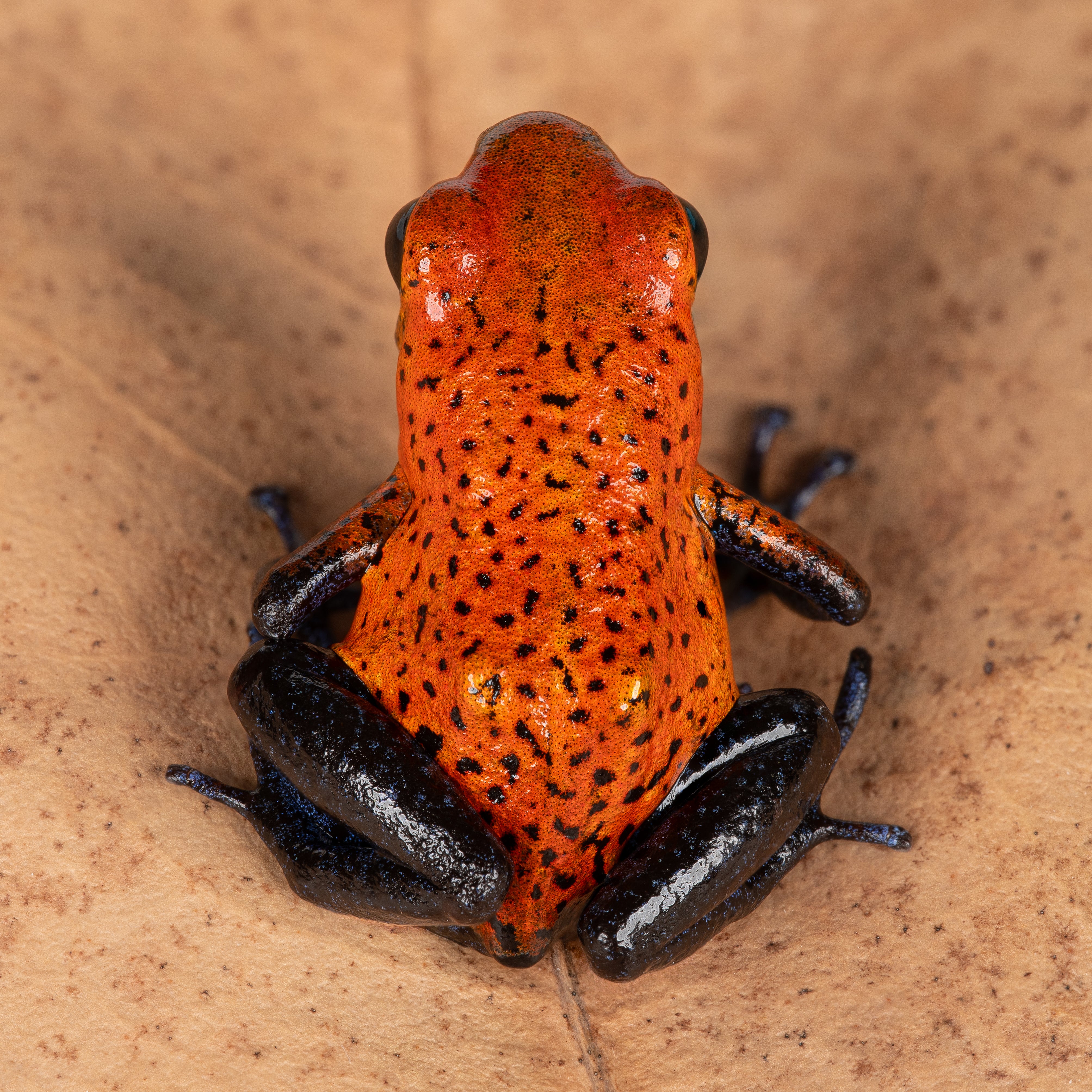 Oophaga typographica "Blue Jeans" is a small poison dart frog that inhabits the premontane slopes in Nicaragua through Costa Rican lowlands up to 900 m and into northwestern Panama. They do fine in small groups, but do best as a pair or trio when sexual maturity is reached. The males often have control of 1 to 5 square meters of territory in the wild, so rival males may display aggression for supremacy. They usually lay 3 to 10 eggs on glossy leaves, on glass, or sometimes in leaf litter. Tadpoles must be raised by adults because they feed on infertile eggs from the female. These dart frogs are interesting to many hobbyists because they exhibit biparental care. No more than a trio should go in a 20 gallon vertical conversion tank or a 18 x 24 Exo-terra enclosure. Additional information can be found, of course, through our complimentary Encyclopedia Database: DendroKnow Project.