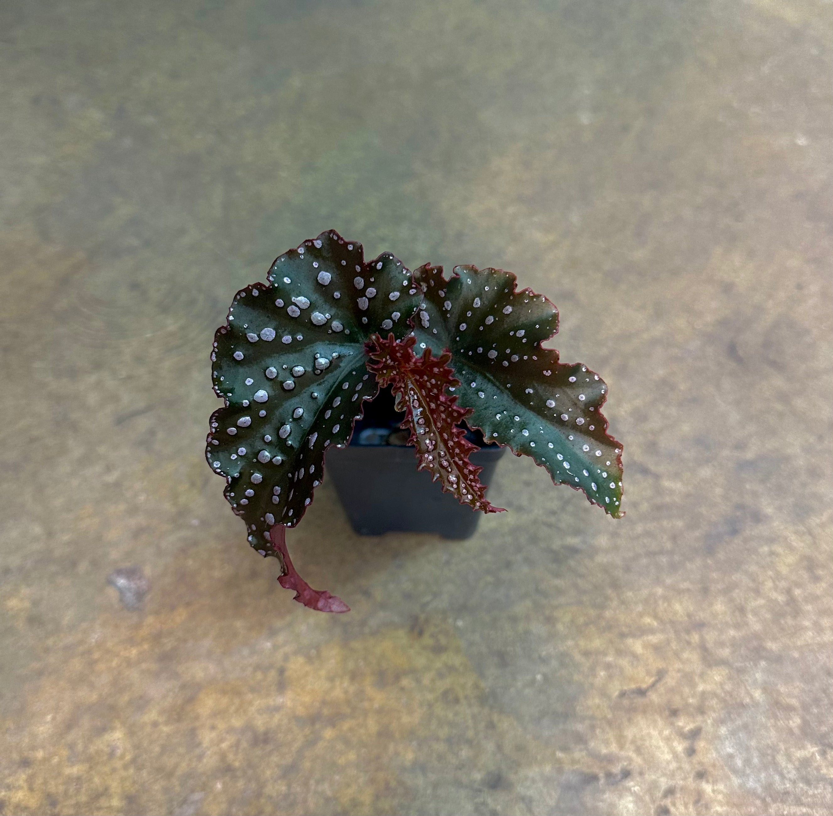Begonia Maurice Amy is a type of angel wing Begonia, which are cane Begonias. These have a brilliant dark green color with white spots. They are easy-going plants that can grow to sizable specimens, even in vivarium culture. They enjoy moderate humidity and moderate to bright light once established.