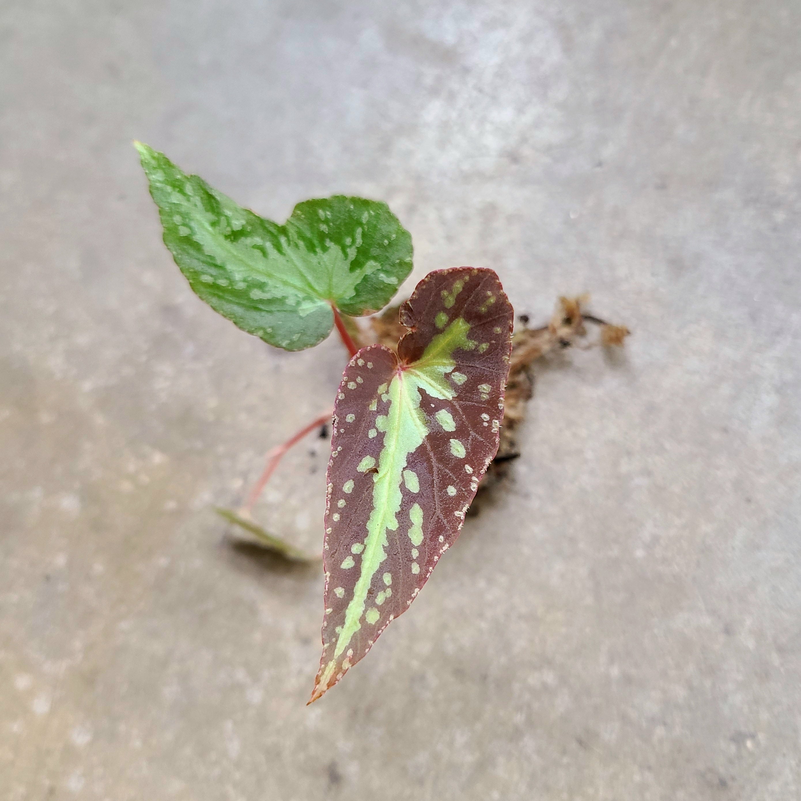 Begonia variabilis is an uncommon, moderate growing species of tuberous Begonia. It can go dormant and forms tubers. Tubers can be stored in high humidity but do not need to be wet. This species is native from Thailand to Peninsula Malaysia. The leaves are amazing with their green and white speckling. It does well in moderate, indirect light and moderate to high humidity, and appreciates some airflow. Moist soil and sphagnum moss are helpful for rooting this species. Cuttings shipped bareroot with slightly moist Sphagnum moss in plastic. Rooted specimens ship in pot or bareroot / plug depending on conditions and location.