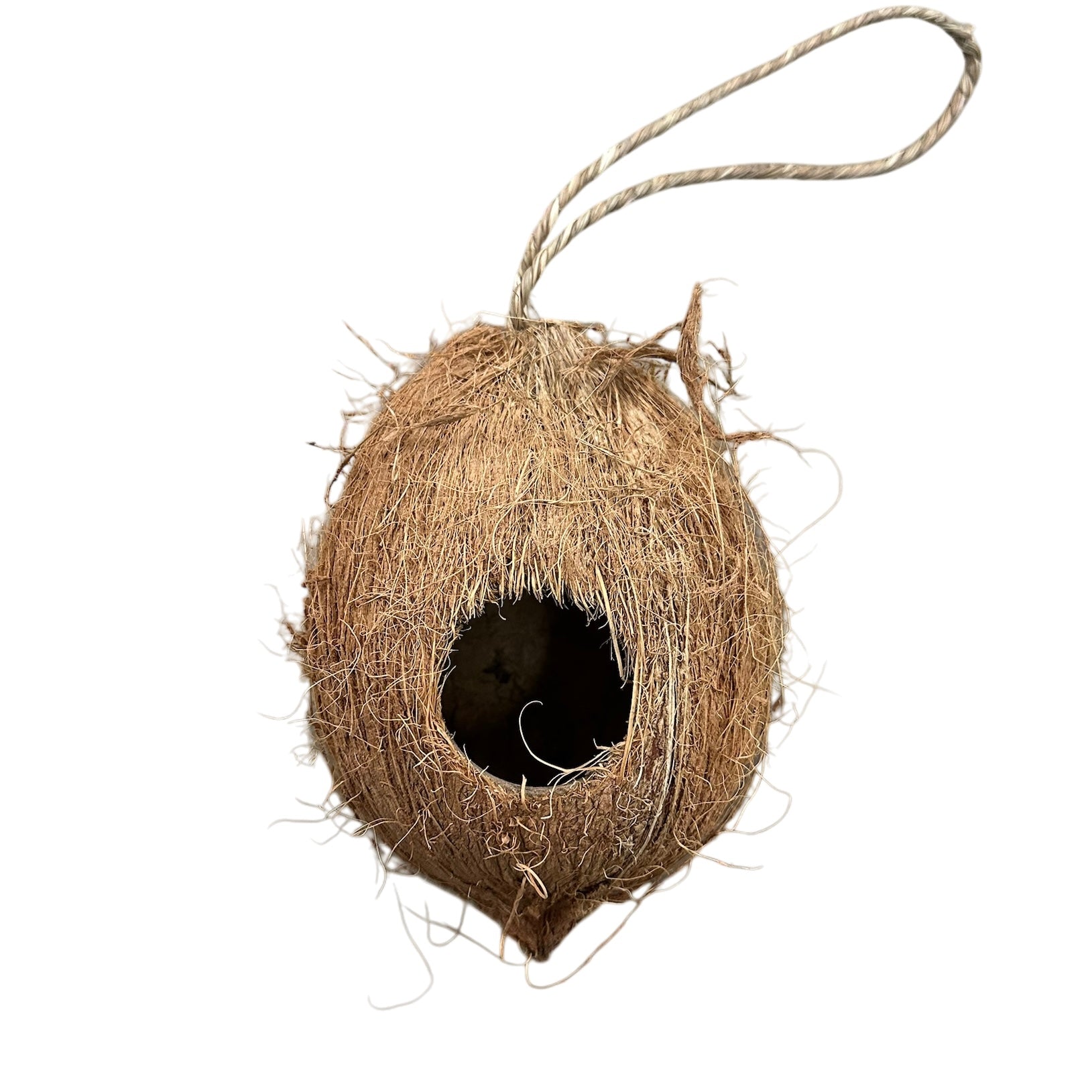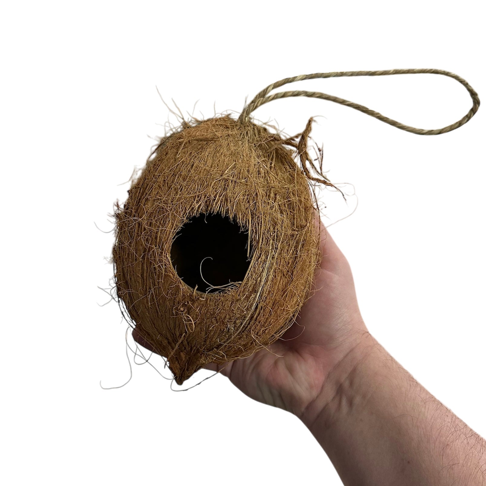 Coconut Hanging Hides are hollowed coconuts on strings! You can hang these for natural enrichment of your pet! This is a natural product and may vary in size, shape, and color.