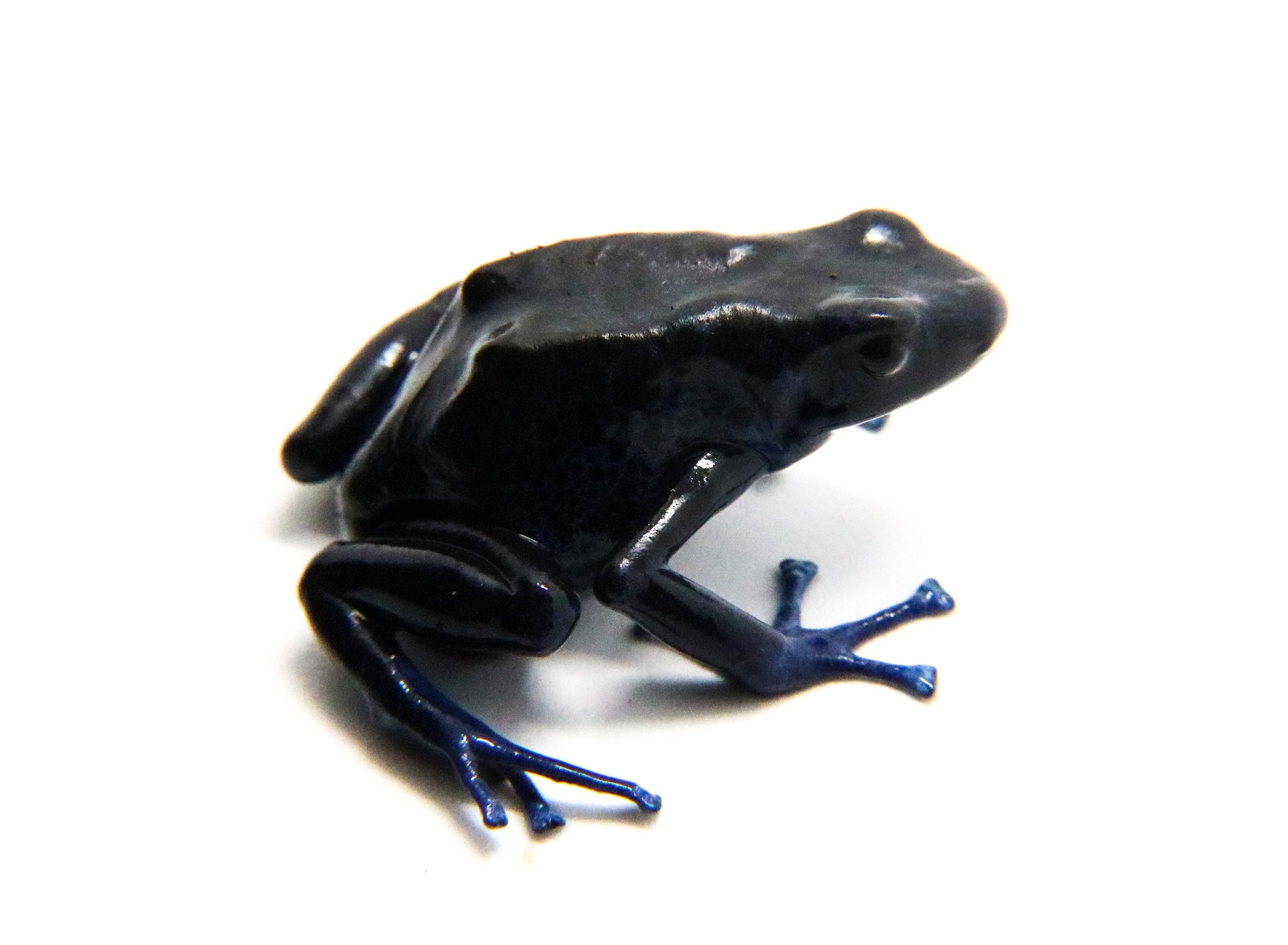 Dendrobates tinctorius “Koetari / Kutari River” is found in between Surinam and Guyana near the Kutari River. They are often a very dark blue, as shown, but can have lighter blue banding and reticulation on the dark blue body as well. These frogs can only be housed in groups as juveniles to sub adults, and even then it becomes risky as they near adulthood. Most of the issues arise from female to female aggression. All tinctorius are very territorial, and defend large areas in the wild. Females are aggressive, and fight for dominance over access to males. There has been plenty of empirical evidence of male on female aggression as well, with the female as the aggressor. A trio is the maximum size for a 55-75 gallon tank, but this is usually not advised. Please do not place more than two in one enclosure at adulthood, unless it is a 2.1.0 (two males and one female). As a pair, the female will usually lay 4 to 10 eggs on glossy leaves, but they can have larger clutches. Thick leaves (such as Philodendron, Costus, etc), thick leaf litter (such as magnolia), or a petri dish underneath a coconut hut works well for breeding. Please let us know if you have any questions. Additional information can be found, of course, through our complimentary Encyclopedia Database: DendroKnow Project.