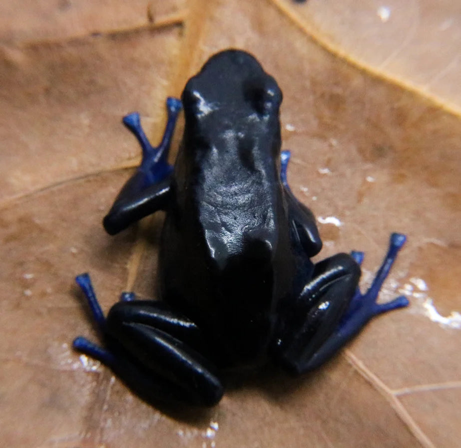 Dendrobates tinctorius “Koetari / Kutari River” is found in between Surinam and Guyana near the Kutari River. They are often a very dark blue, as shown, but can have lighter blue banding and reticulation on the dark blue body as well. These frogs can only be housed in groups as juveniles to sub adults, and even then it becomes risky as they near adulthood. Most of the issues arise from female to female aggression. All tinctorius are very territorial, and defend large areas in the wild. Females are aggressive, and fight for dominance over access to males. There has been plenty of empirical evidence of male on female aggression as well, with the female as the aggressor. A trio is the maximum size for a 55-75 gallon tank, but this is usually not advised. Please do not place more than two in one enclosure at adulthood, unless it is a 2.1.0 (two males and one female). As a pair, the female will usually lay 4 to 10 eggs on glossy leaves, but they can have larger clutches. Thick leaves (such as Philodendron, Costus, etc), thick leaf litter (such as magnolia), or a petri dish underneath a coconut hut works well for breeding. Please let us know if you have any questions. Additional information can be found, of course, through our complimentary Encyclopedia Database: DendroKnow Project.
