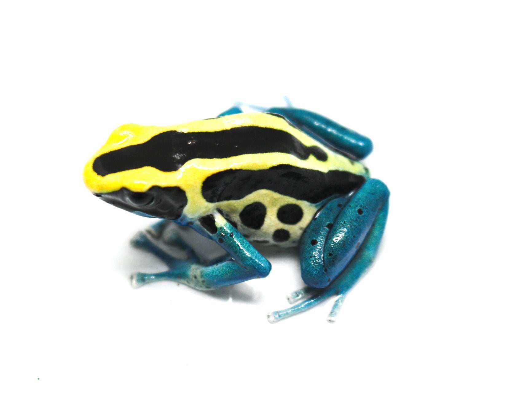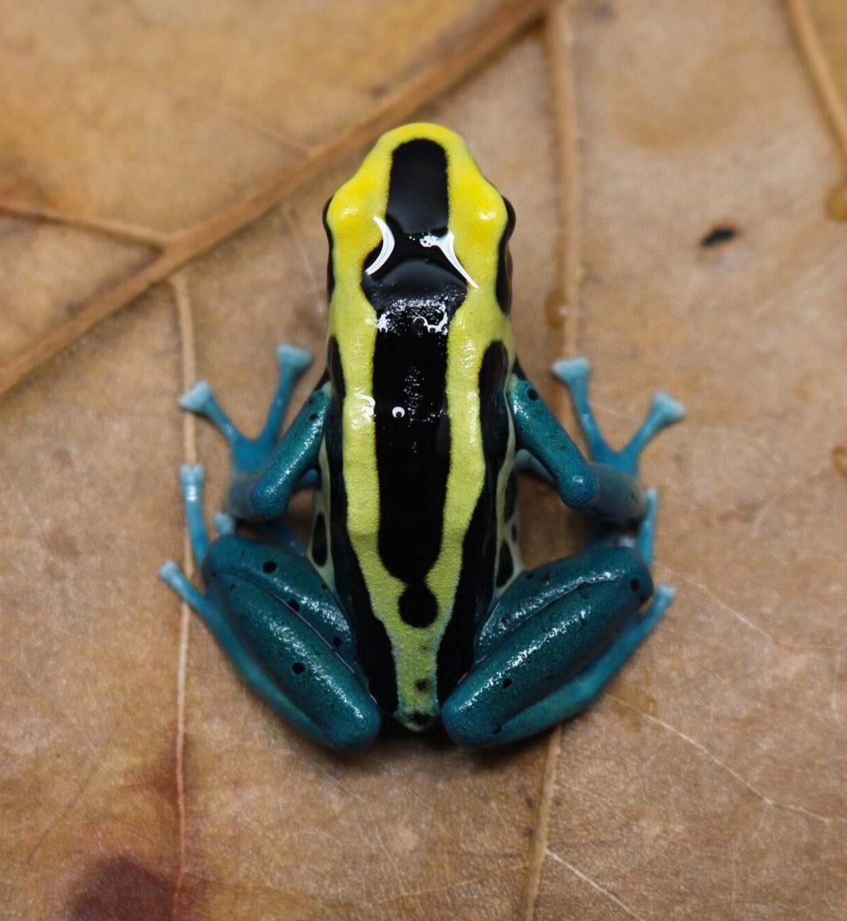Dendrobates tinctorius "Patricia" hail from Suriname and Brazil. These frogs can only be housed in groups as juveniles to sub adults, and even then it becomes risky as they near adulthood. Most of the issues arise from female to female aggression. All tinctorius are very territorial, and defend large areas in the wild. Females are aggressive, and fight for dominance over access to males. There has been plenty of empirical evidence of male on female aggression as well, with the female as the aggressor. A trio is the maximum size for a 55-75 gallon tank, but this is usually not advised. Please do not place more than two in one enclosure at adulthood, unless it is a 2.1.0 (two males and one female). As a pair, the female will usually lay 4 to 10 eggs on glossy leaves, but they can have larger clutches. Thick leaves (such as Philodendron, Costus, etc), thick leaf litter (such as magnolia), or a petri dish underneath a coconut hut works well for breeding. Please let us know if you have any questions. Additional information can be found, of course, through our complimentary Encyclopedia Database: DendroKnow Project.