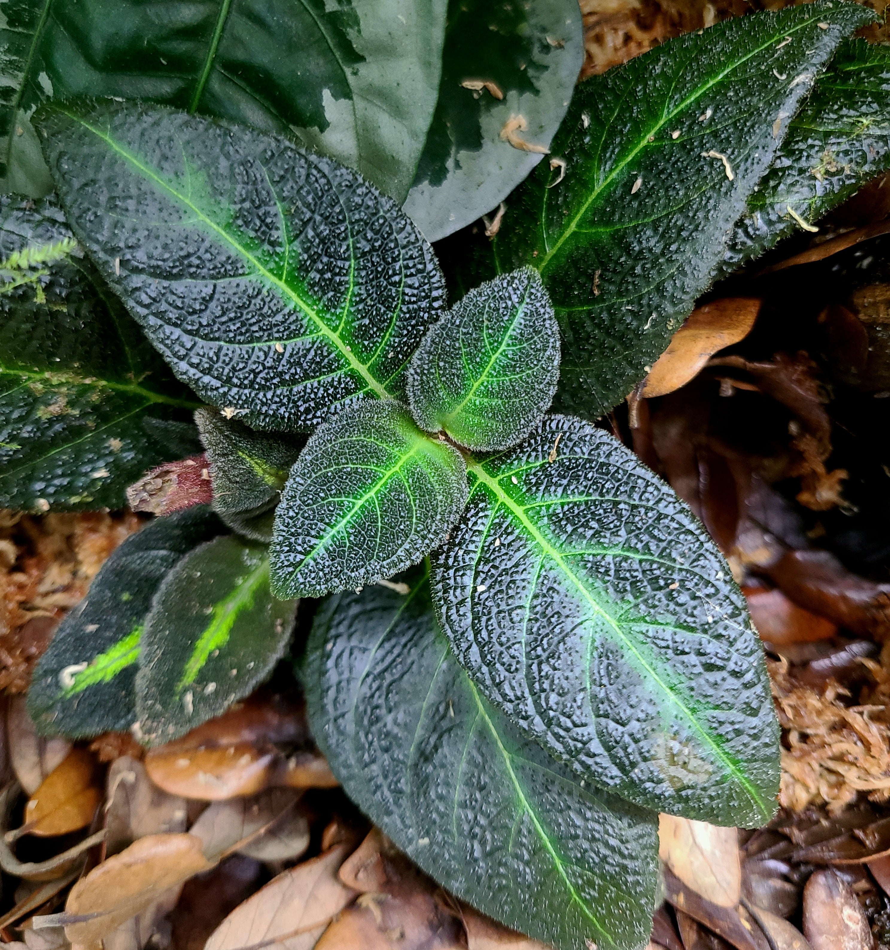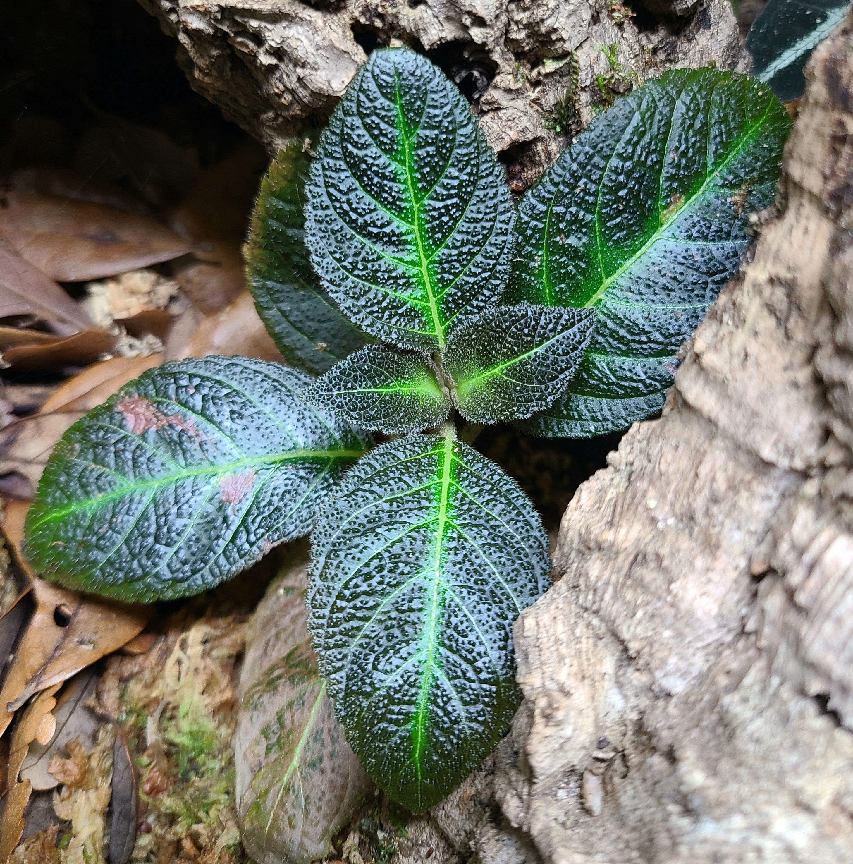 Pearcea sp. Black / Black Edge is a type of Gesneriad native to Ecuador and Panama. It is known for its stunning leaves that have tiny trichomes all across the leaf blade and year-round blooming capabilities. It is adaptable to the vivarium life, and does well in moist, but not wet, conditions. It enjoys high light and does not like standing water on its leaves. It is easily propagated in sphagnum moss.