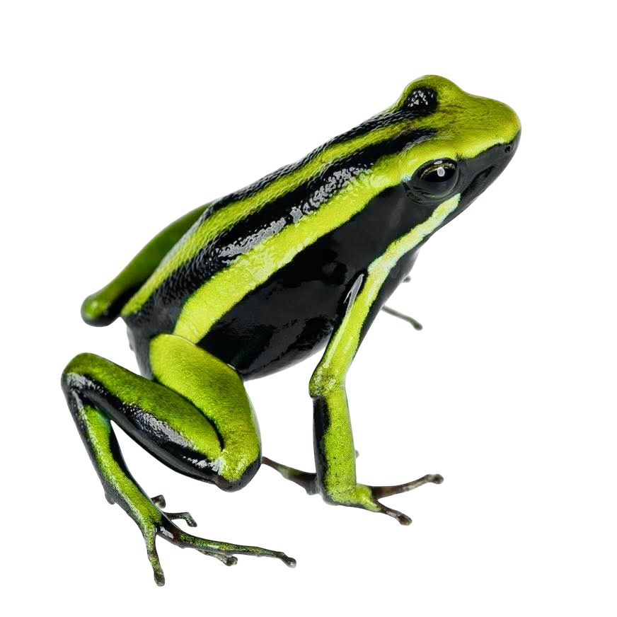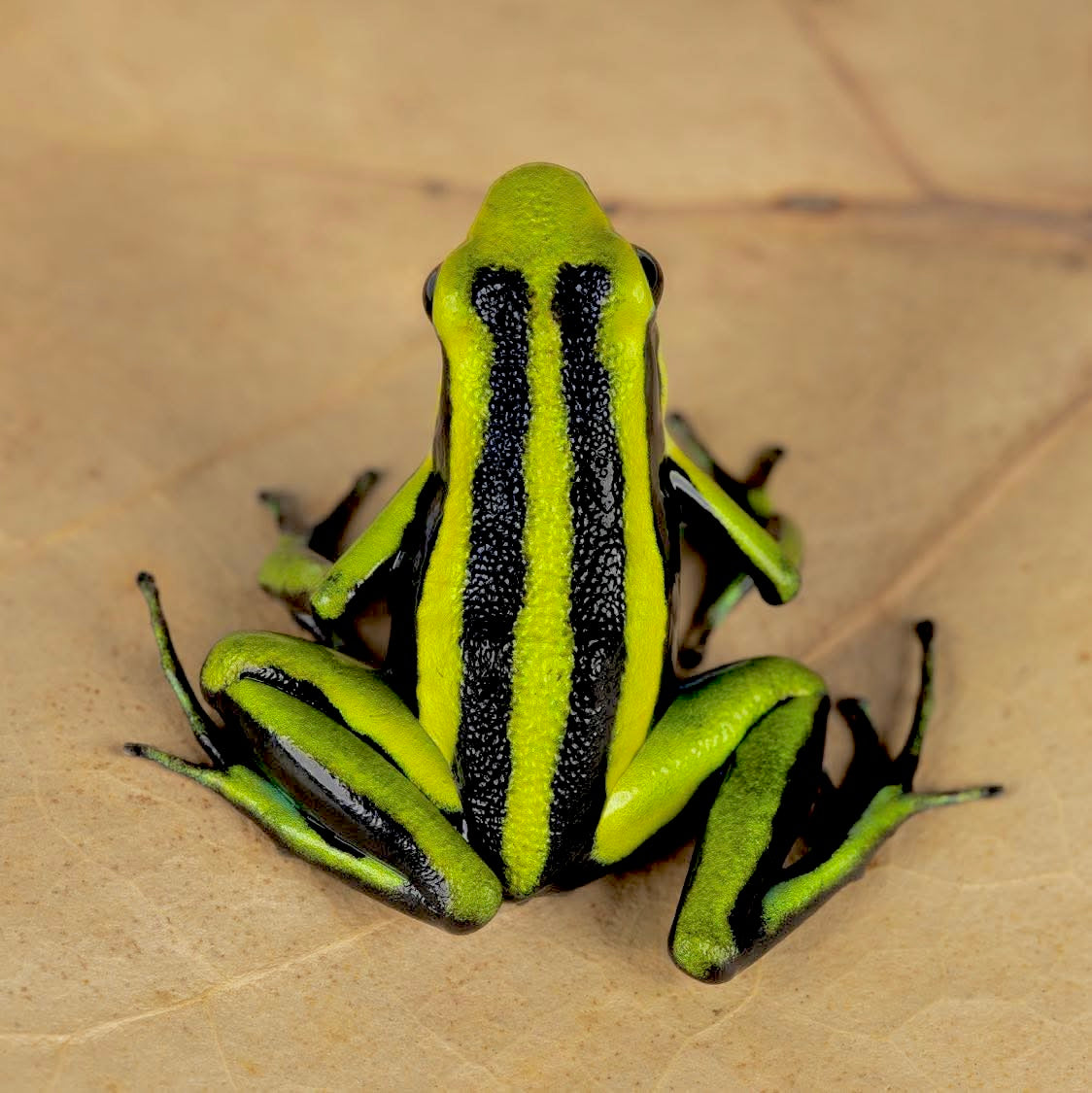 Ameerega trivittata Huallaga Canyon are found in Peru. These frogs are very beautiful and are dark black with bright yellow-green lines. These frogs are moderately shy to bold depending on age, and can do moderately well in groups, provided that the enclosure is large enough. It is recommended that no more than 2 go into a 10 gallon tank, 3 in a 20 gallon tank, and 4-5 in a 40 gallon tank. There can be some aggression and wrestling, but it is usually minor. Females will generally lay 10 to 20 eggs under leaf litter, on foliage, or under a coconut hut with flat leaves or a petri dish underneath. The frogs will transport tadpoles if left alone. Additional information can be found, of course, through our complimentary Encyclopedia Database: DendroKnow Project.