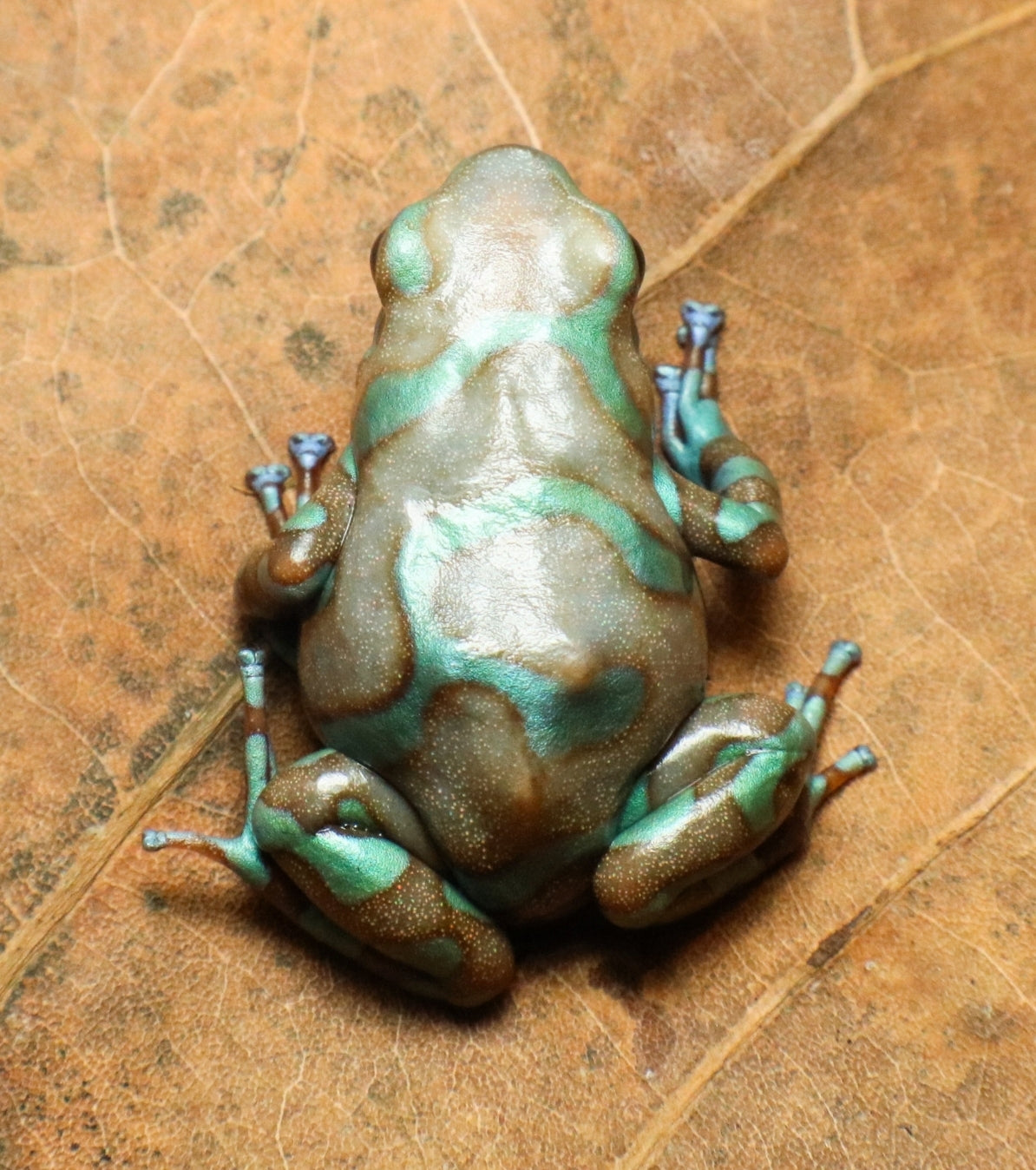 Dendrobates auratus "Highland Bronze" hail from Panama, predominantly up and down the Atlantic Coast. This frog is moderately shy, and does well in groups. They get bolder with age and exposure, like others of their species. There will be some aggression and wrestling between females, while males do not tend to partake in fighting often. Despite this, you can keep a decently large group of frogs together, even as adults, provided that there are plenty of hiding places and food available. Females will generally lay 4 to 10 eggs under leaf litter or a coconut hut with flat leaves or a petri dish underneath. They will then transport tadpoles to a body of water, like tinctorius. However, you may pull the eggs and raise them yourself. If left alone, the tadpoles will cannibalize. Please let us know if you have any questions. Additional information can be found, of course, through our complimentary Encyclopedia Database: DendroKnow Project.
