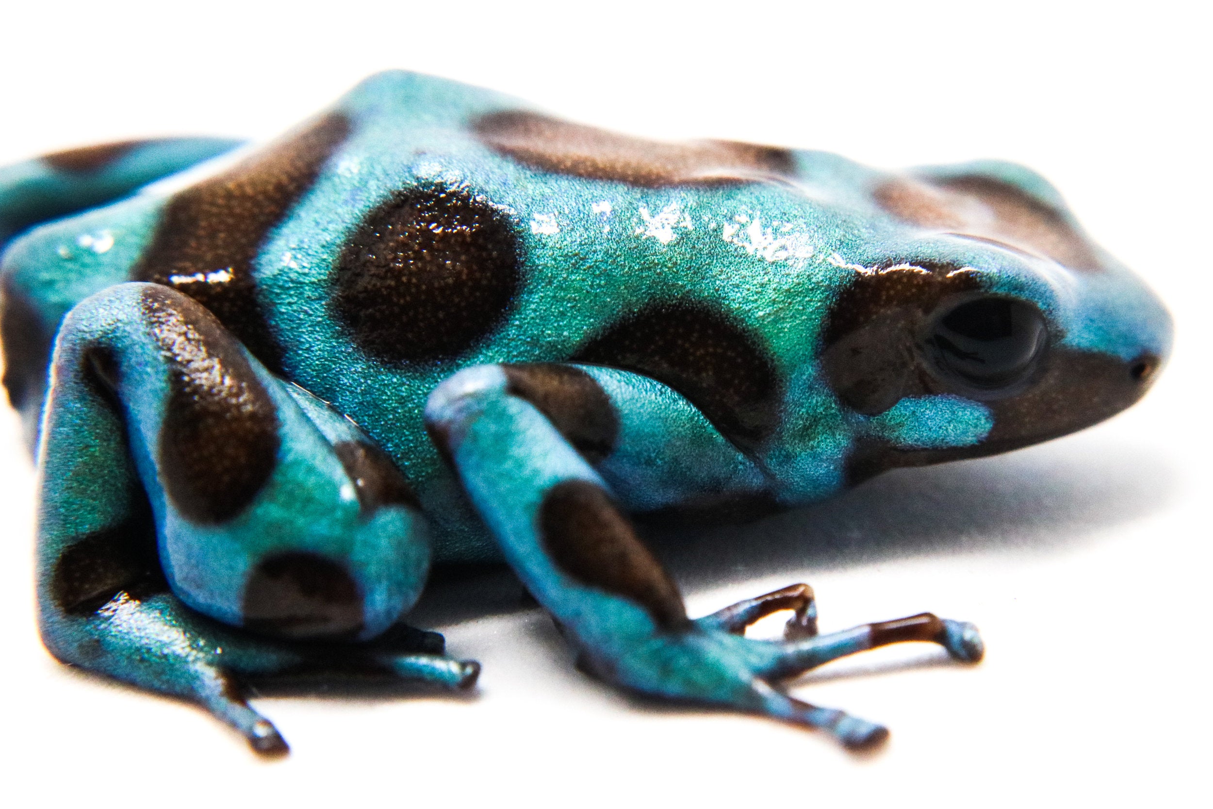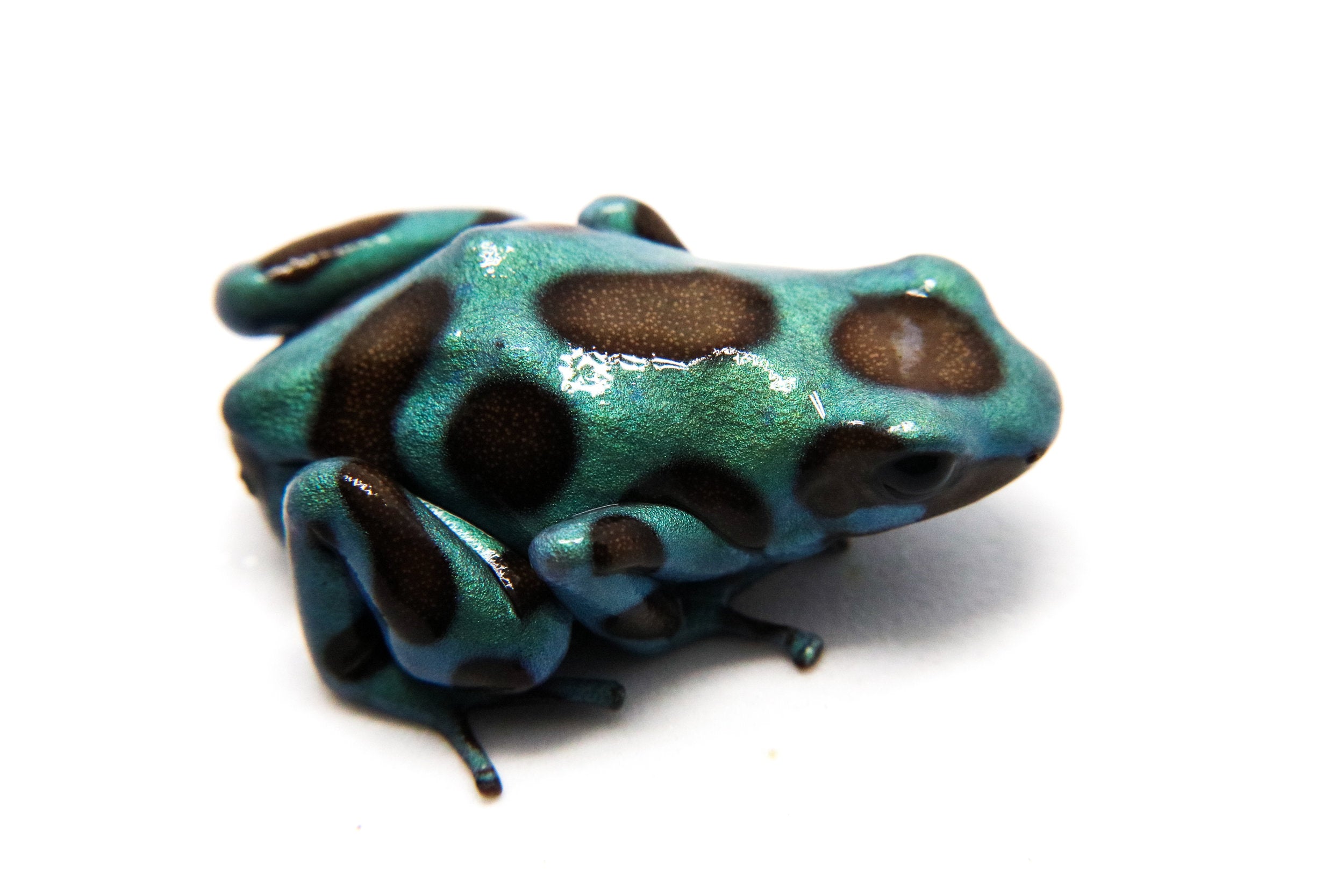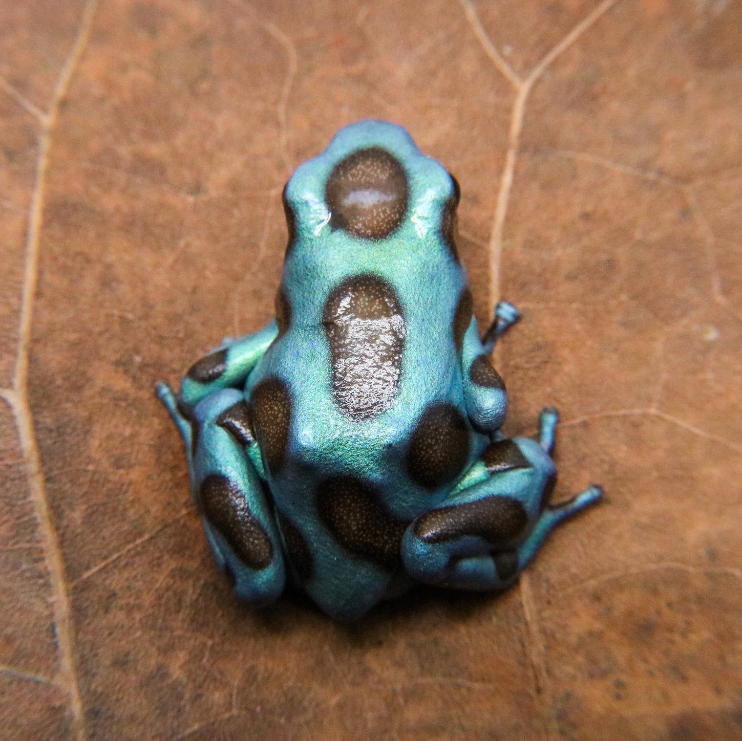 Dendrobates auratus "Green and Bronze" hail from Panama. These frogs were brought in during the early 2000s and selected by color; their true locale is not known (farm raised). These frogs have beautiful turquoise bodies, with a metallic bronze reticulation. This frog is moderately shy, and does well in groups. They get bolder with age and exposure, like others of their species. There will be some aggression and wrestling between females, while males do not tend to partake in fighting often. Despite this, you can keep a decently large group of frogs together, even as adults, provided that there are plenty of hiding places and food available. Females will generally lay 4 to 10 eggs under leaf litter or a coconut hut with flat leaves or a petri dish underneath. They will then transport tadpoles to a body of water, like tinctorius. However, you may pull the eggs and raise them yourself. If left alone, the tadpoles will cannibalize. Please let us know if you have any questions. Additional information can be found, of course, through our complimentary Encyclopedia Database: DendroKnow Project.
