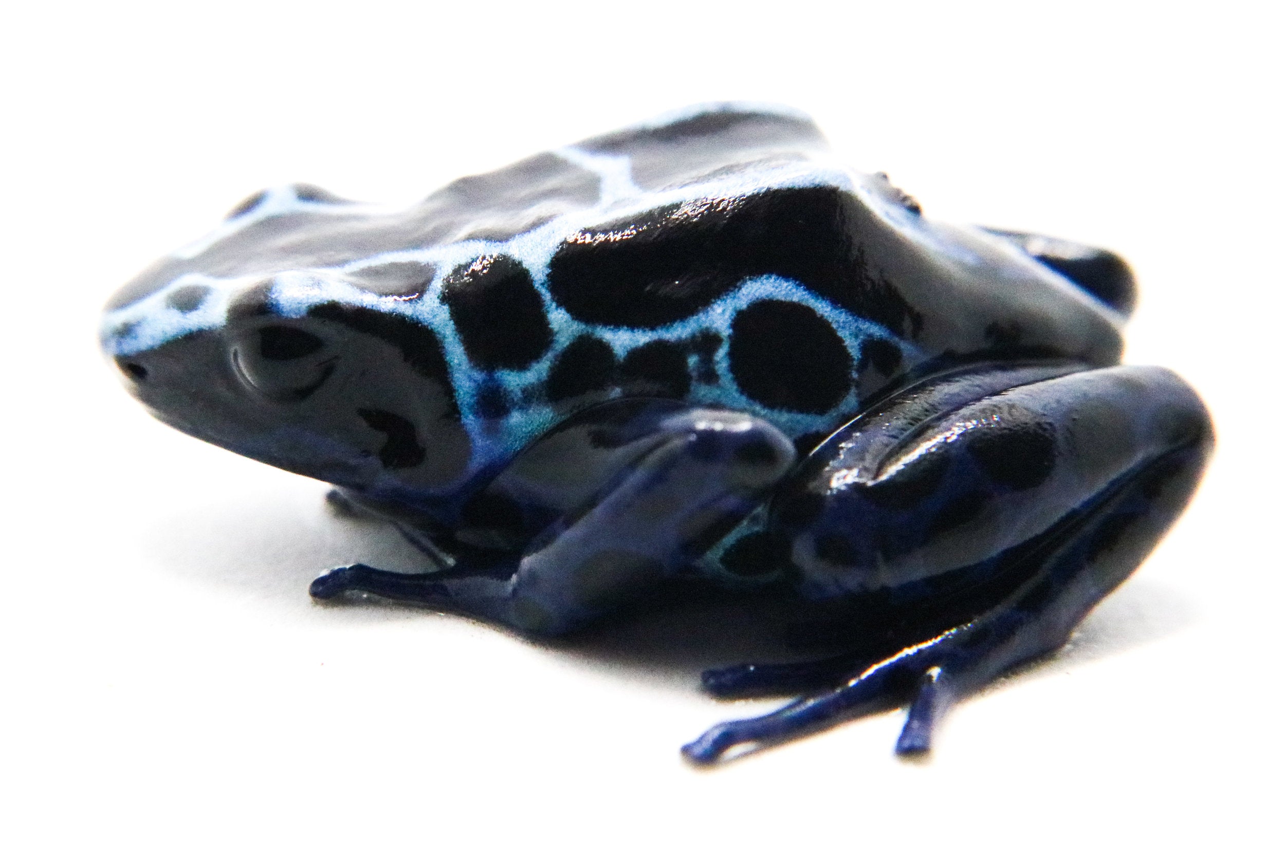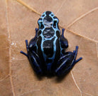 Dendrobates tinctorius “New River” is found in between Surinam and Guyana near the Kutari River. These frogs can only be housed in groups as juveniles to sub adults, and even then it becomes risky as they near adulthood. Most of the issues arise from female to female aggression. All tinctorius are very territorial, and defend large areas in the wild. Females are aggressive, and fight for dominance over access to males. There has been plenty of empirical evidence of male on female aggression as well, with the female as the aggressor. A trio is the maximum size for a 55-75 gallon tank, but this is usually not advised. Please do not place more than two in one enclosure at adulthood, unless it is a 2.1.0 (two males and one female). As a pair, the female will usually lay 4 to 10 eggs on glossy leaves, but they can have larger clutches. Thick leaves (such as Philodendron, Costus, etc), thick leaf litter (such as magnolia), or a petri dish underneath a coconut hut works well for breeding. Please let us know if you have any questions. Additional information can be found, of course, through our complimentary Encyclopedia Database: DendroKnow Project.