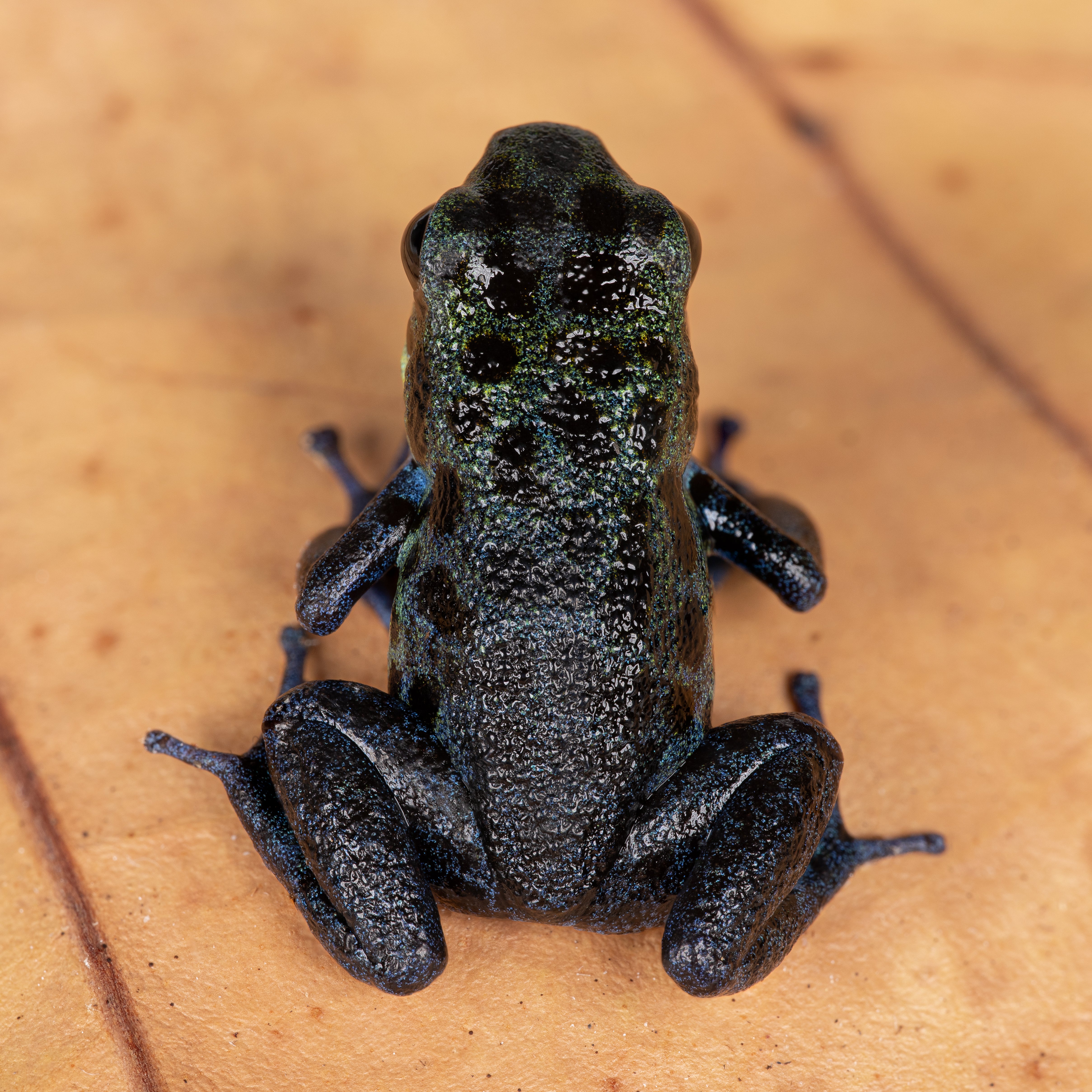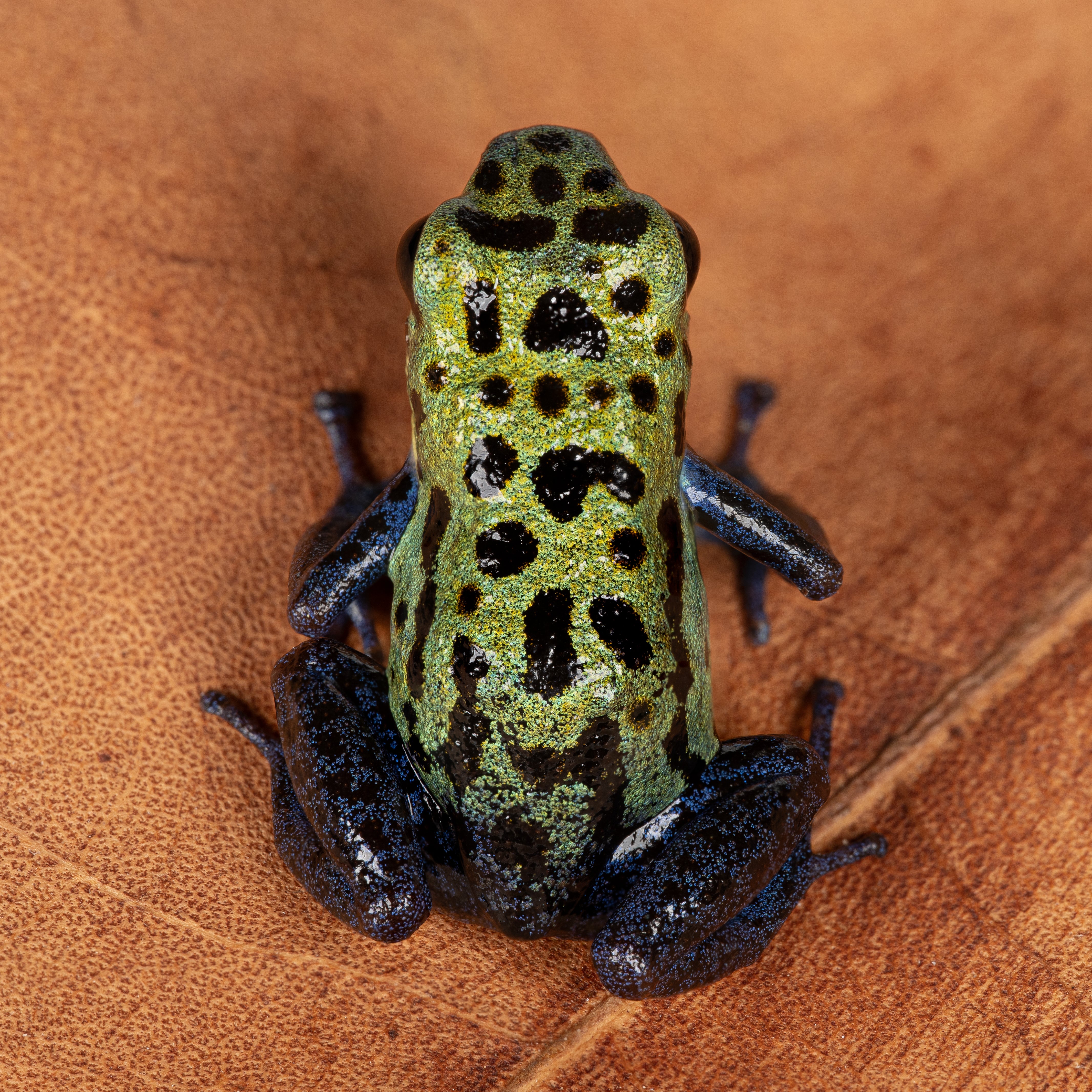 Oophaga pumilio "Inland Colubre / Culubre is a small poison dart frog that inhabits the mainland of the Bocas del Toro Province, Panama. They are a sherbet yellow to blue and every shade in between. They are one of the most popular frogs in our possession. They do fine in small groups, but do best as a pair or trio when sexual maturity is reached. The males often have control of 1 to 5 square meters of territory in the wild, so rival males may display aggression for supremacy. They usually lay 3 to 10 eggs on glossy leaves, on glass, or sometimes in leaf litter. Tadpoles must be raised by adults because they feed on infertile eggs from the female. These dart frogs are interesting to many hobbyists because they exhibit biparental care. No more than a trio should go in a 20 gallon vertical conversion tank or a 18 x 24 Exo-terra enclosure. Additional information can be found, of course, through our complimentary Encyclopedia Database: DendroKnow Project.