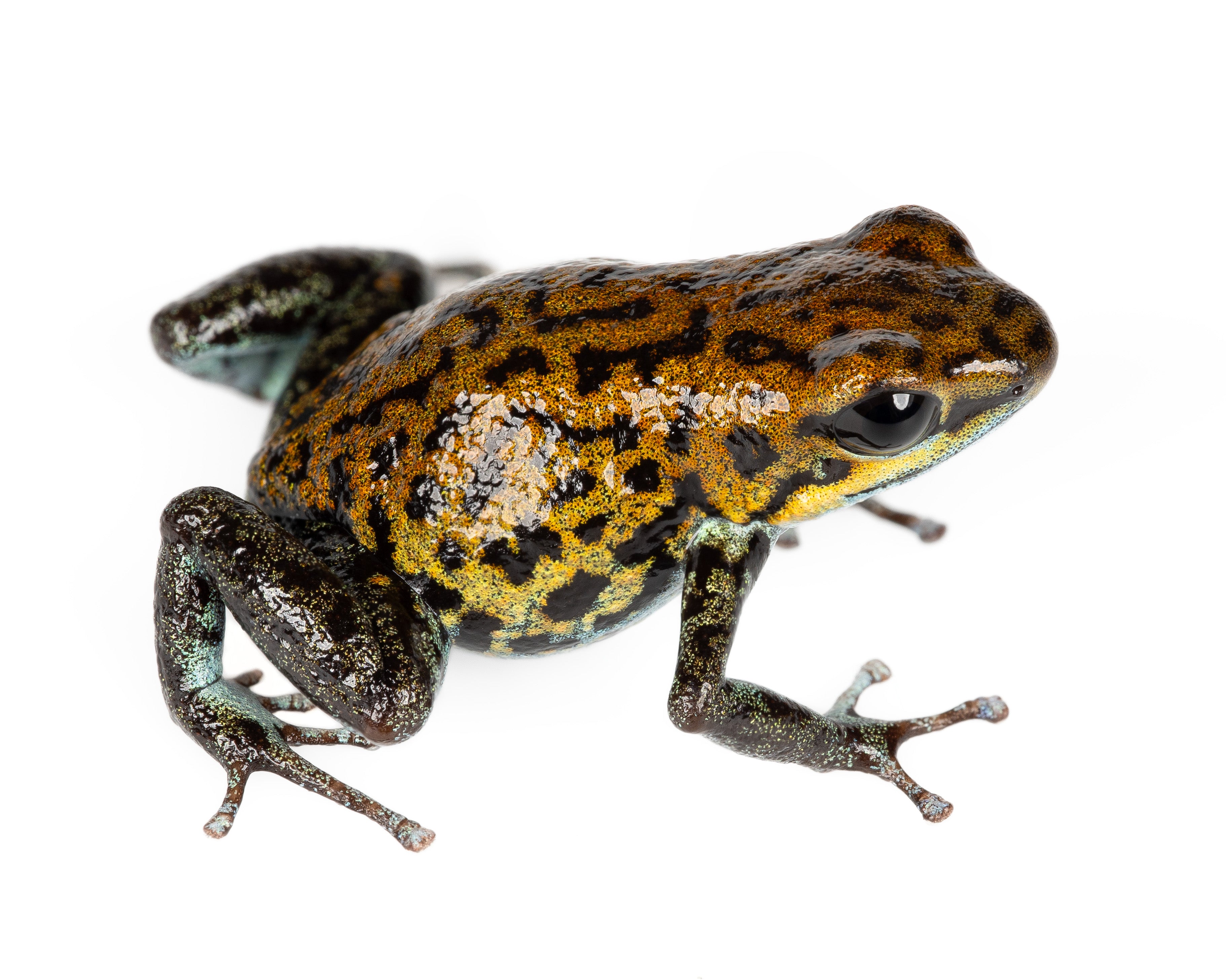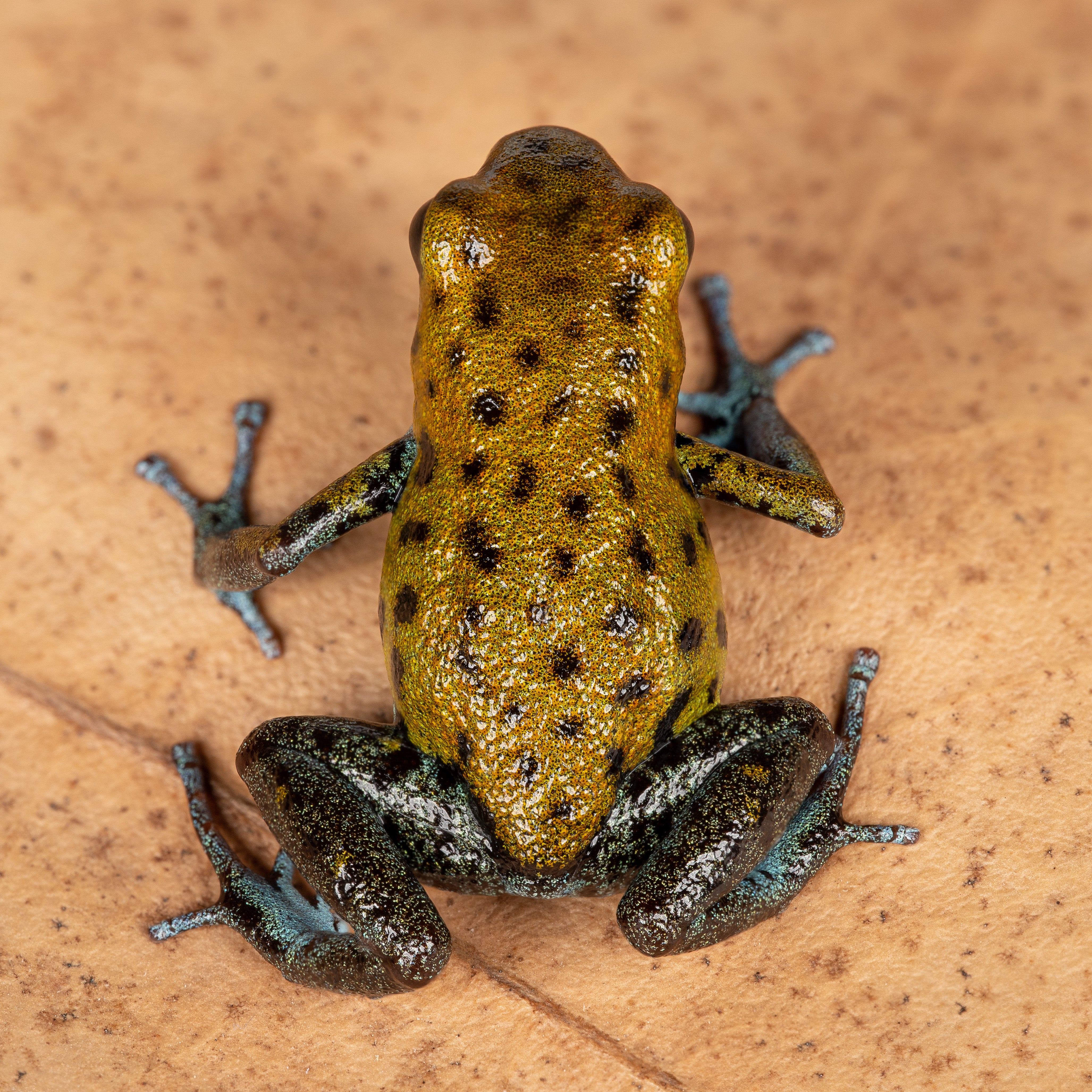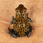 Oophaga pumilio "Kusapin"" is a small poison dart frog that inhabits Kusapin in the Bocas Del Toro region, Panama. They have darker bodies with splotched blue coloration ascending from the ventral region. They do fine in small groups, but do best as a pair or trio when sexual maturity is reached. The males often have control of 1 to 5 square meters of territory in the wild, so rival males may display aggression for supremacy. They usually lay 3 to 10 eggs on glossy leaves, on glass, or sometimes in leaf litter. Tadpoles must be raised by adults because they feed on infertile eggs from the female. These dart frogs are interesting to many hobbyists because they exhibit biparental care. No more than a trio should go in a 20 gallon vertical conversion tank or a 18 x 24 Exo-terra enclosure. Additional information can be found, of course, through our complimentary Encyclopedia Database: DendroKnow Project.