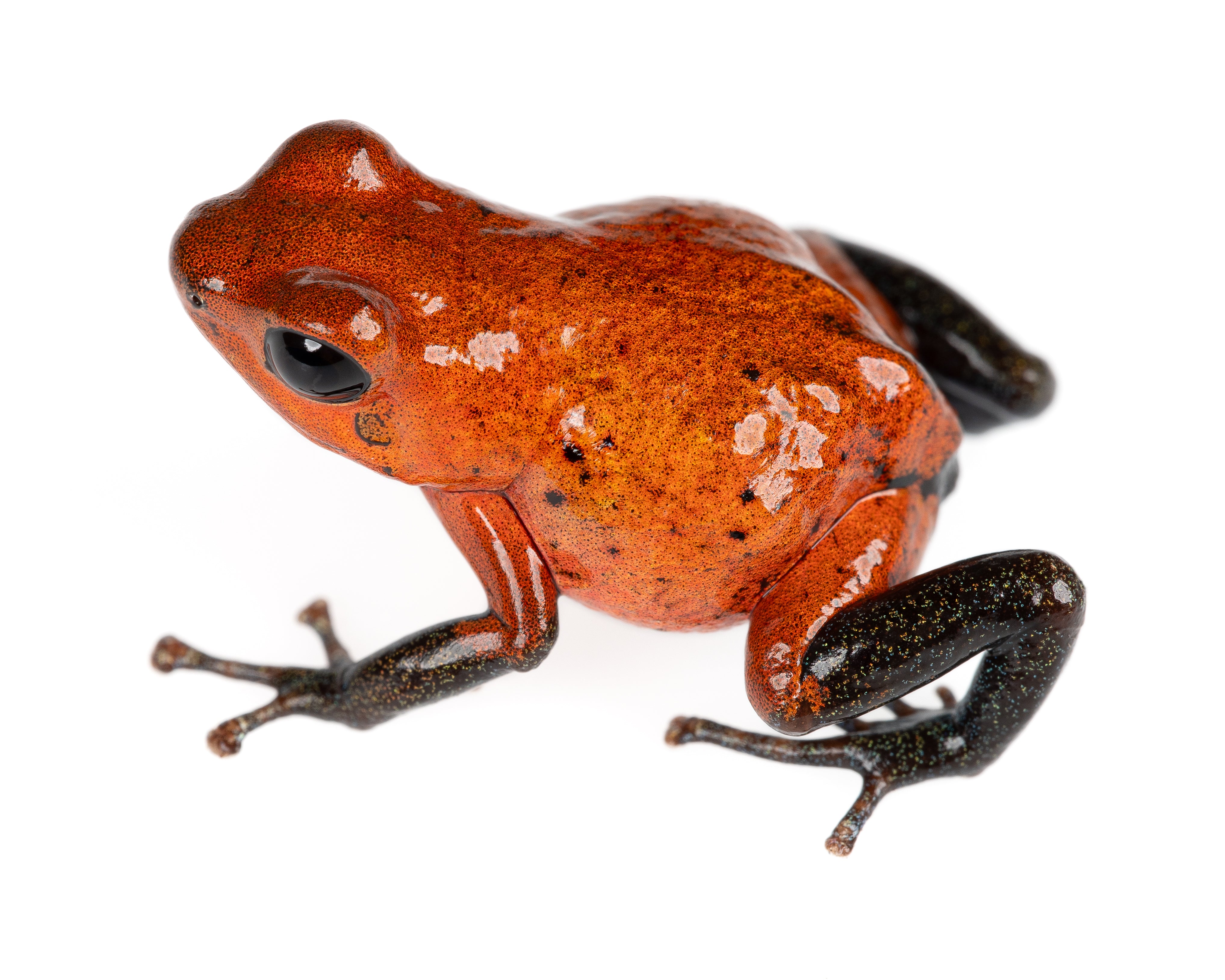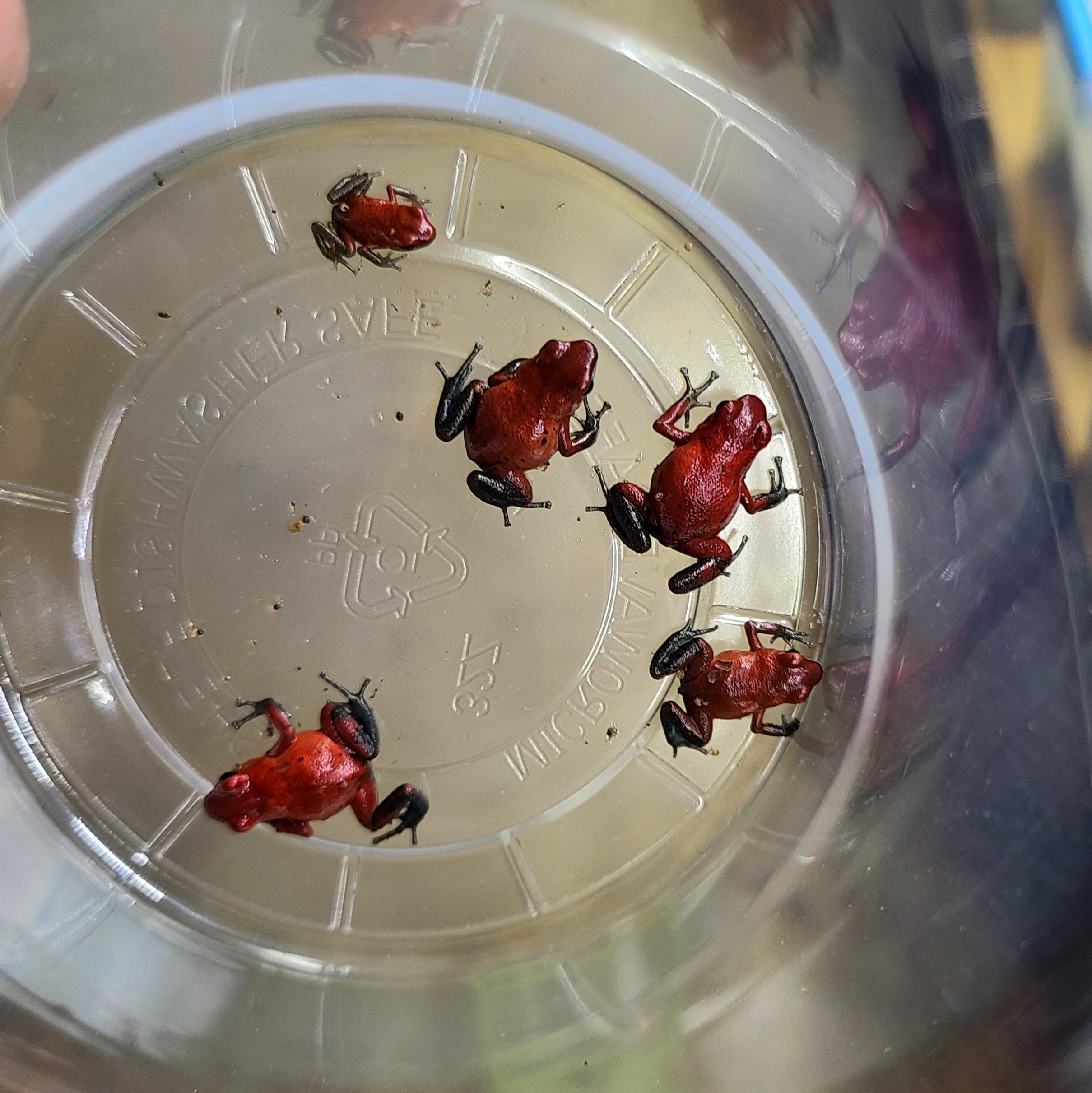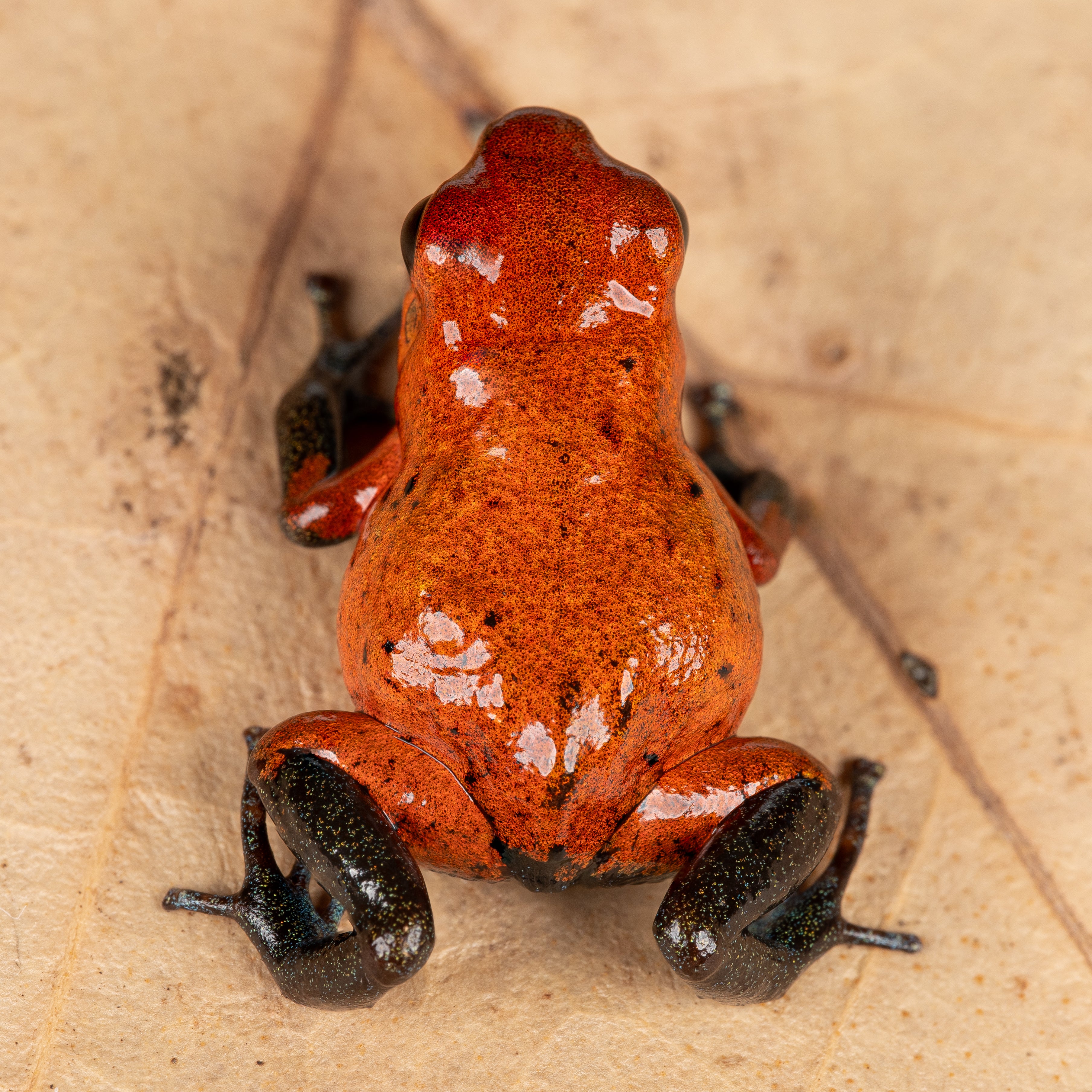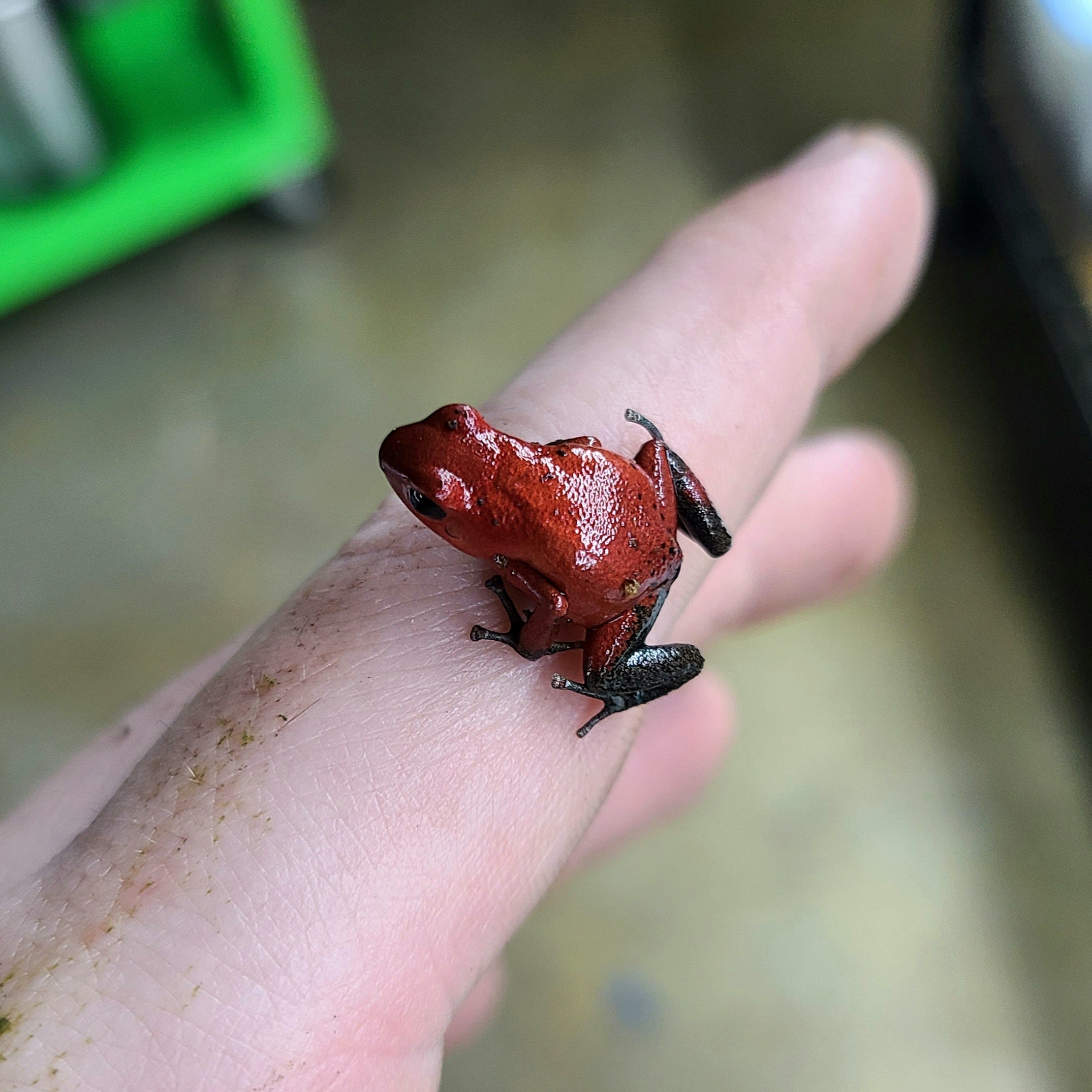 Oophaga pumilio "Man Creek" is a small poison dart frog that inhabits Panama. They are orange to red and have highly "granulated" skin for pumilio. They're incredibly rare in the hobby. They do fine in small groups, but do best as a pair or trio when sexual maturity is reached. The males often have control of 1 to 5 square meters of territory in the wild, so rival males may display aggression for supremacy. They usually lay 3 to 10 eggs on glossy leaves, on glass, or sometimes in leaf litter. Tadpoles must be raised by adults because they feed on infertile eggs from the female. These dart frogs are interesting to many hobbyists because they exhibit biparental care. No more than a trio should go in a 20 gallon vertical conversion tank or a 18 x 24 Exo-terra enclosure. Additional information can be found, of course, through our complimentary Encyclopedia Database: DendroKnow Project.