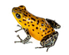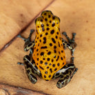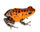 Our current stock is orange. The third picture is indicative of what you will receive. Oophaga pumilio "Pico de Chiriqui" is a small poison dart frog that has a beautiful range of phenotypic variation. They can be bright yellow to bright red, and everything in between, again, ours available now are yellow-orange. They do fine in small groups, but do best as a pair or trio when sexual maturity is reached. The males often have control of 1 to 5 square meters of territory in the wild, so rival males may display aggression for supremacy. They usually lay 3 to 10 eggs on glossy leaves, on glass, or sometimes in leaf litter. Tadpoles must be raised by adults because they feed on infertile eggs from the female. These dart frogs are interesting to many hobbyists because they exhibit biparental care. No more than a trio should go in a 20 gallon vertical conversion tank or a 18 x 24 Exo-terra enclosure. Additional information can be found, of course, through our complimentary Encyclopedia Database: DendroKnow Project.