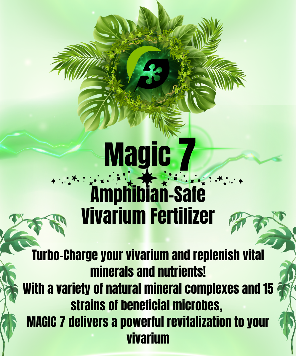 The Magic 7 Soil Re-Mineralization and Re-vitalization kit is meant to solve this issue of mineral depletion by combining the best of 4 natural mineral complexes along with 15 types of beneficial fungi and bacteria, bio-char, and humic acid to create a fortified beginning substrate or to revitalize and condition old vivarium soils. These 7 soil amendments are derived from nature and add the same benefits of soils naturally found in the remains of ancient deep marine deposits, tundras, volcanic slopes, and prehistoric swamps.