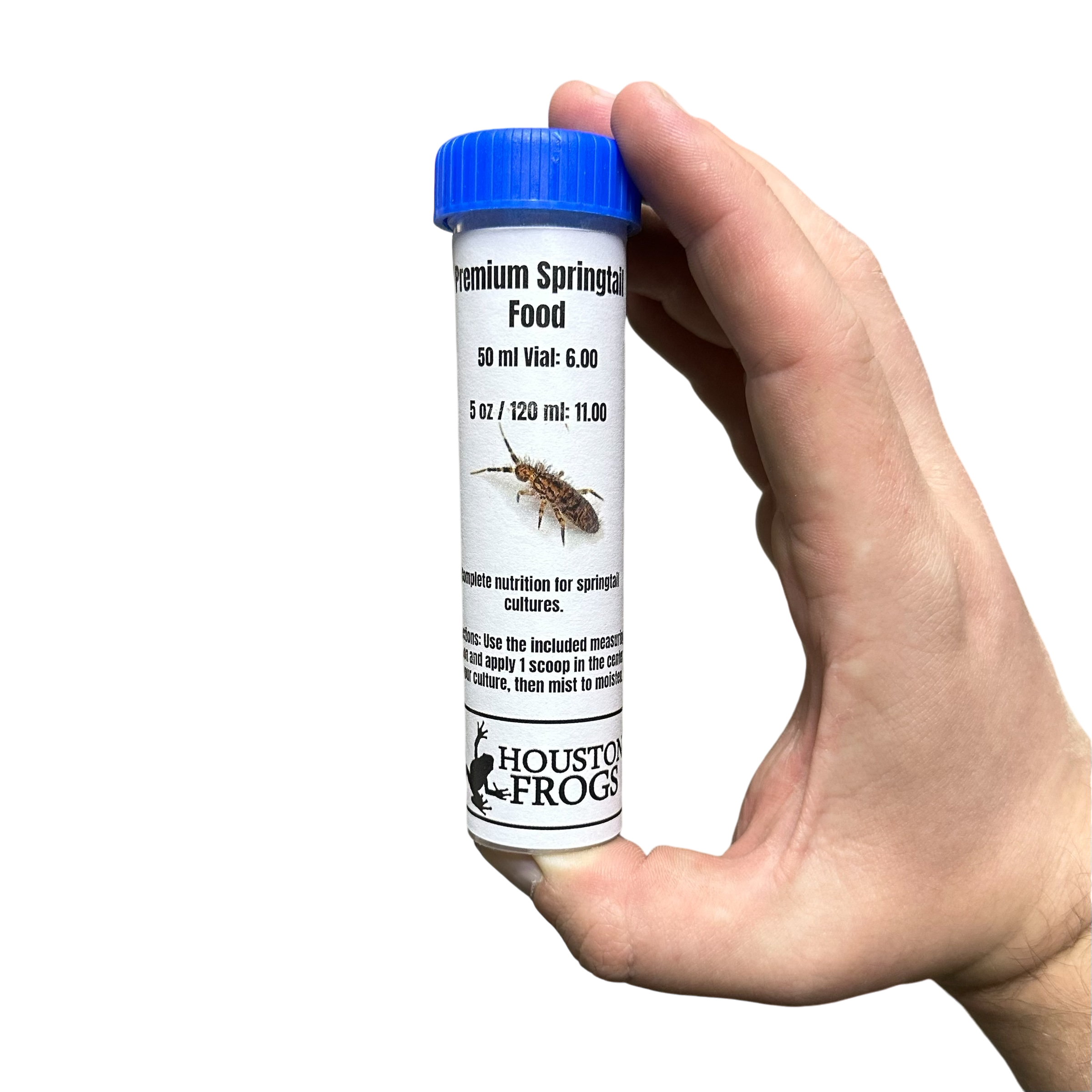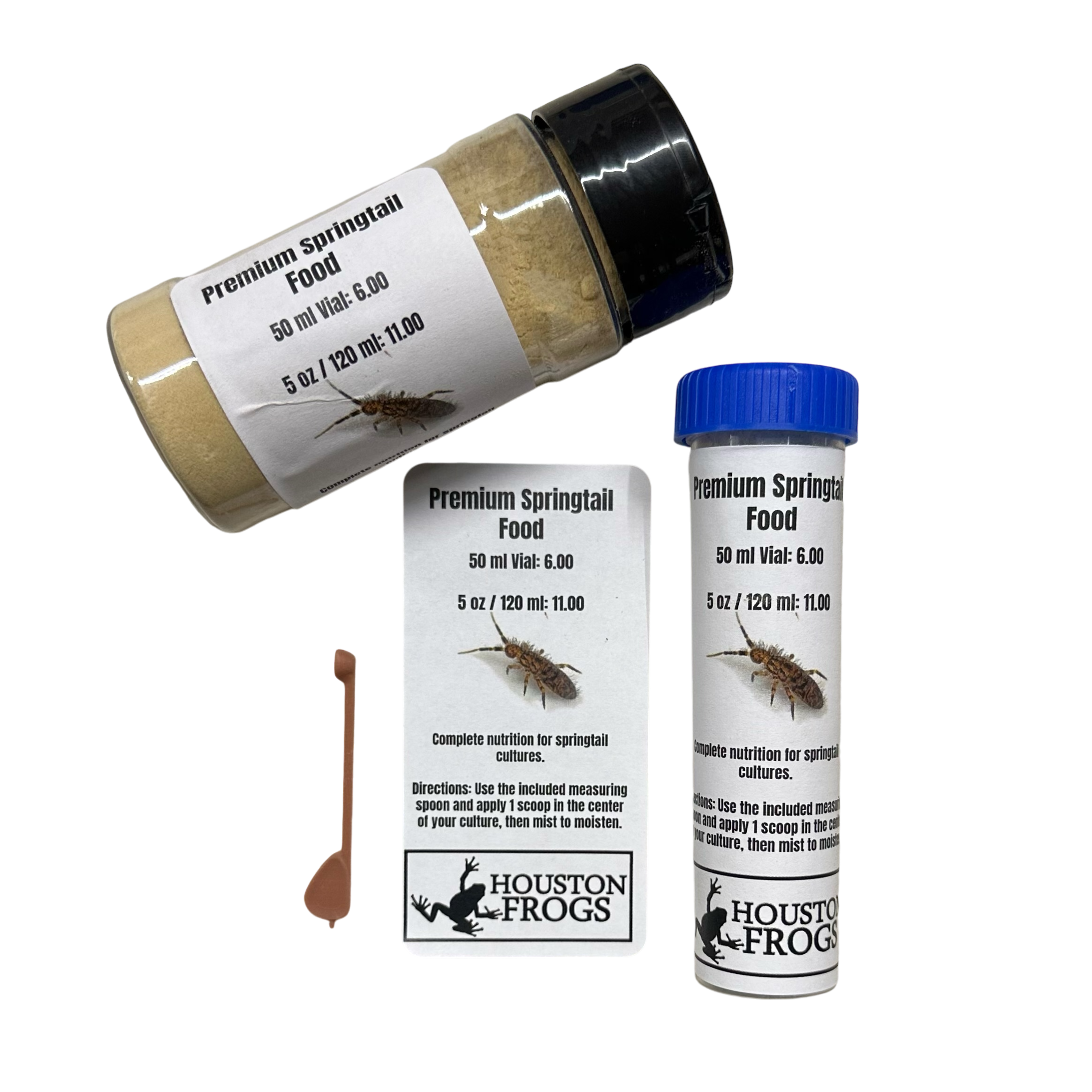 Our springtail food was formulated for maximum production of most terrestrial springtails. Simply use the included spoon to put a small pile in the center of your culture, then lightly mist to moisten the food. 1 scoop is meant to feed 1 8oz culture. Use more food for larger master cultures. Feed again once most food is consumed. Pair with our springtail chocolate and vented culturing containers for optimal production.