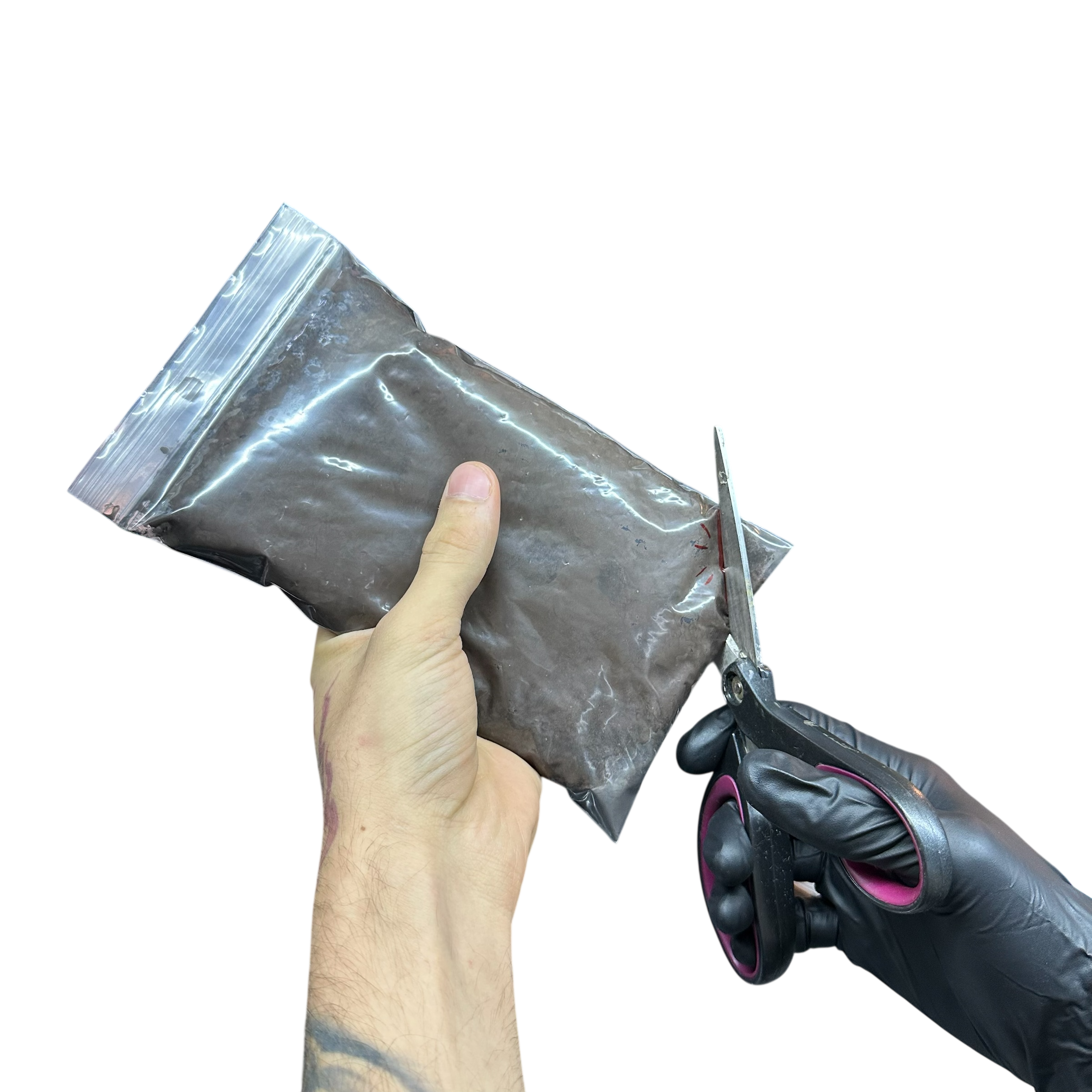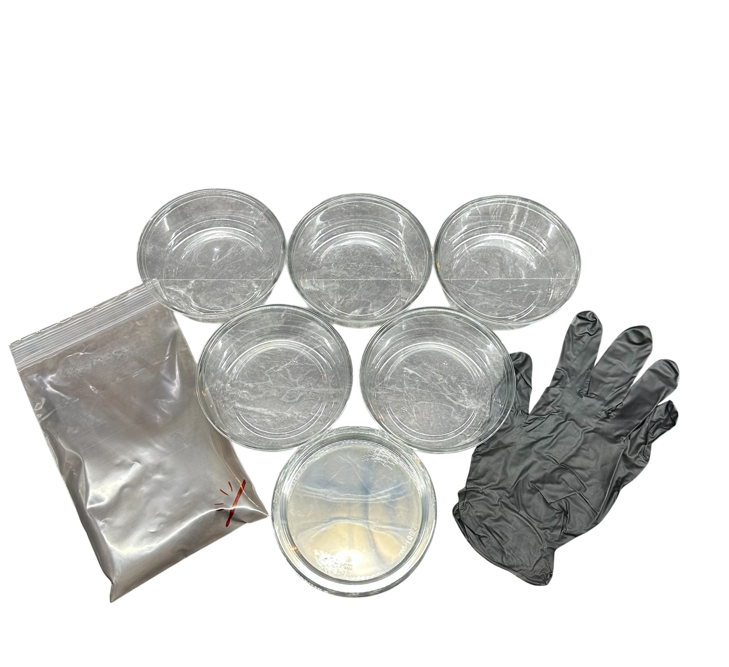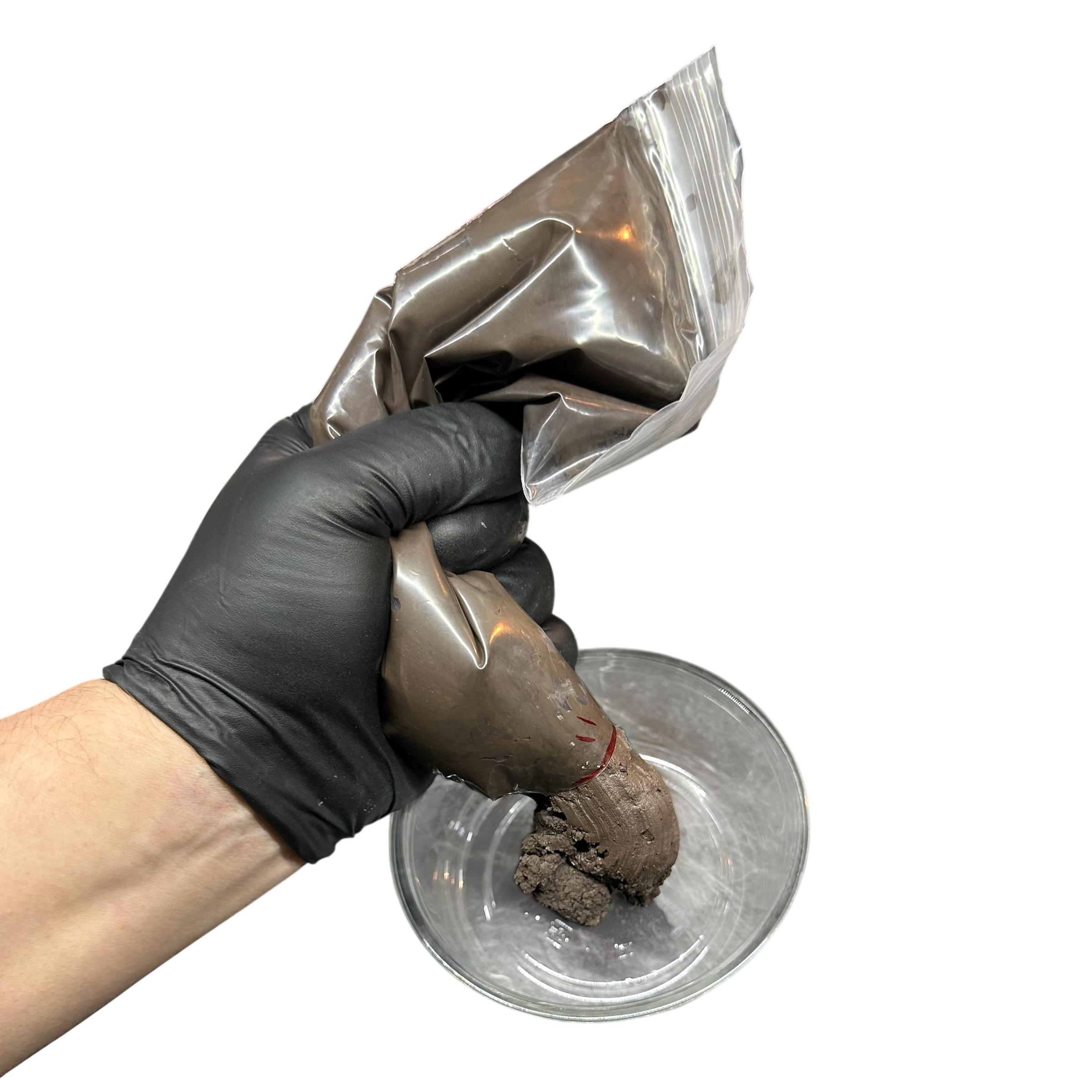 Picture 2: Picture of a preparation of your springtail chocolate if you ordered the 5 count. Note that you will ONLY receive the clay bag and the glove. Cups and lids are sold in our kit, and are square snap cups, not circular.
