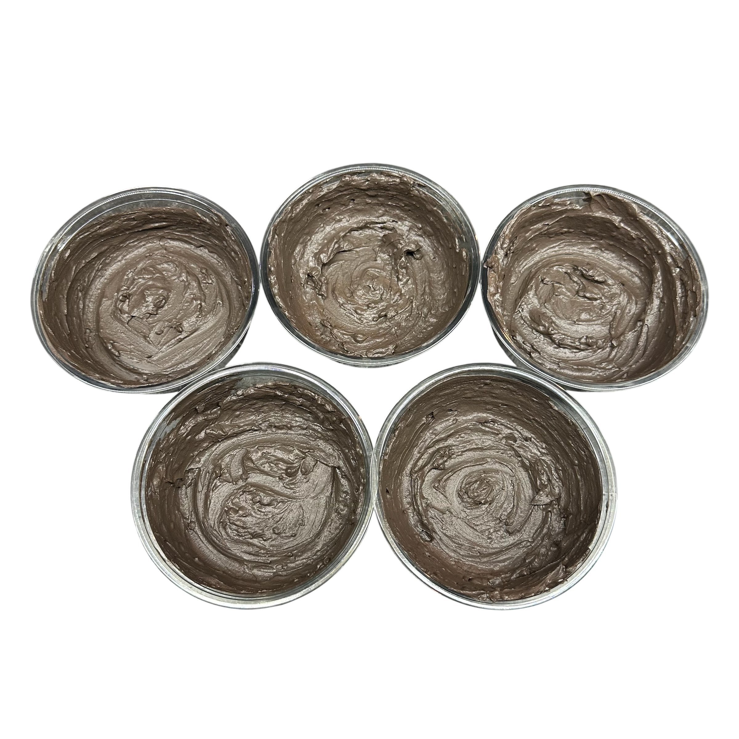 Picture 6: Evenly distribute clay (looks great, right - haha) into each of your 5 cups. Each bag makes a 5 count of springtail cups. Using your gloved hand or a spreading tool such as a wooden shim, spread clay around each cup.