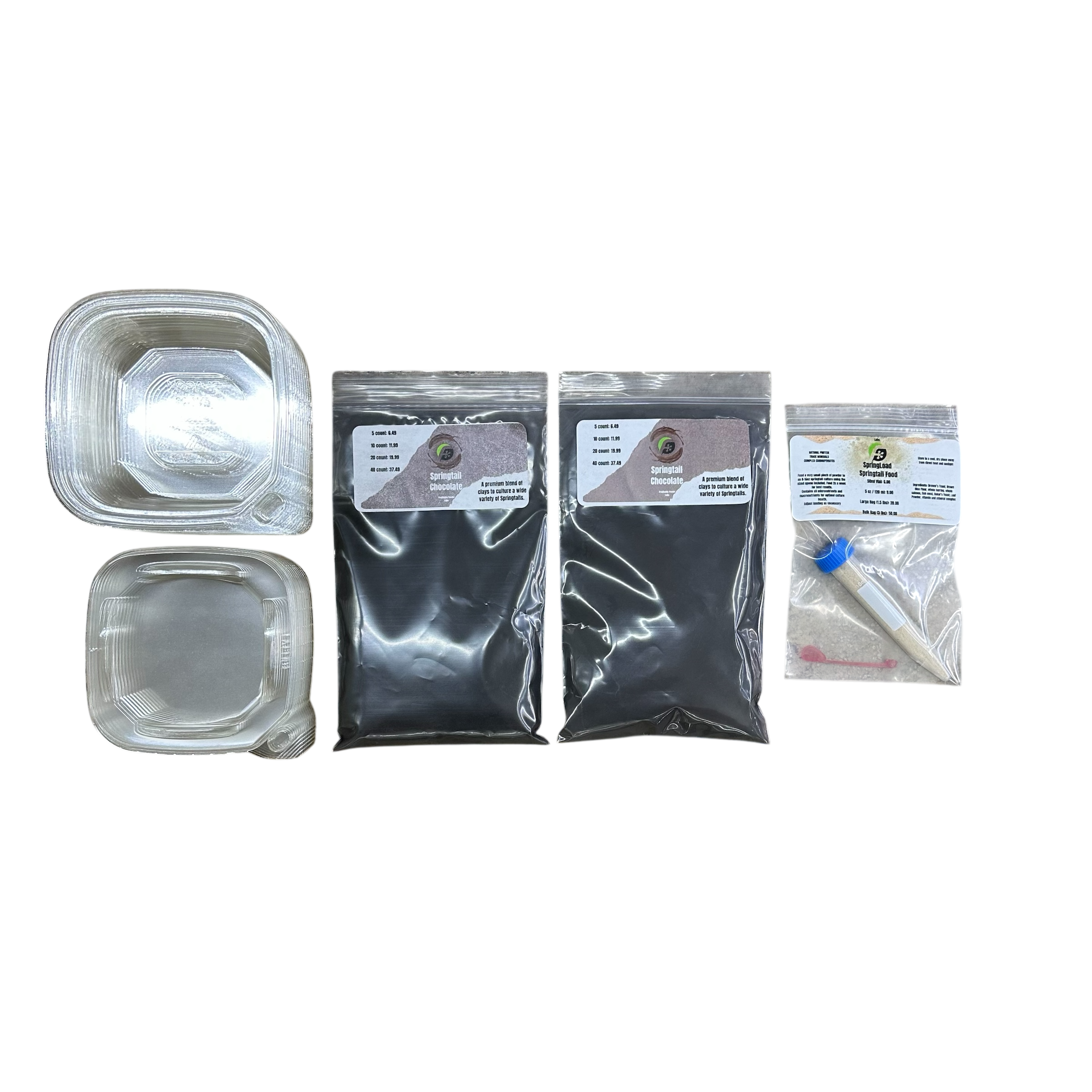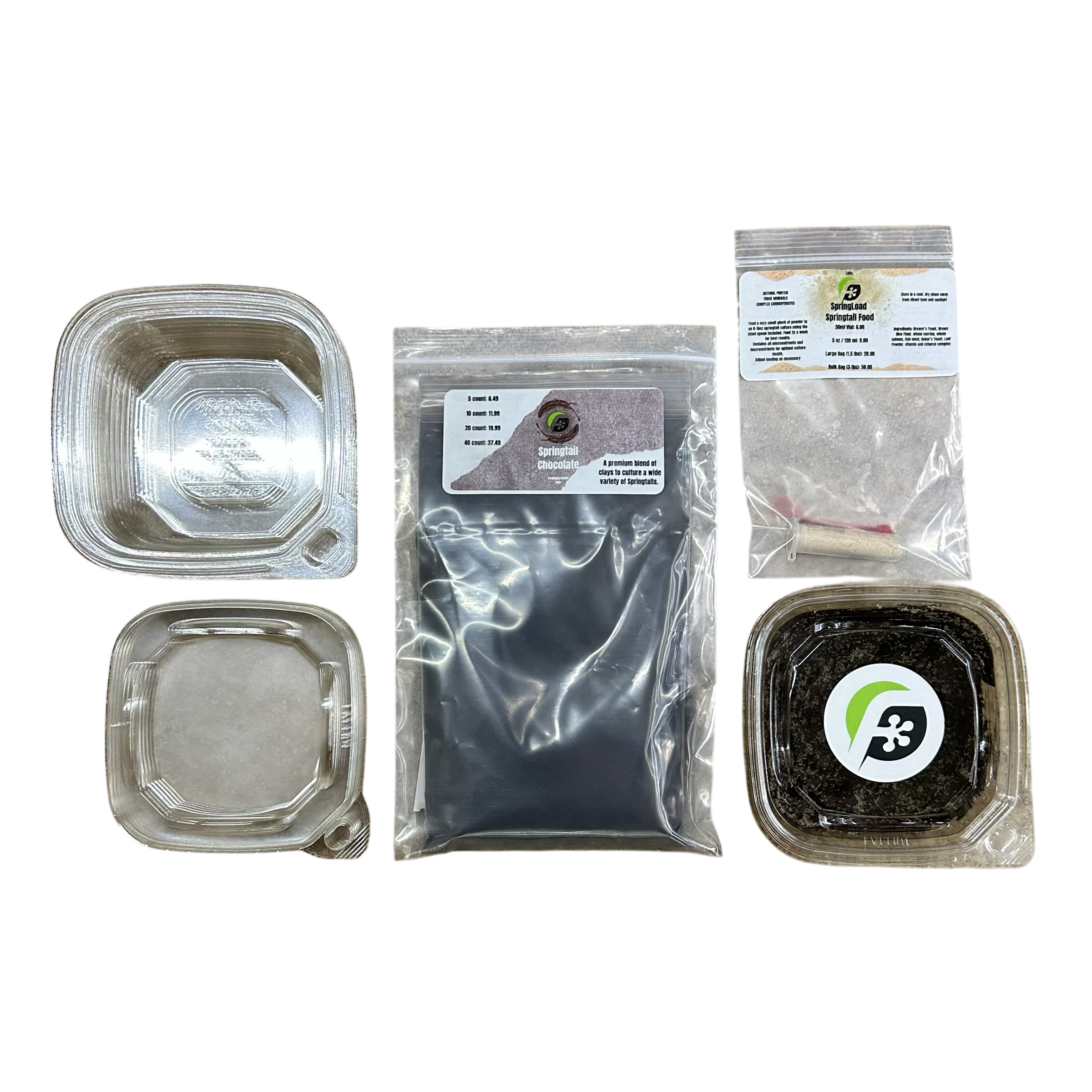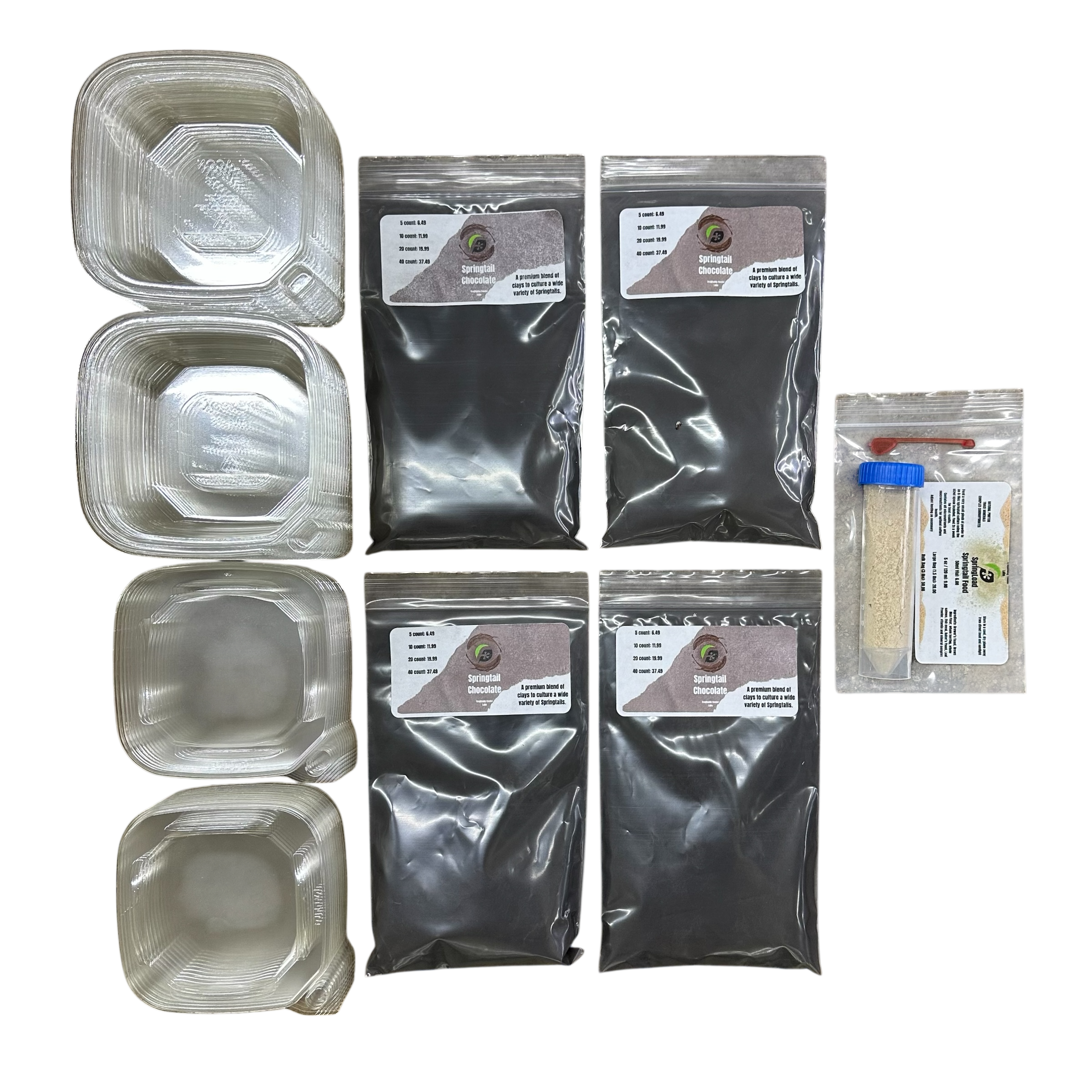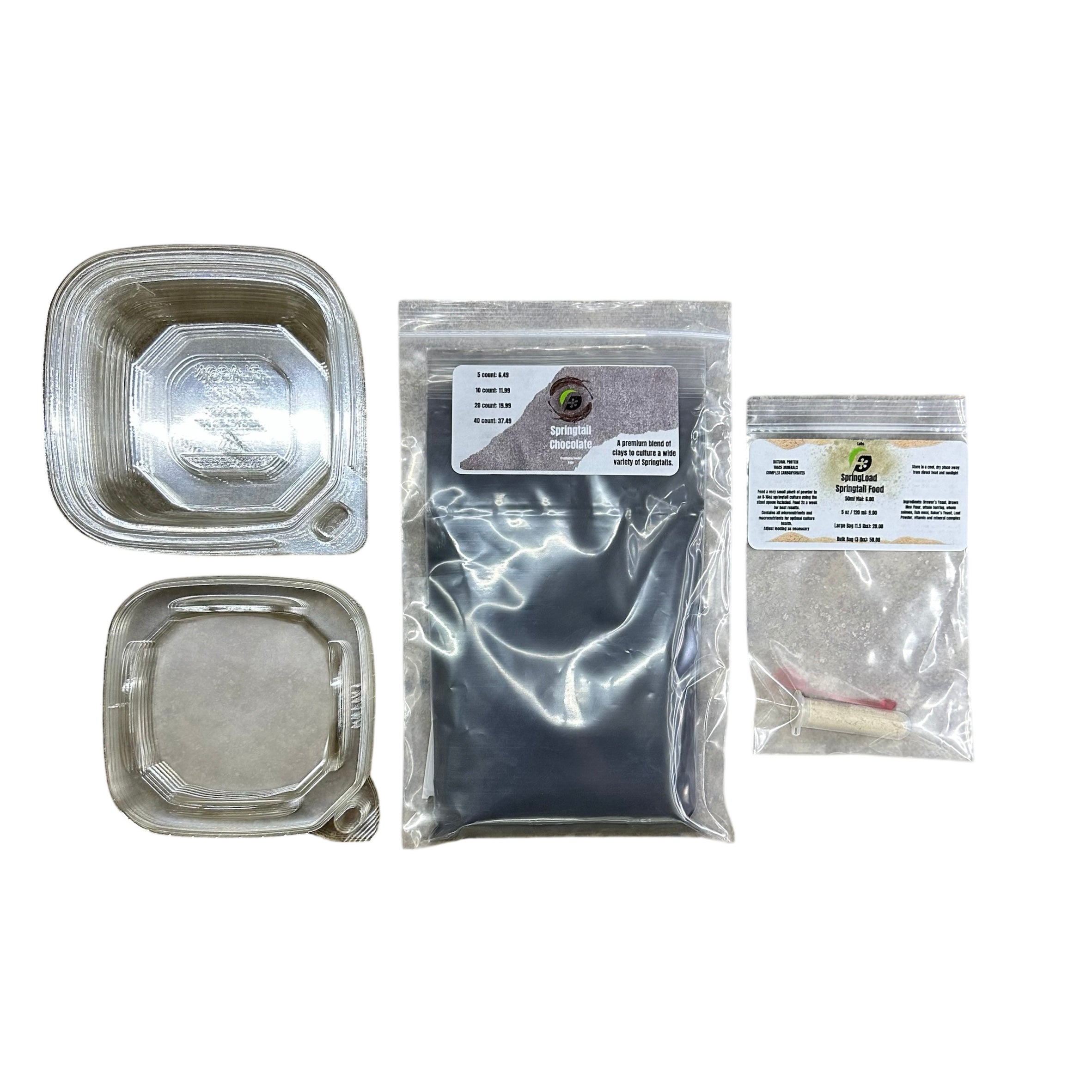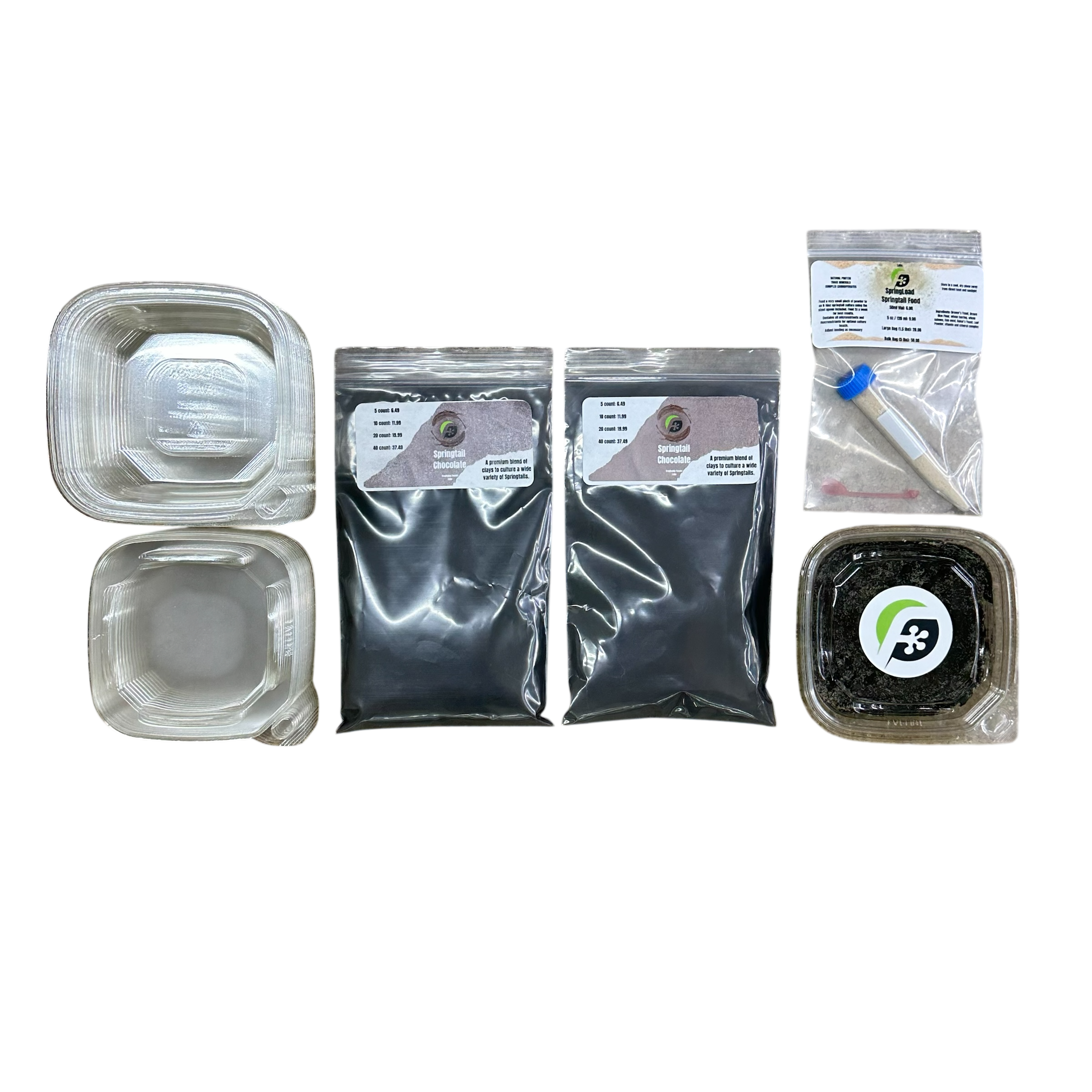 - Live Springtail Clay Culture (1 culture for 5 count kit, 1 culture for 10 count kit, 2 cultures for 20 count kit, 4 cultures for 40 count kit).